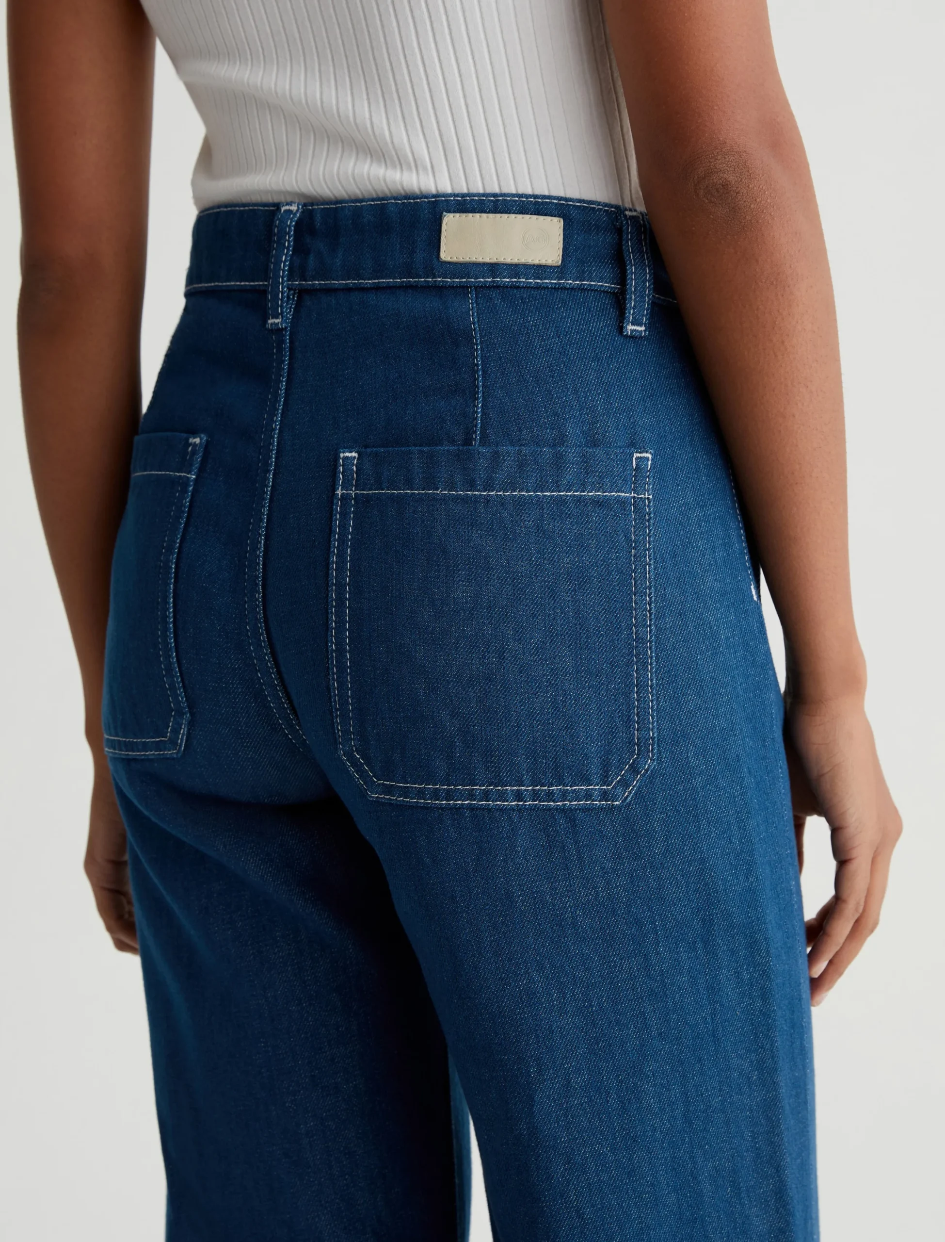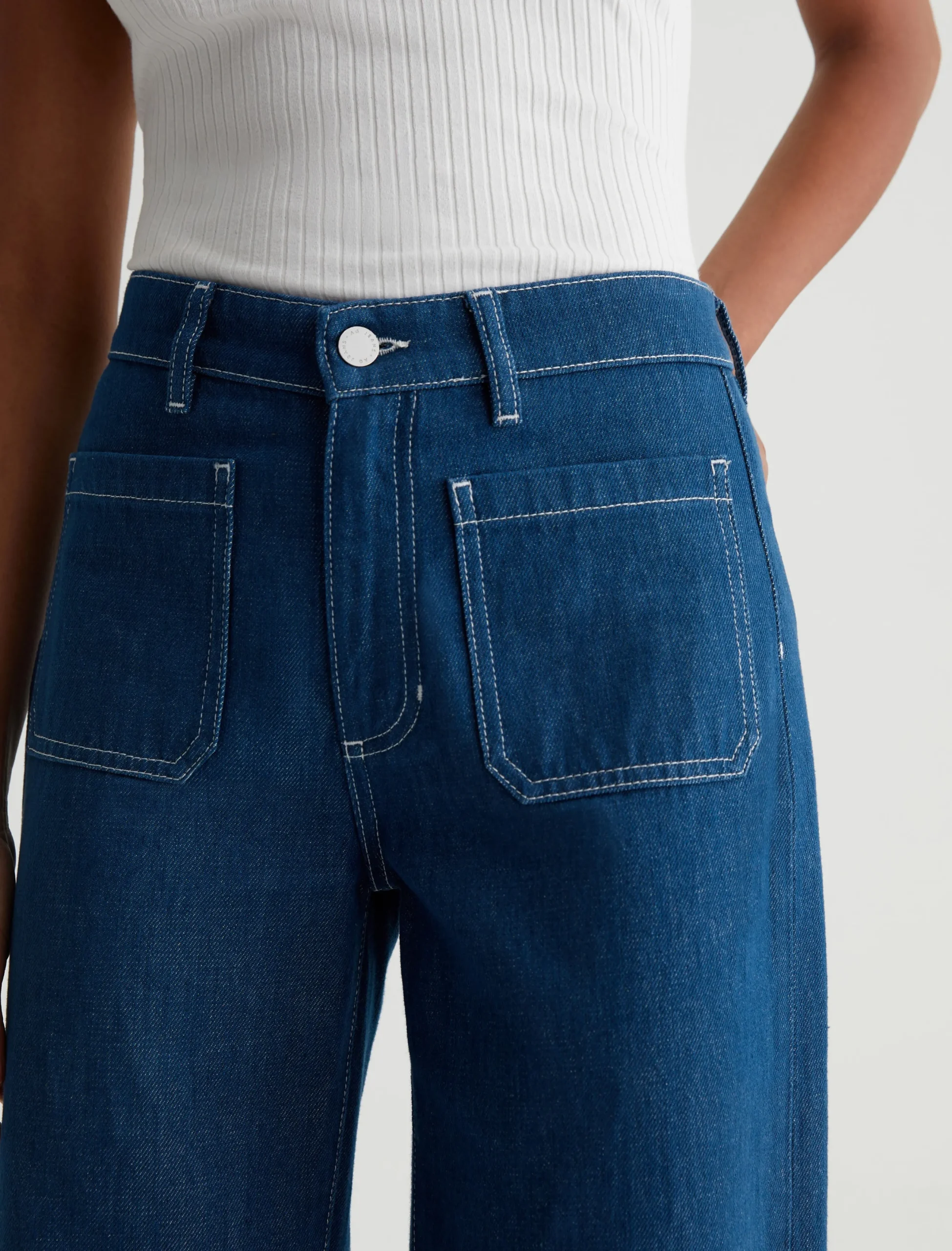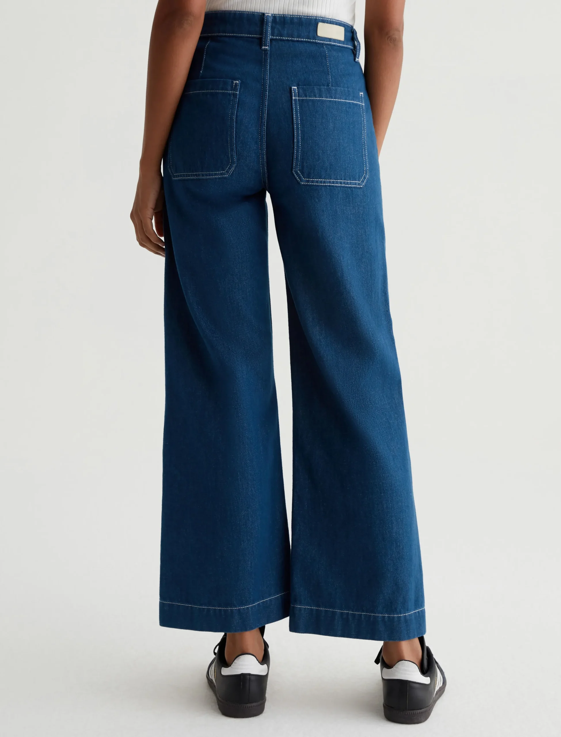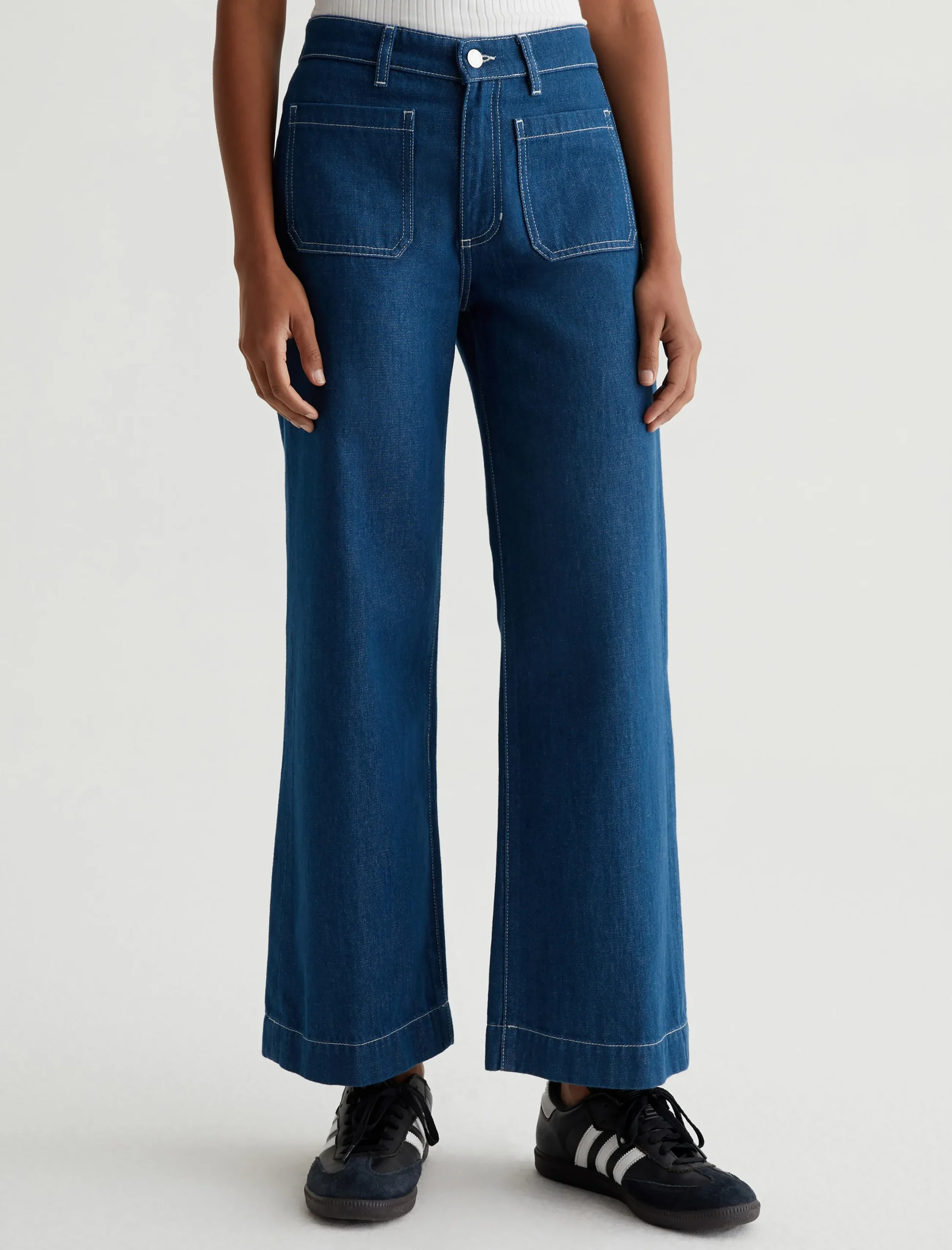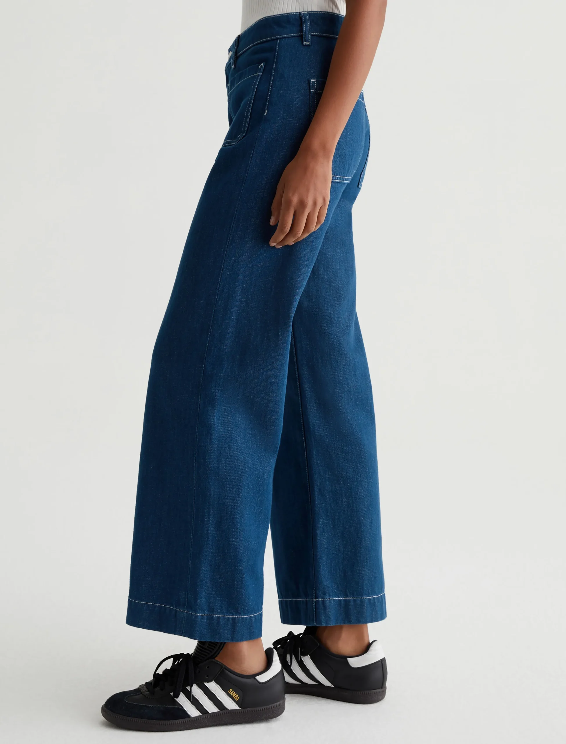 Kassie is a high-rise wide leg crop with utility inspired patch pockets. Crafted from 11.75 Vintage Crosshatch Denim, these jeans come in a medium blue wash accented with white topstitching to underscore the workwear influence.