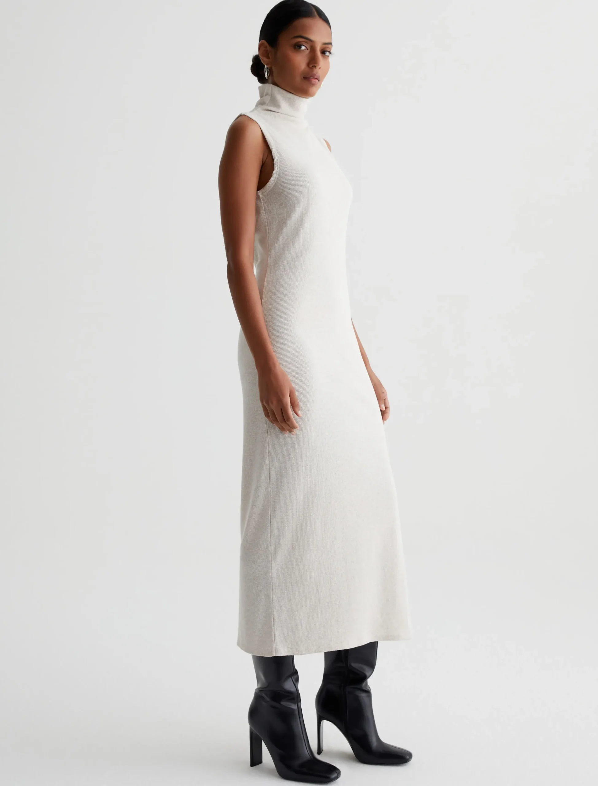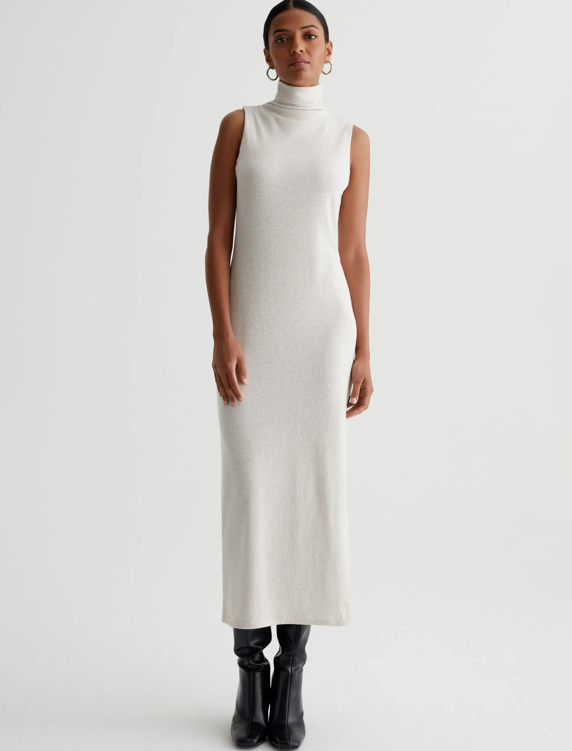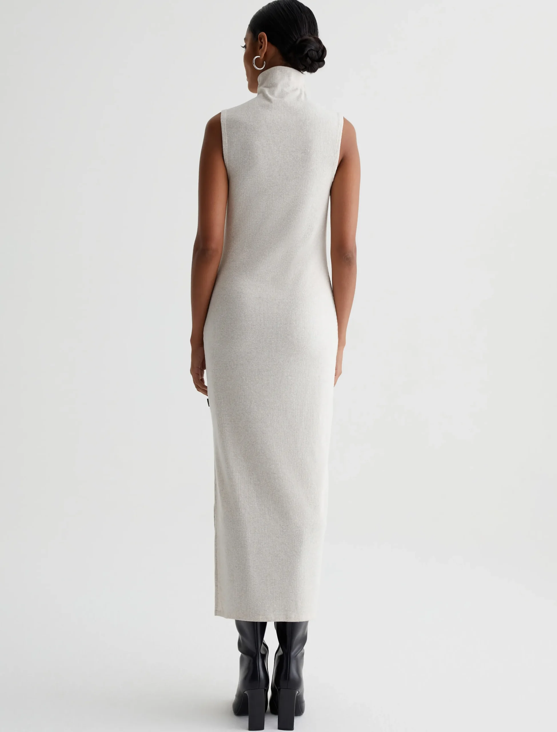 Crafted from a mélange rib knit in heathered off-white, our Kizza Dress has a sleeveless turtleneck silhouette with an alluring side slit. The minimalist style fits comfortably close to the body and falls to a shin-skimming hem. A simple, flattering style to wear with sneakers or dress up with a pair of heels.