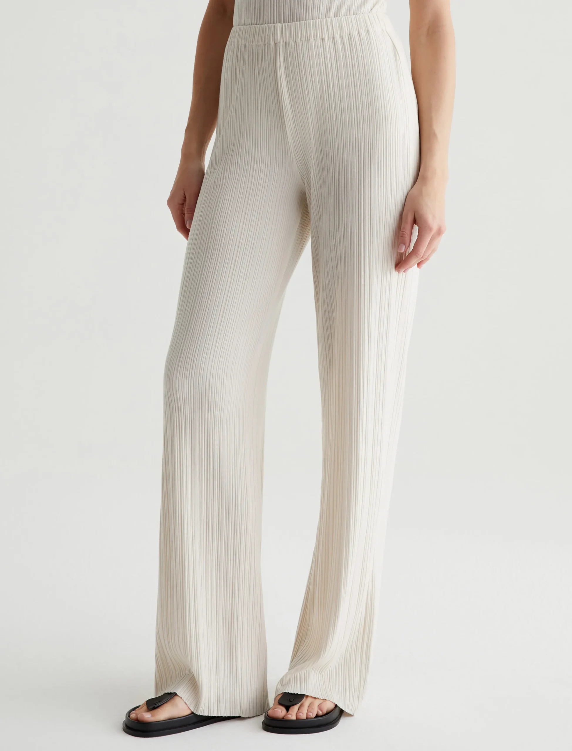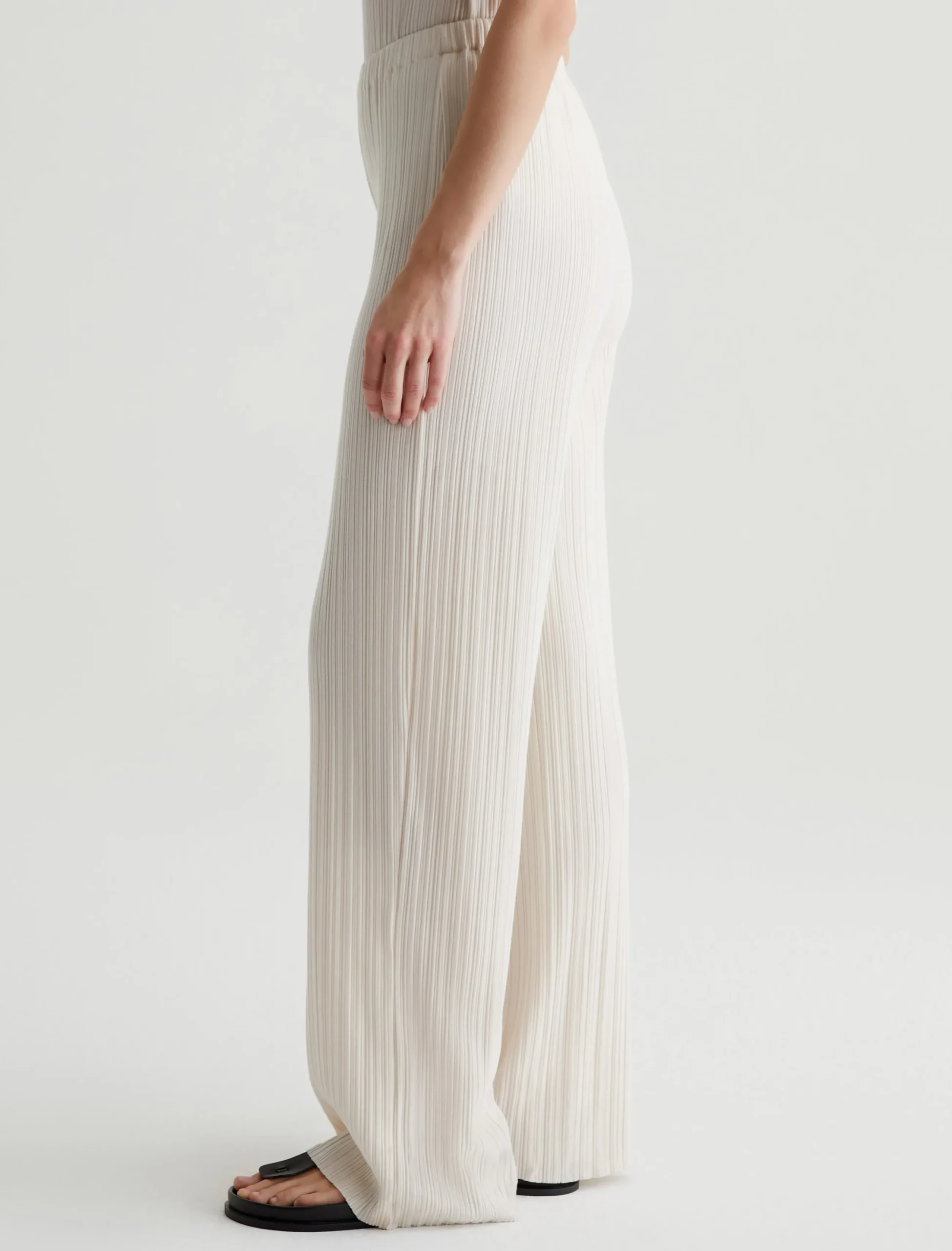 The Koda wide-leg knit pants in white look elegant and feel effortless. Lightweight and soft in a variegated rib knit, this comfortable pull-on style features a high waist and a relaxed, easy shape with raw hems. Style it as a set with our matching sleeveless top or pair it with an oversized button-up shirt to wear it from work to weekend.
