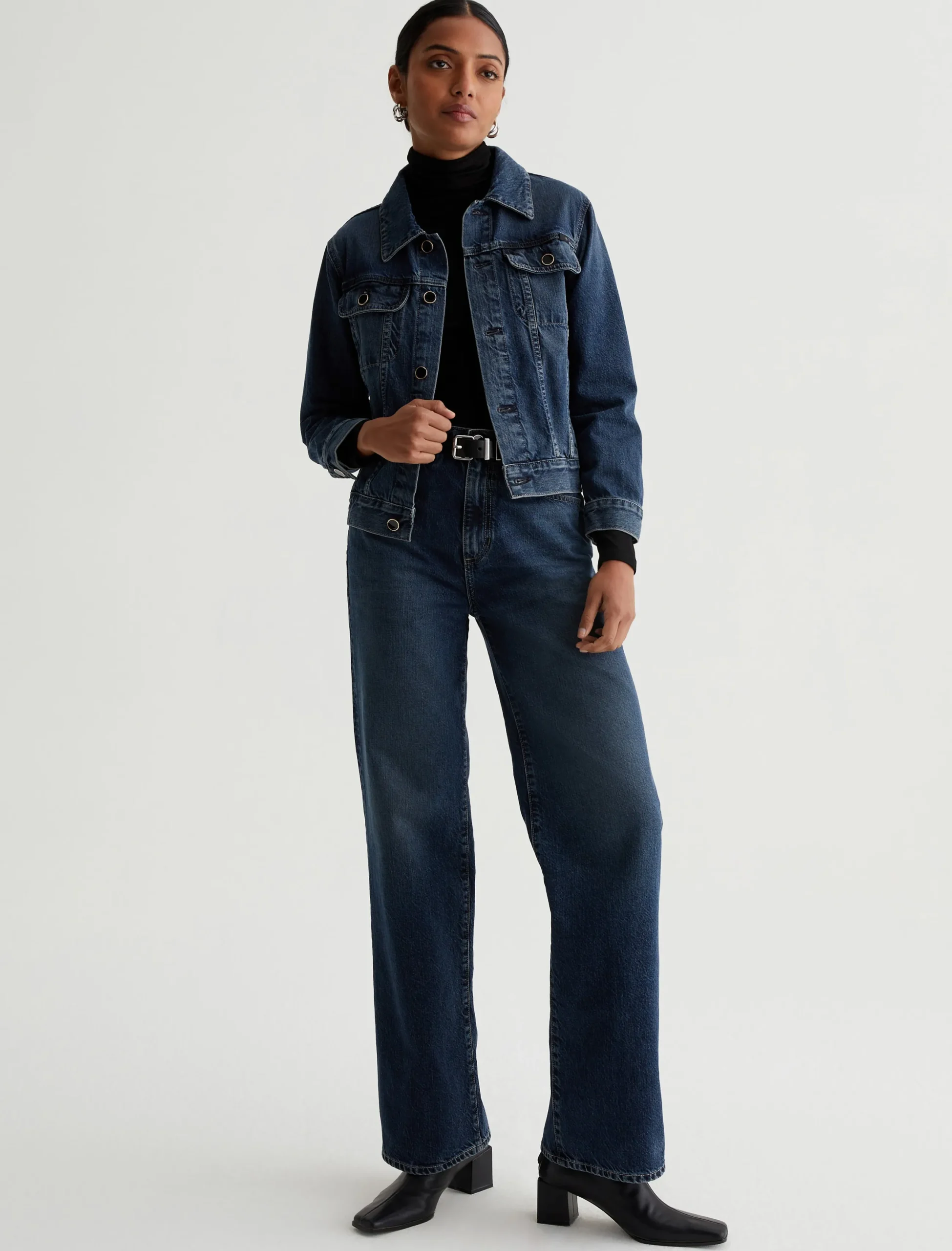 Our Kora wide-leg jeans are elevated by a sophisticated dark blue wash and a gold button with black lacquer fill. Featuring a high waist and a loose fit through the legs, this pair is crafted from rigid 11.75 oz. Legion Denim. Add our Juno shrunken trucker jacket on top for a dressed-up denim ensemble that works equally well for day or night.