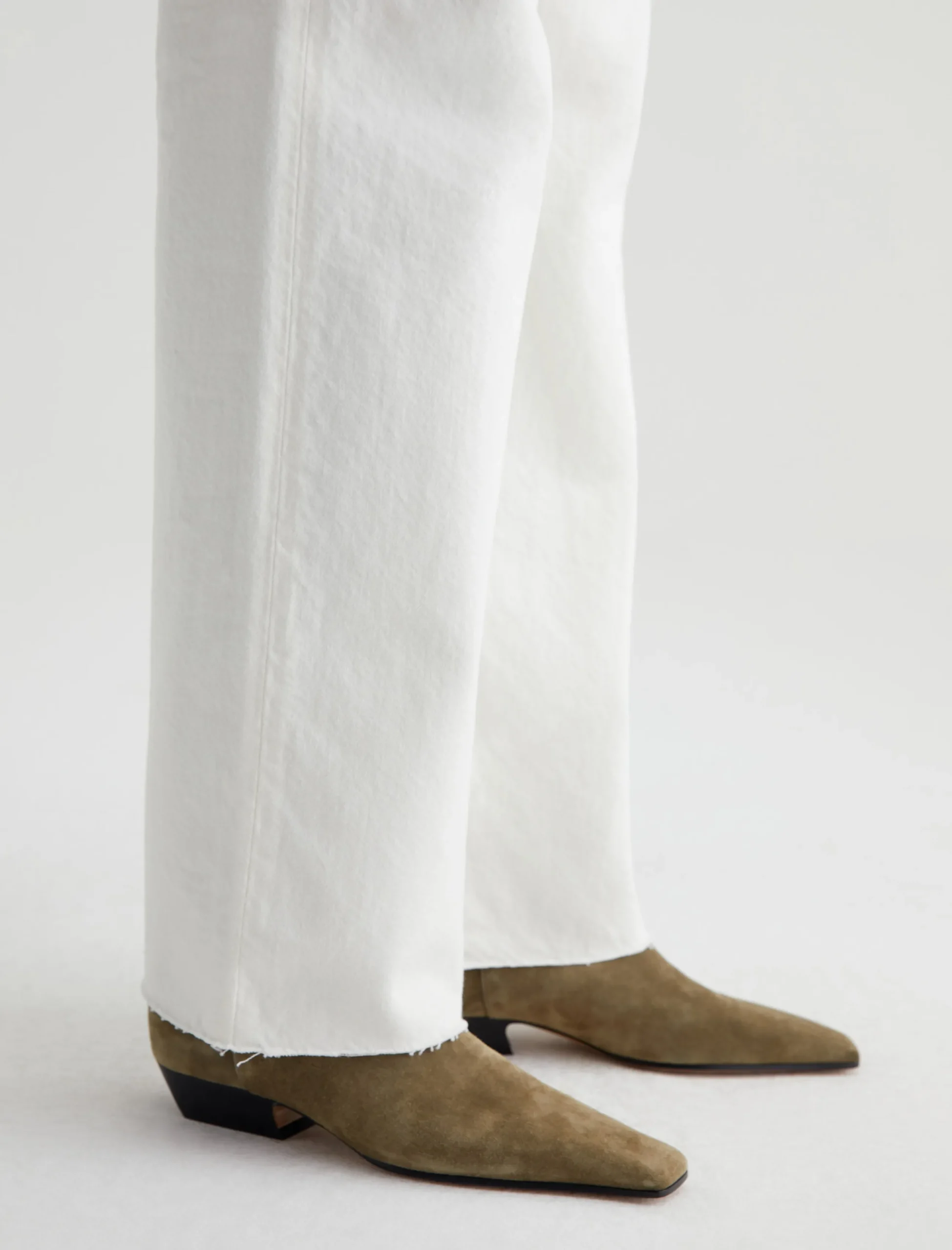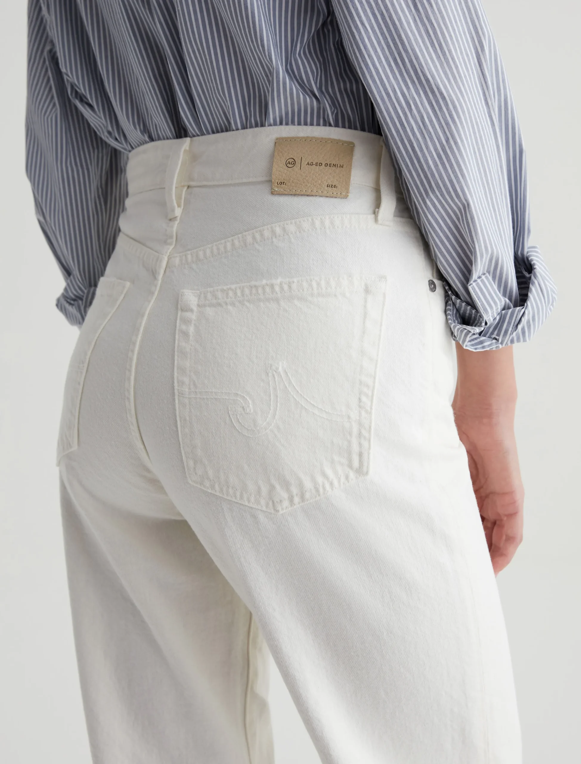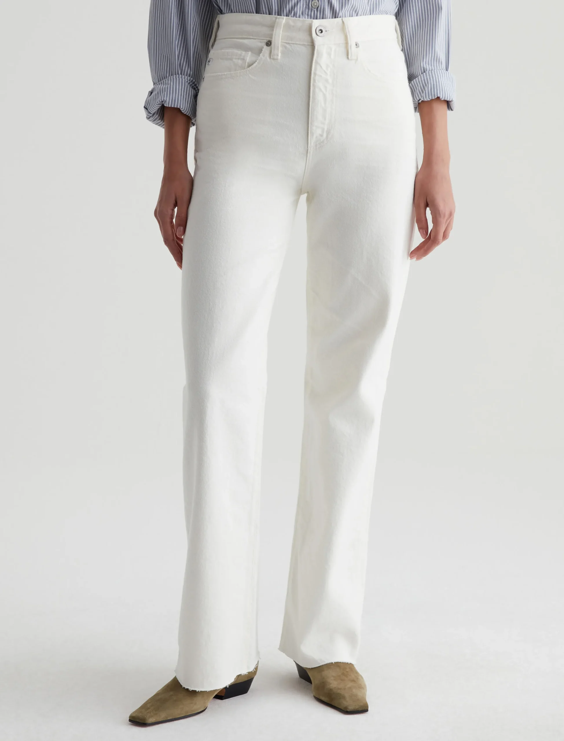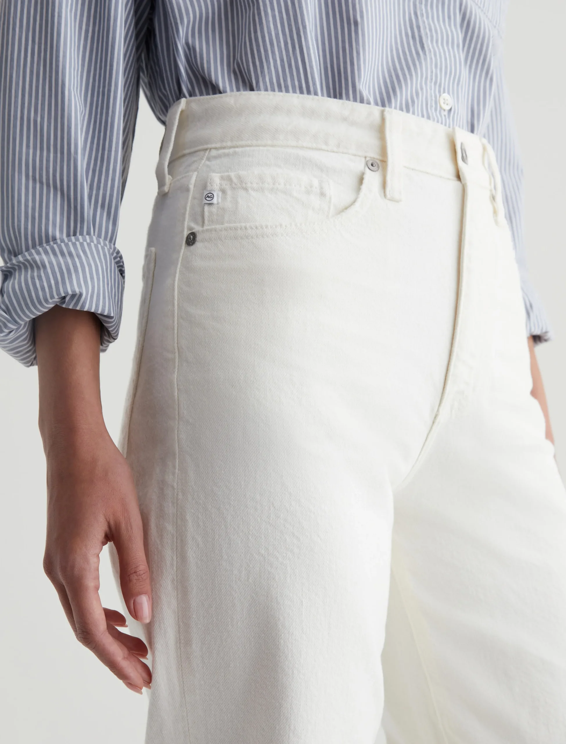 Our Kora wide-leg jeans in powder white have an ultra-high rise and a loose, easy fit through the legs. This pair is cut from 11.75 oz. Soft Pure Denim in 100% cotton. Subtle hits of distressing accent the classic five-pocket construction to emulate one year of authentic wear.
