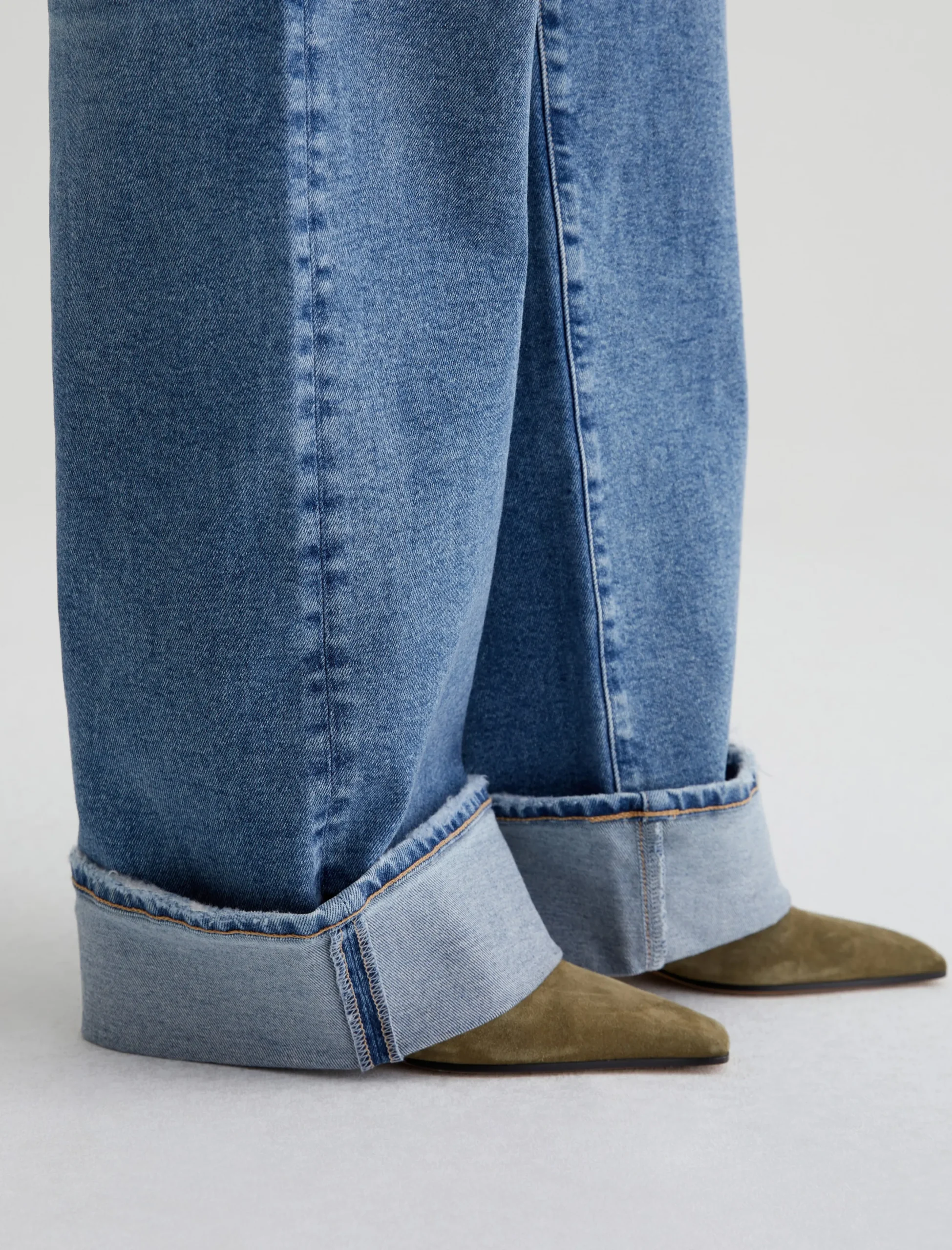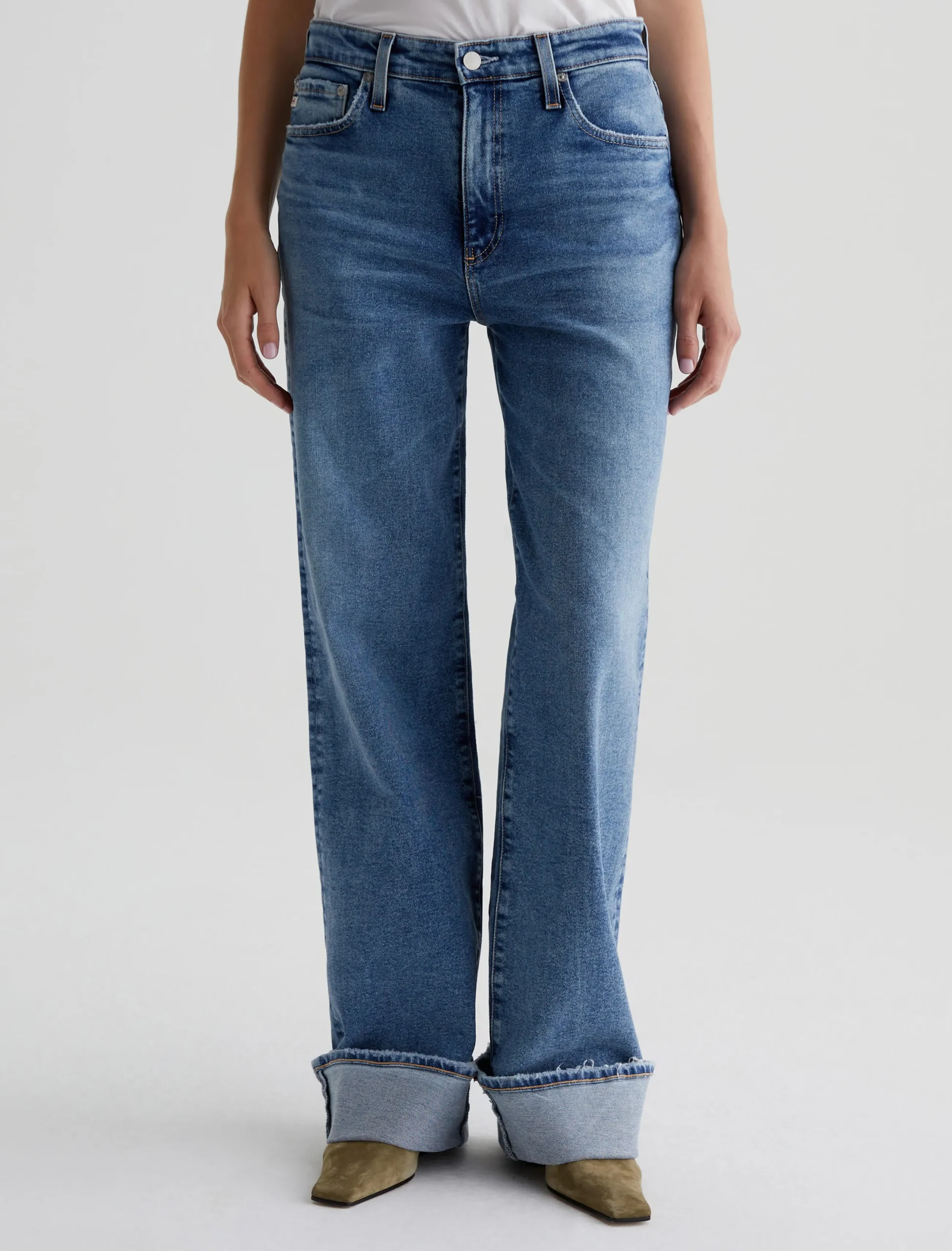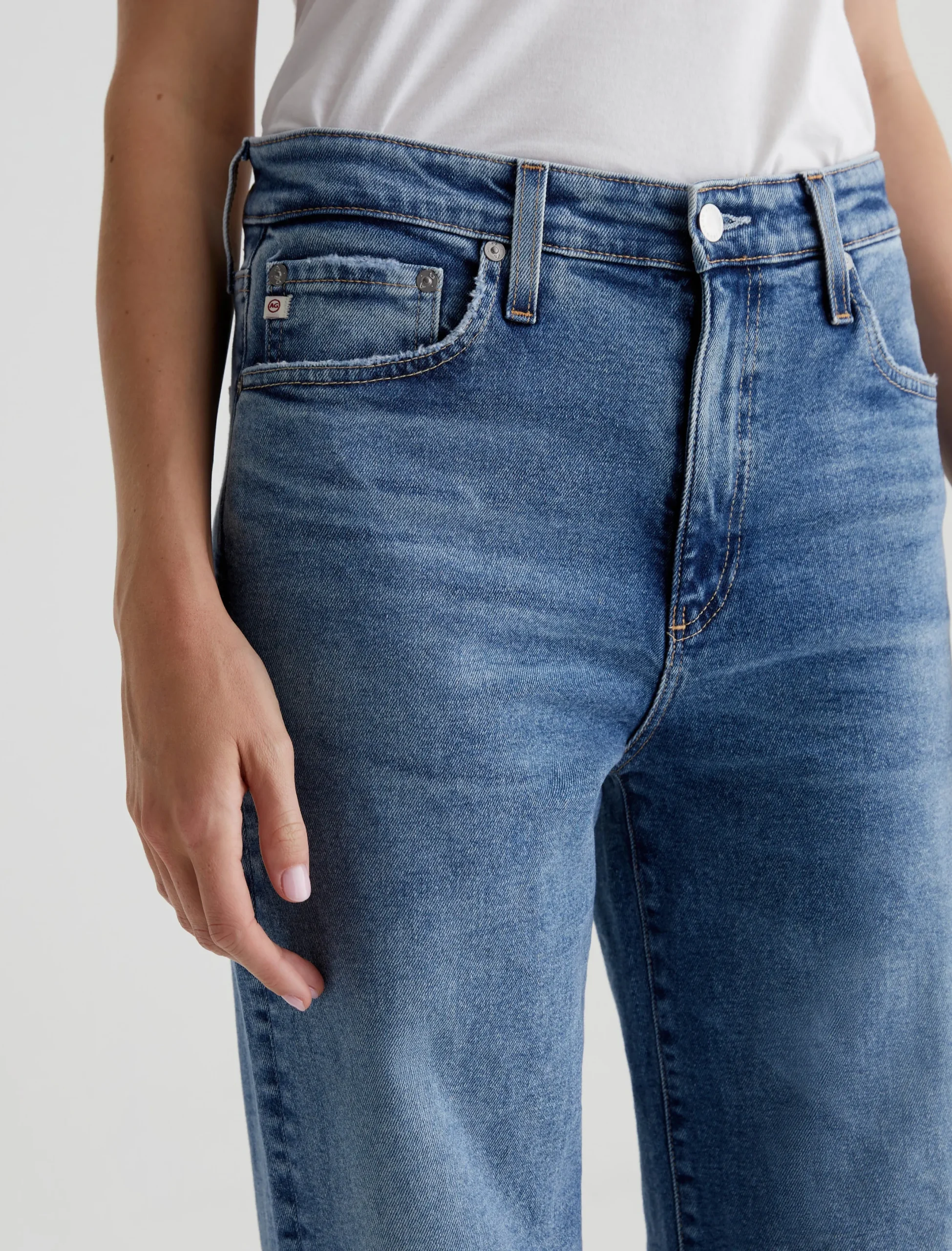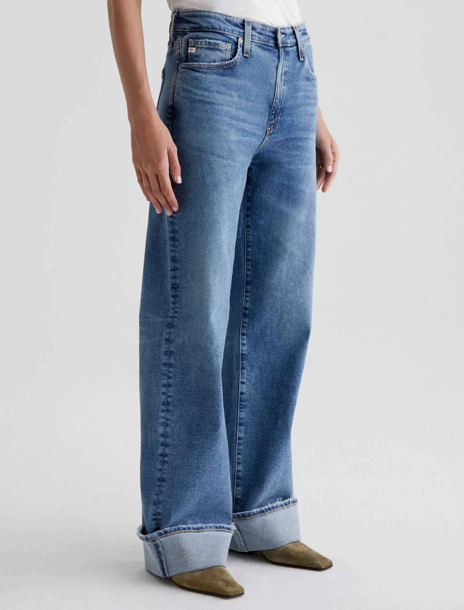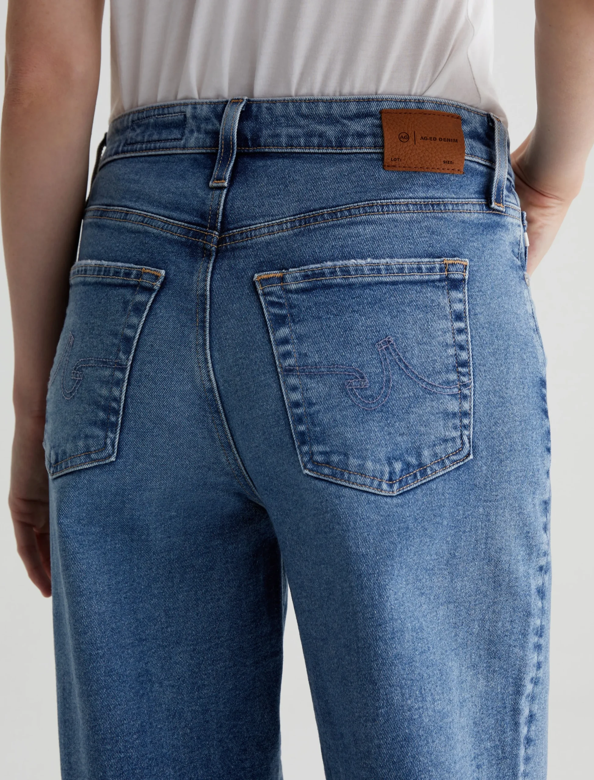 Our Kora wide-leg jeans have an ultra-high rise and a loose, easy fit in an longer length for dramatic wide-cuff styling. This pair is crafted in 12 oz. Classic Comfort Stretch Denim from Italy. It’s done in a medium blue wash with a 17-year AG-ed™ finish featuring faded details, grinding along pocket edges, and worn hems.