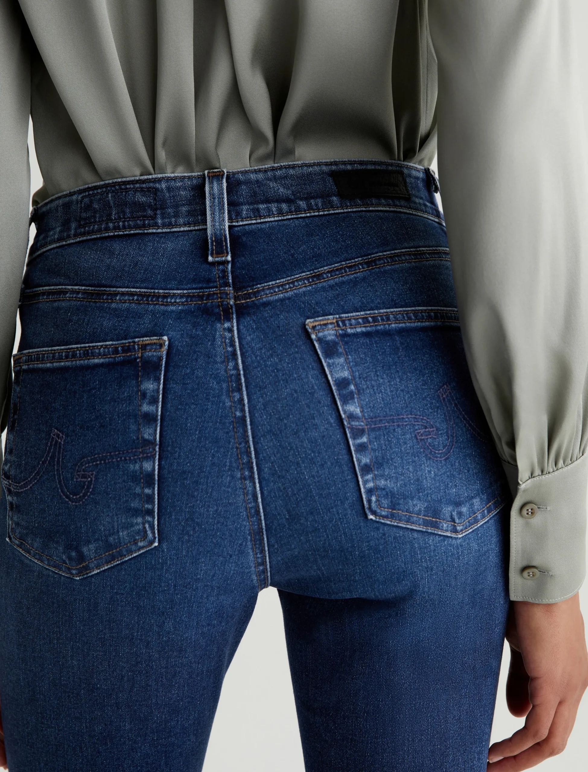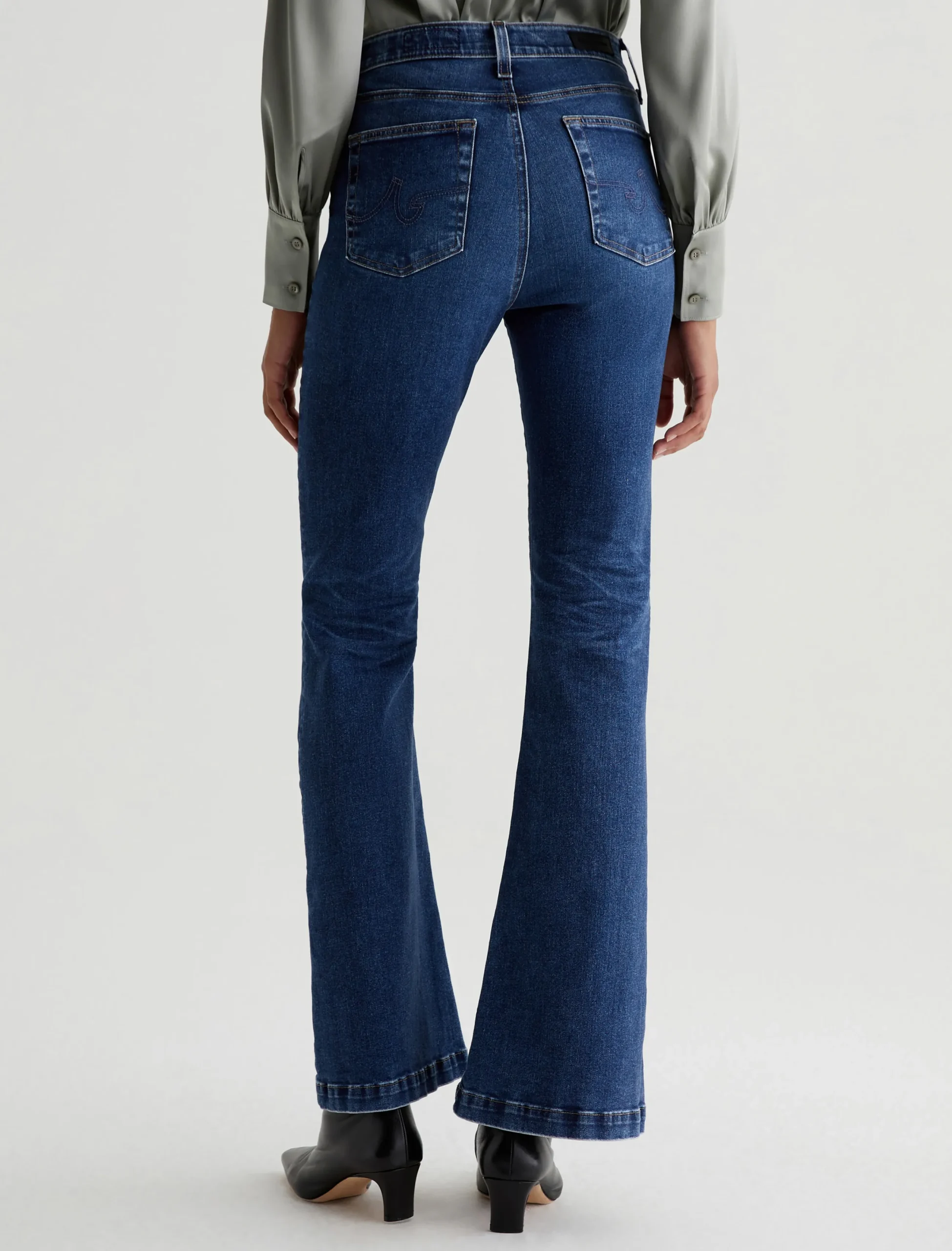 The Madi Vapor Wash jeans feature our high-rise flare in a 10-year AG-ed™ dark-blue wash that’s been achieved using our eco-friendly AG Vapor Wash™ technology. This ’70s-inspired silhouette is designed to hug the hips and elongate the legs in a curve-tracing hourglass silhouette with kicked-out hems. Crafted from 10 oz. superstretch Empower Denim from Japan, the pair offers premium comfort and advanced recovery. Our AG Vapor Wash™ process significantly reduces the use of water, chemicals, and energy to lessen environmental impact. Finished with a vegan and 100% biodegradable cellulose patch at the back waistband.