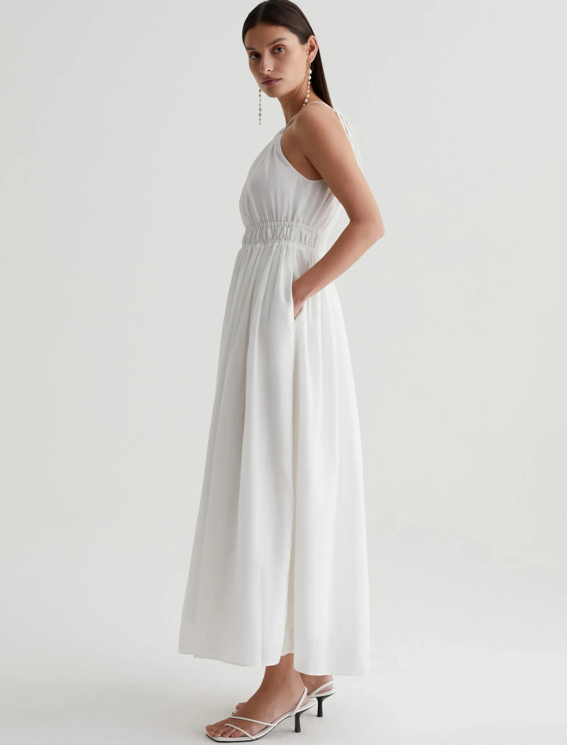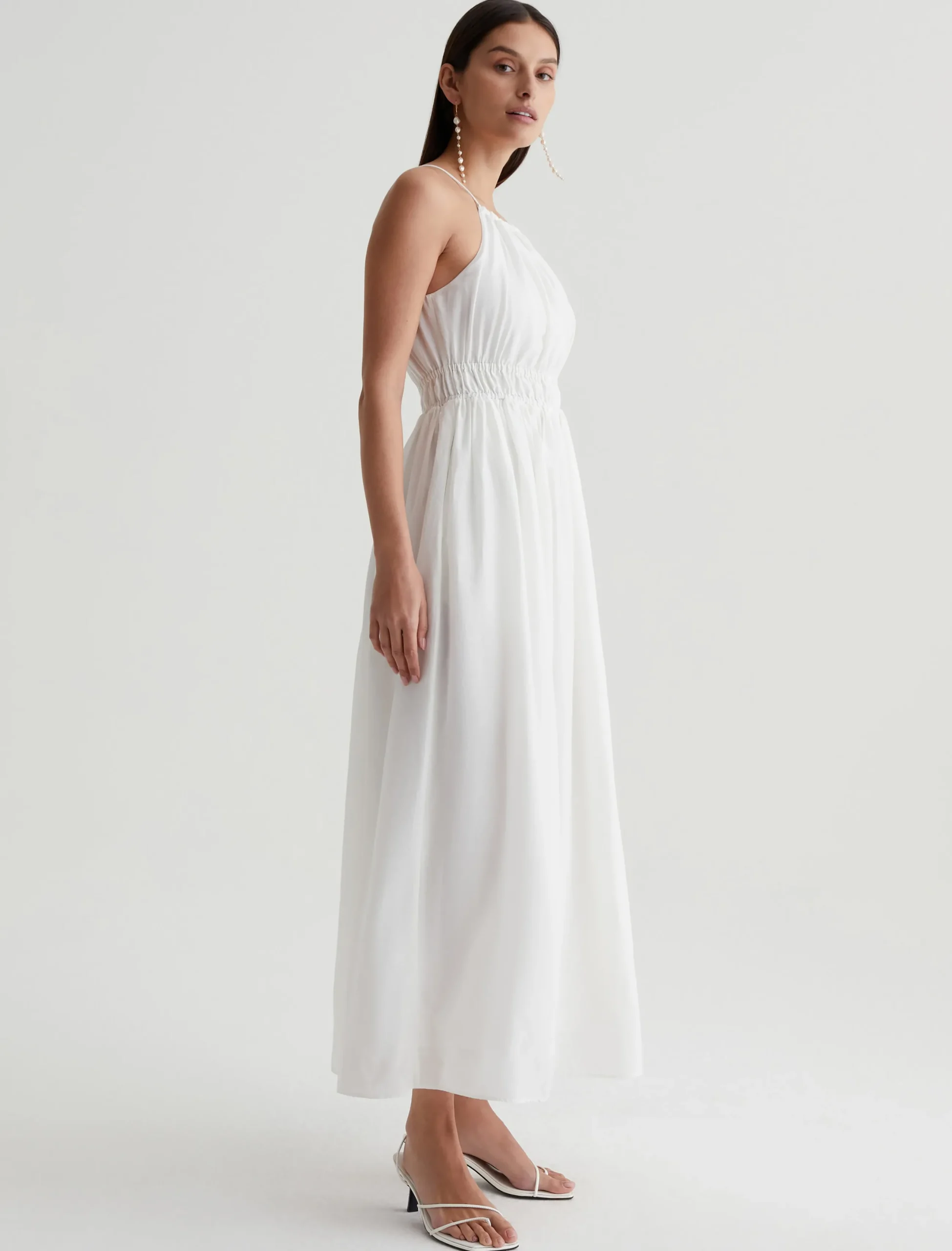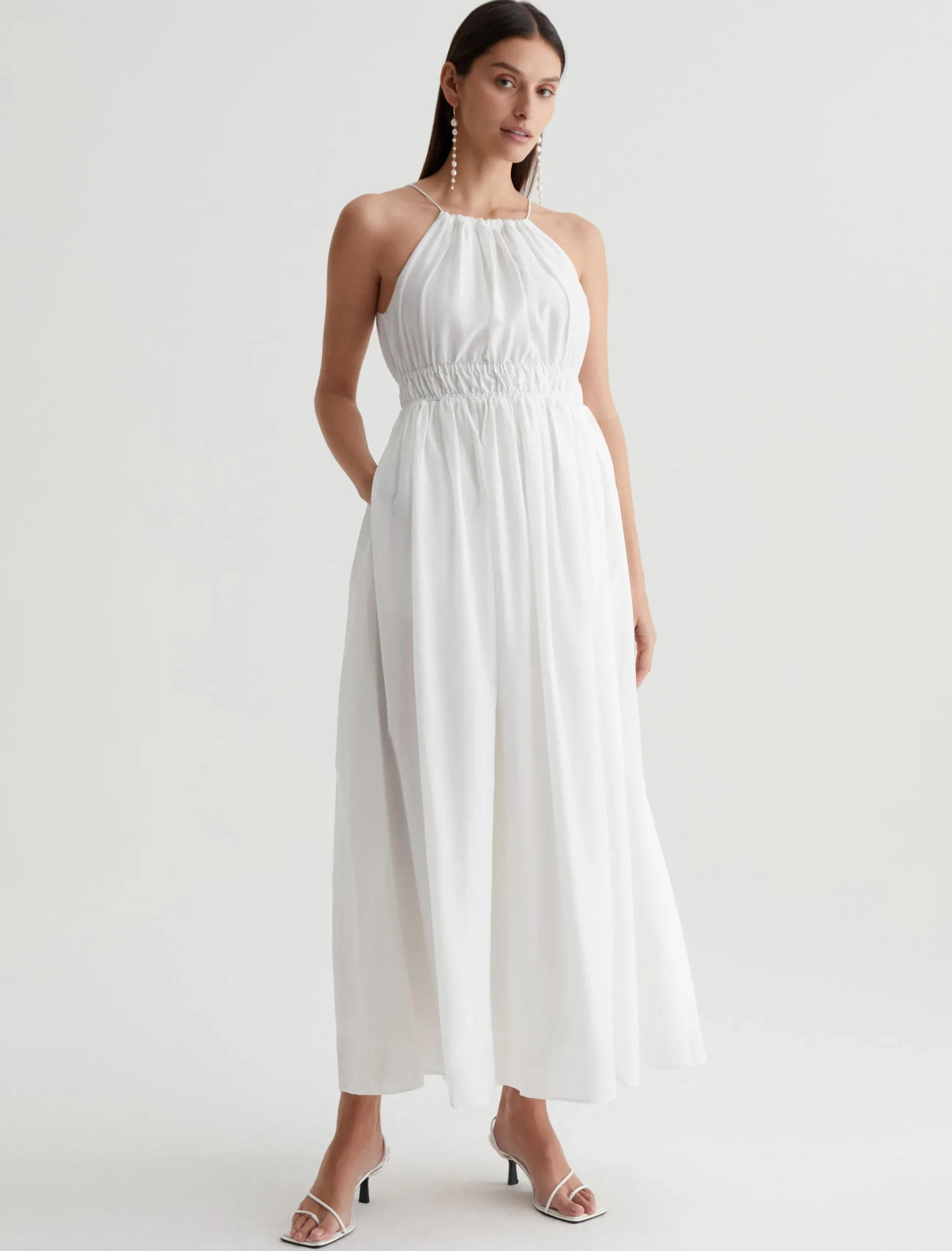 The Maelle Dress floats through the season in airy voile of cotton and silk. Flowy and feminine, this powder-white number features halter styling that’s threaded with dainty ties so you can adjust the neckline. It also has a comfortable shirred waist and hidden hip pockets before falling to a long, breezy skirt. Perfect for summer vacations, rooftop dinners, and celebratory occasions.