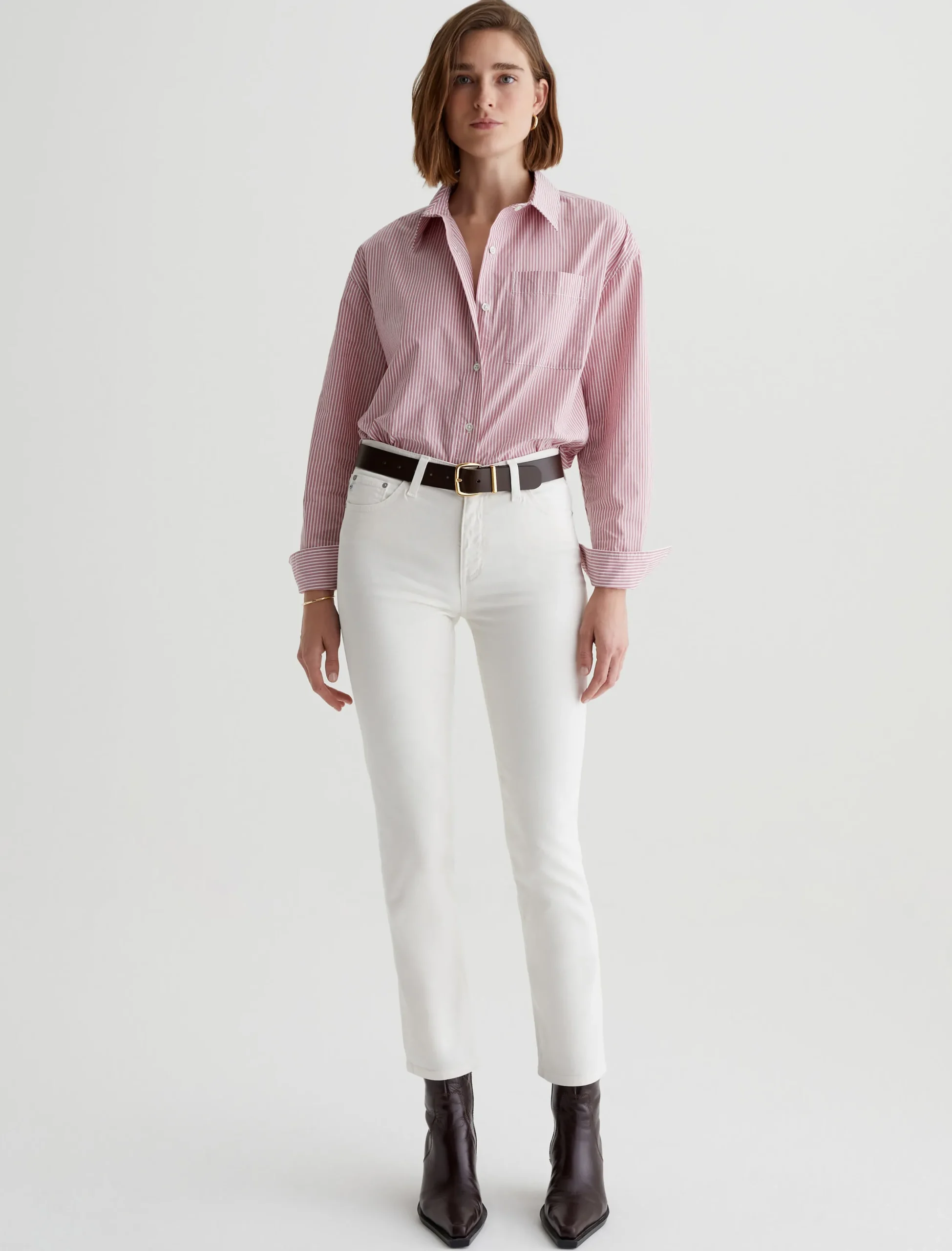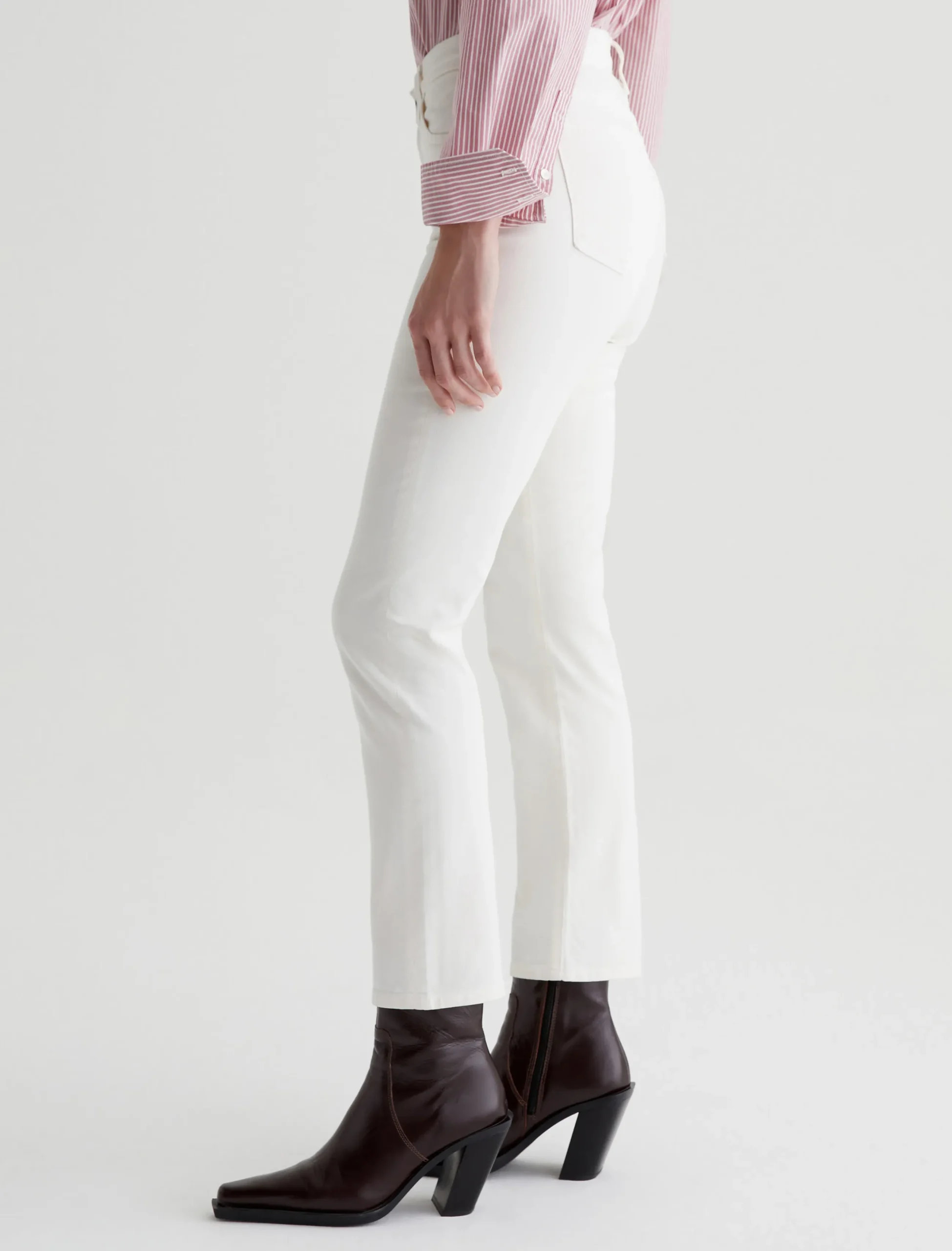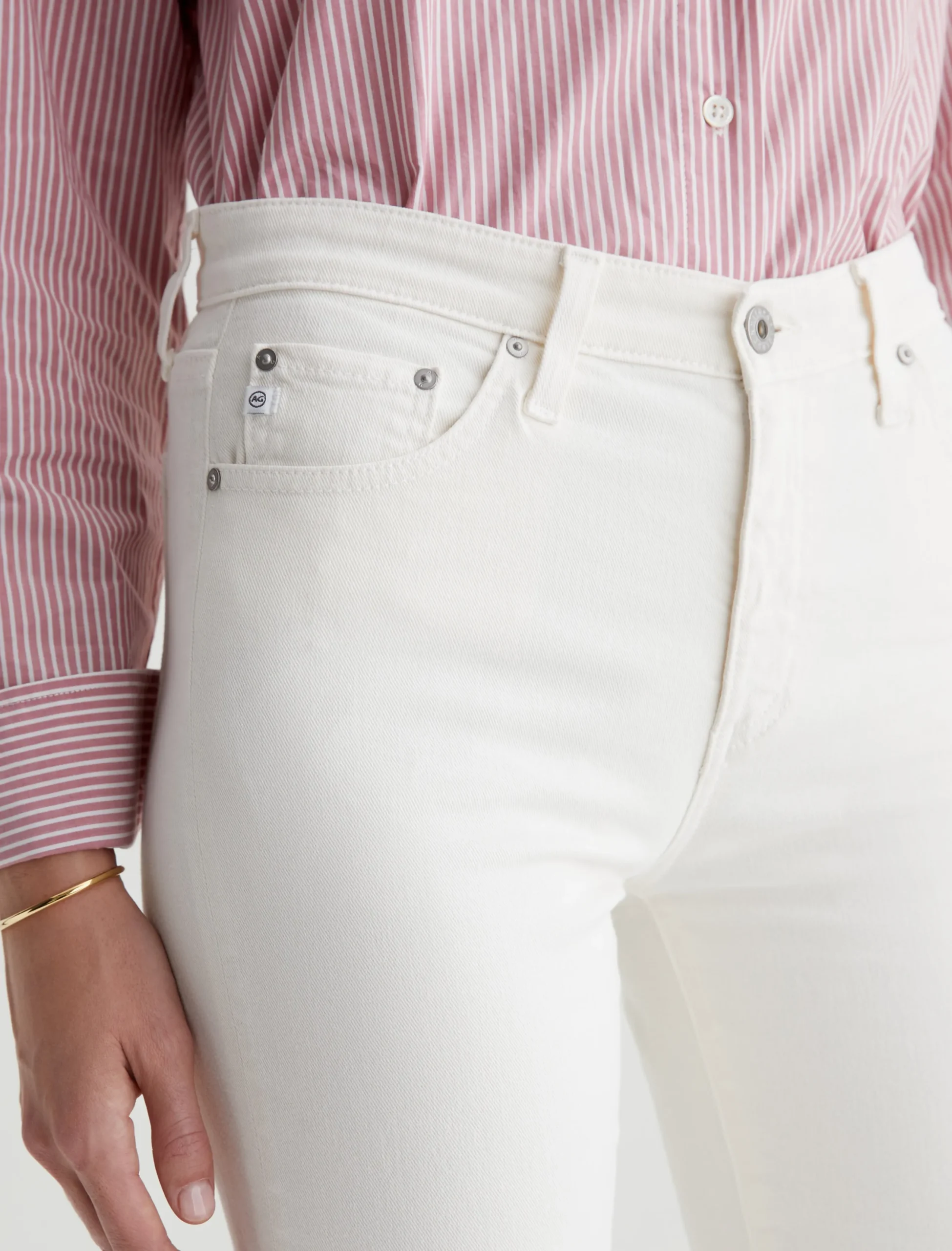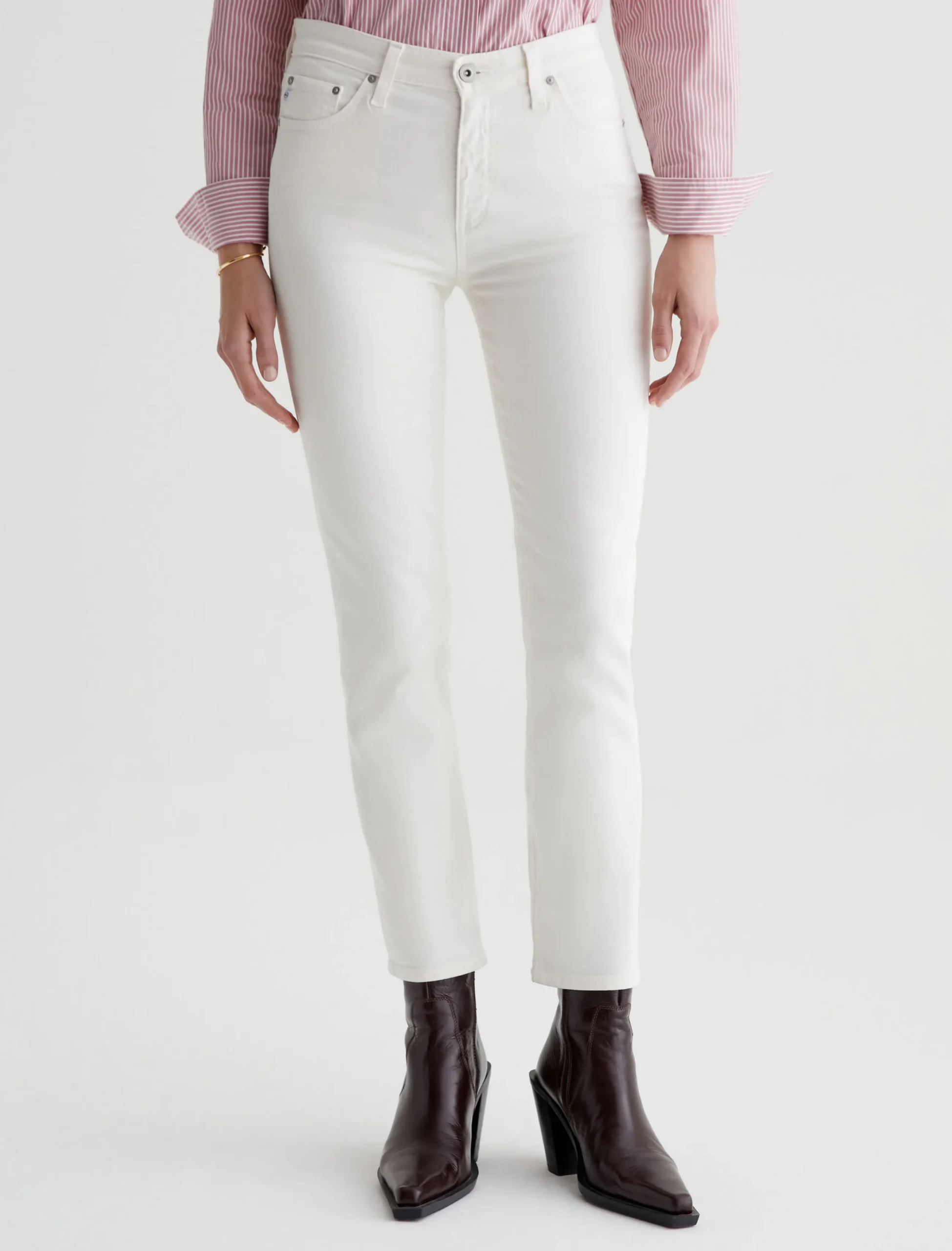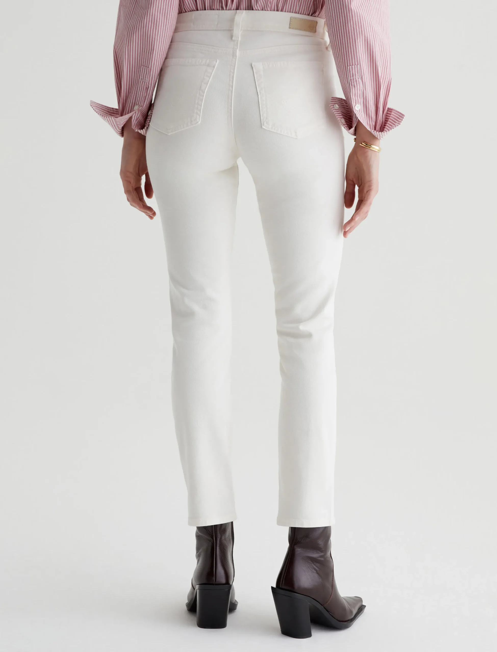Mari is our popular mid-rise slim-straight jean for women, updated in powder-white denim with the softest feel. The five-pocket style has a natural waist and fits easy around the hips, complete with a straight silhouette that slims down at the leg openings. This pair is crafted from 8.7 oz. Hyper Soft Bull Denim, an exclusive AG Cloud Soft Denim™ fabric. The special left-hand twill construction allows the yarns to gently relax and untwist for a luxe, supple texture. It’s designed to get even softer the more you wear it. There’s dual-elastic stretch built in for extra comfort and powerful recovery.