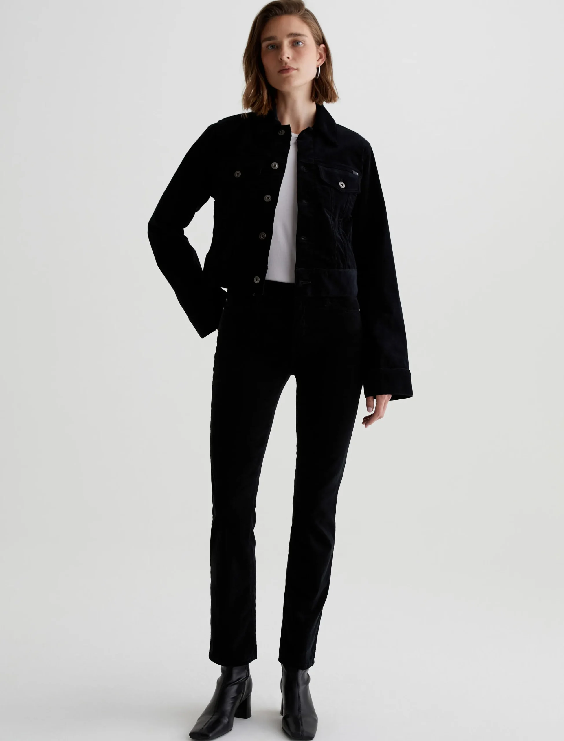 Mari is a mid-rise slim-straight silhouette, done here in 8.3 oz. Novel Stretch Mini Corduroy. It’s got a soft, plush texture and a saturated black shade. Mari offers a flattering mid-rise waist and fits easy around the hips, finished with a straight leg and subtle slim leg opening.
