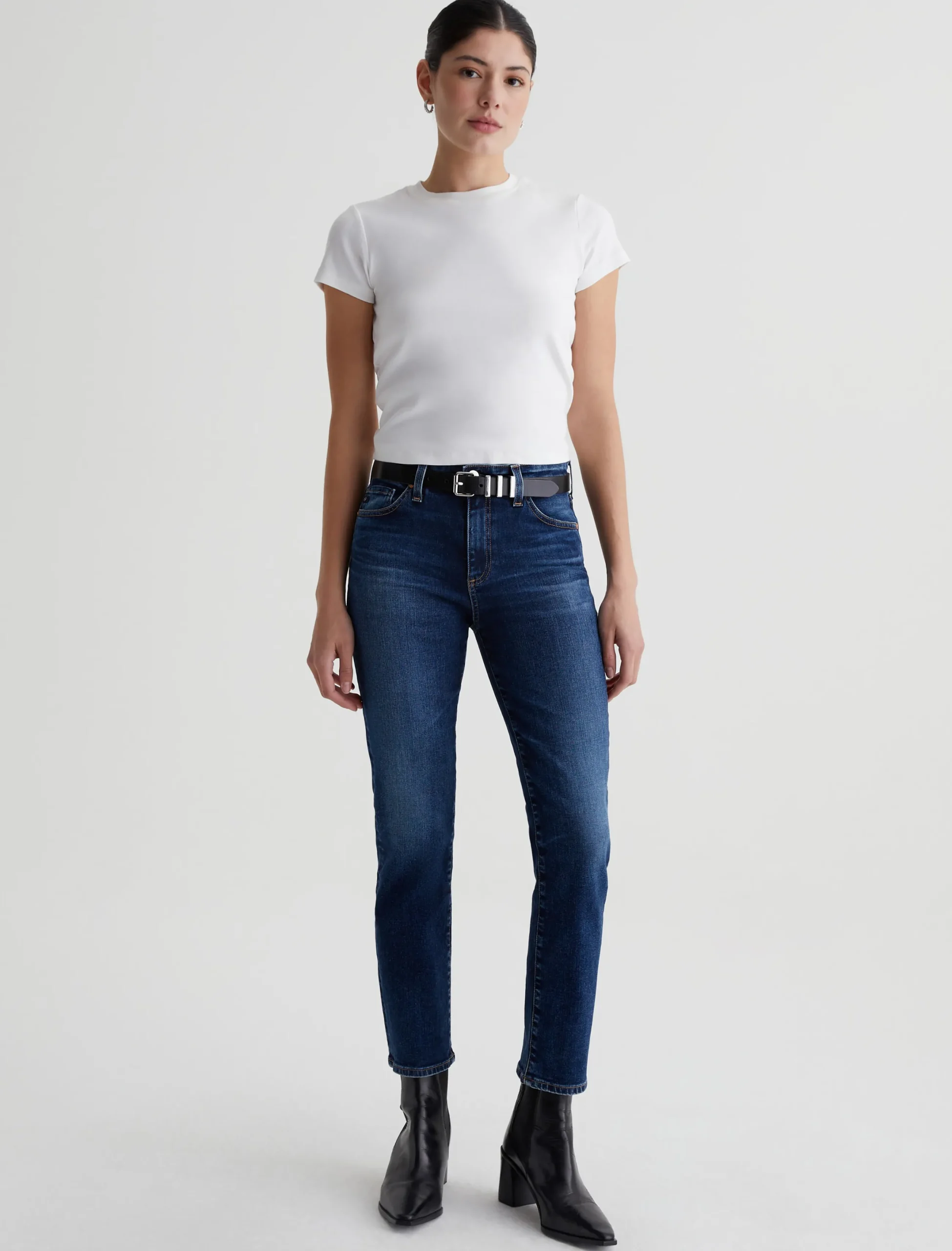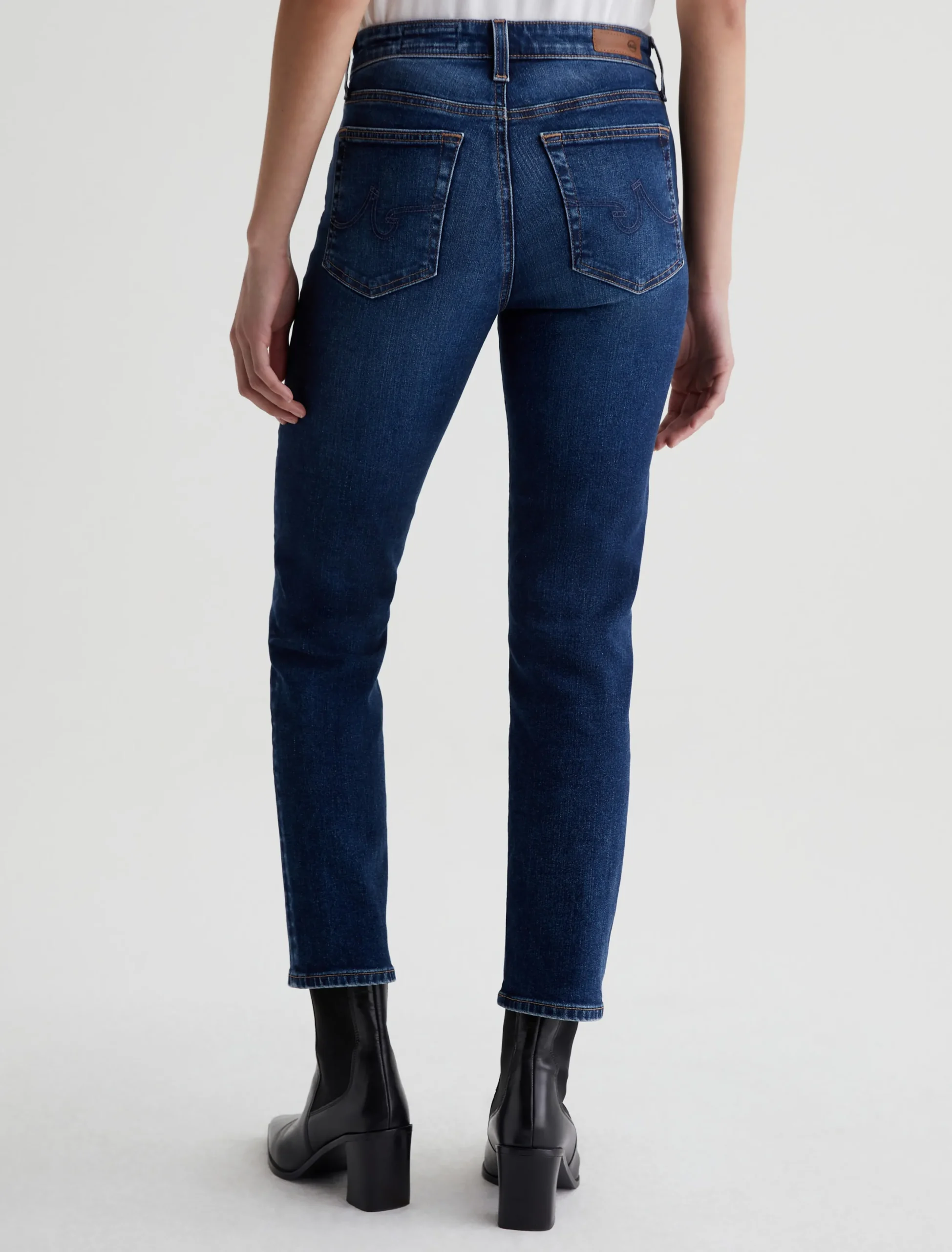 Our Mari Crop is a mid-rise slim straight jean that’s cropped just above the ankle. The high-waist silhouette fits easy around the hips with a straight leg and slim leg opening. It’s featured in 10 oz. Empower Denim with superstretch construction and a dark blue wash that’s been faded for a lived-in character. Marigold topstitching accents the classic five-pocket design.