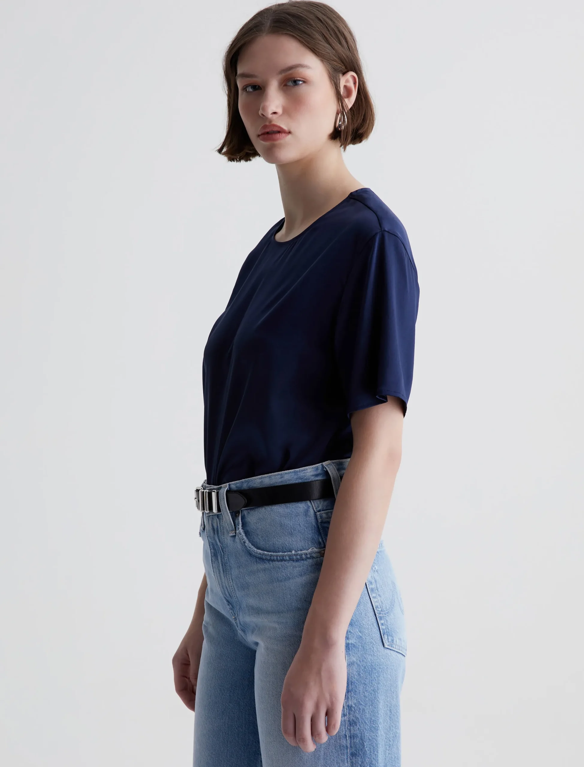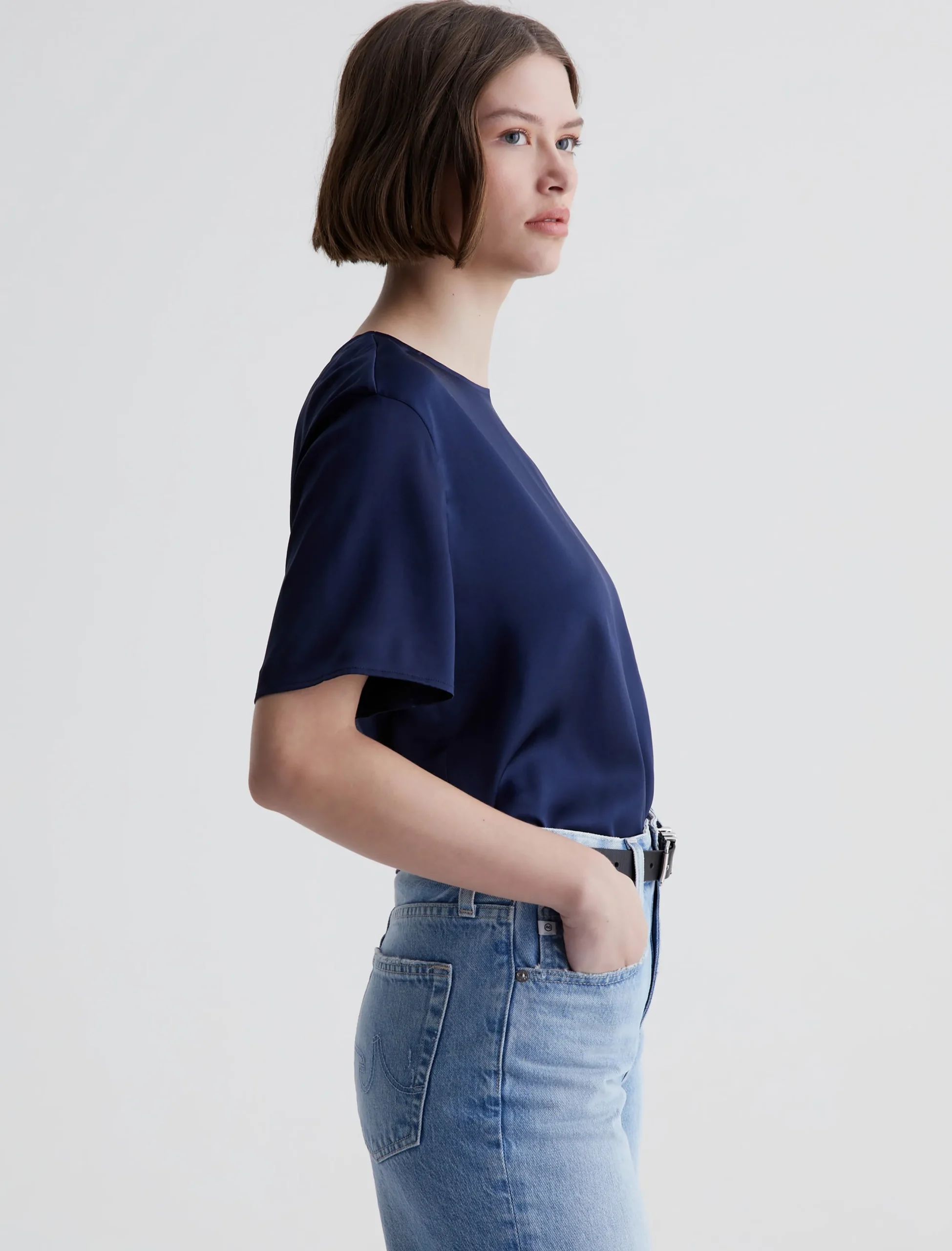 Luxe stretch silk elevates the silhouette of a relaxed-fit tee. Done in a classic navy blue, the Nari top has a boxy, oversized shape that’s defined by a crew neck, loose-fitting short sleeves, and a keyhole at the back. It’s sleek and simple with a breezy drape—perfect for dressing up denim or pairing with our matching silk separates.