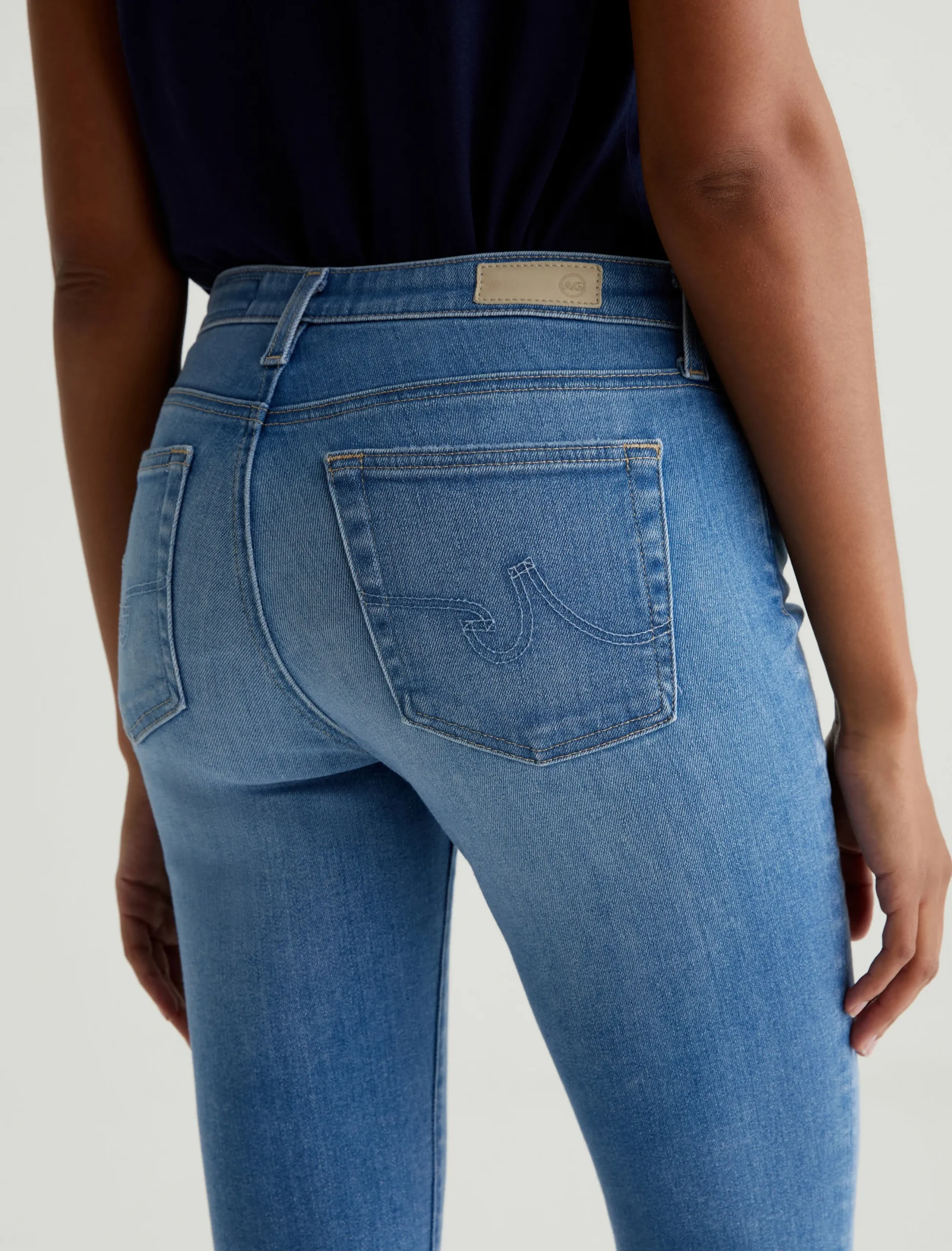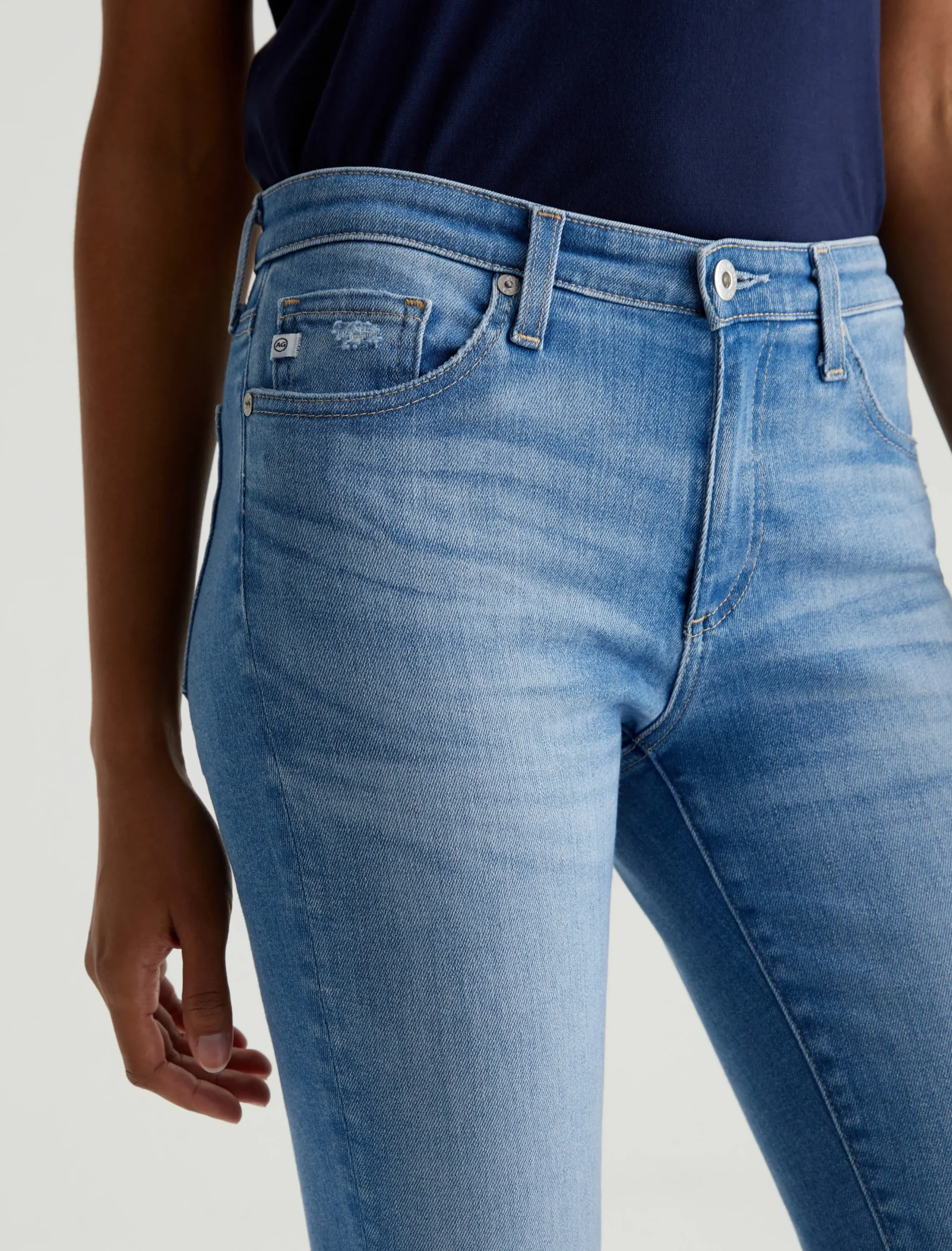 Prima is a mid-rise cigarette jean in a light-medium indigo wash with fading, worn hems, and a touch of distressing at the pockets. Designed in 11.5 oz. Sioux Stretch Denim from Japan, these five-pocket women’s jeans are fitted through the hips and slightly tapered at the legs.