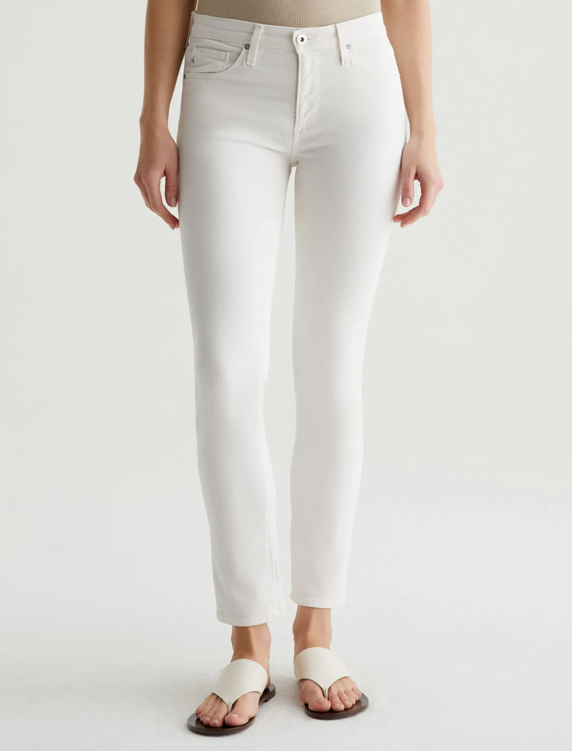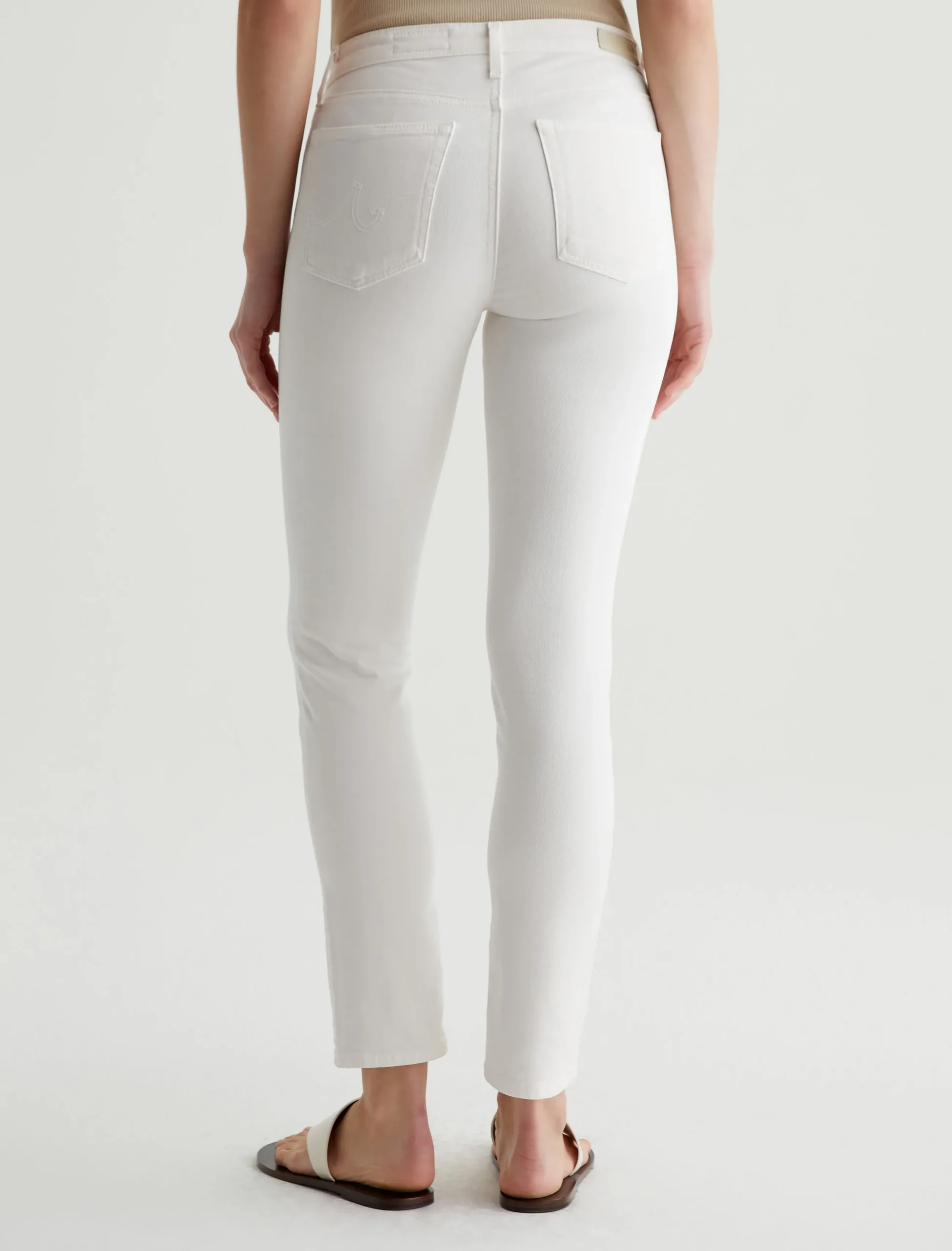 Our Prima Ankle is a mid-rise cigarette jean that’s fitted through the hips, slightly tapered at the legs, and cropped to the perfect ankle length. This five-pocket pair features 9.7 oz. Hyper-Soft Stretch Denim in powder white. This exclusive AG Cloud Soft Denim™ features special left-hand twill construction that allows the yarns to gently relax and untwist for a luxe, supple feel. It’s designed to get softer with every wear.
