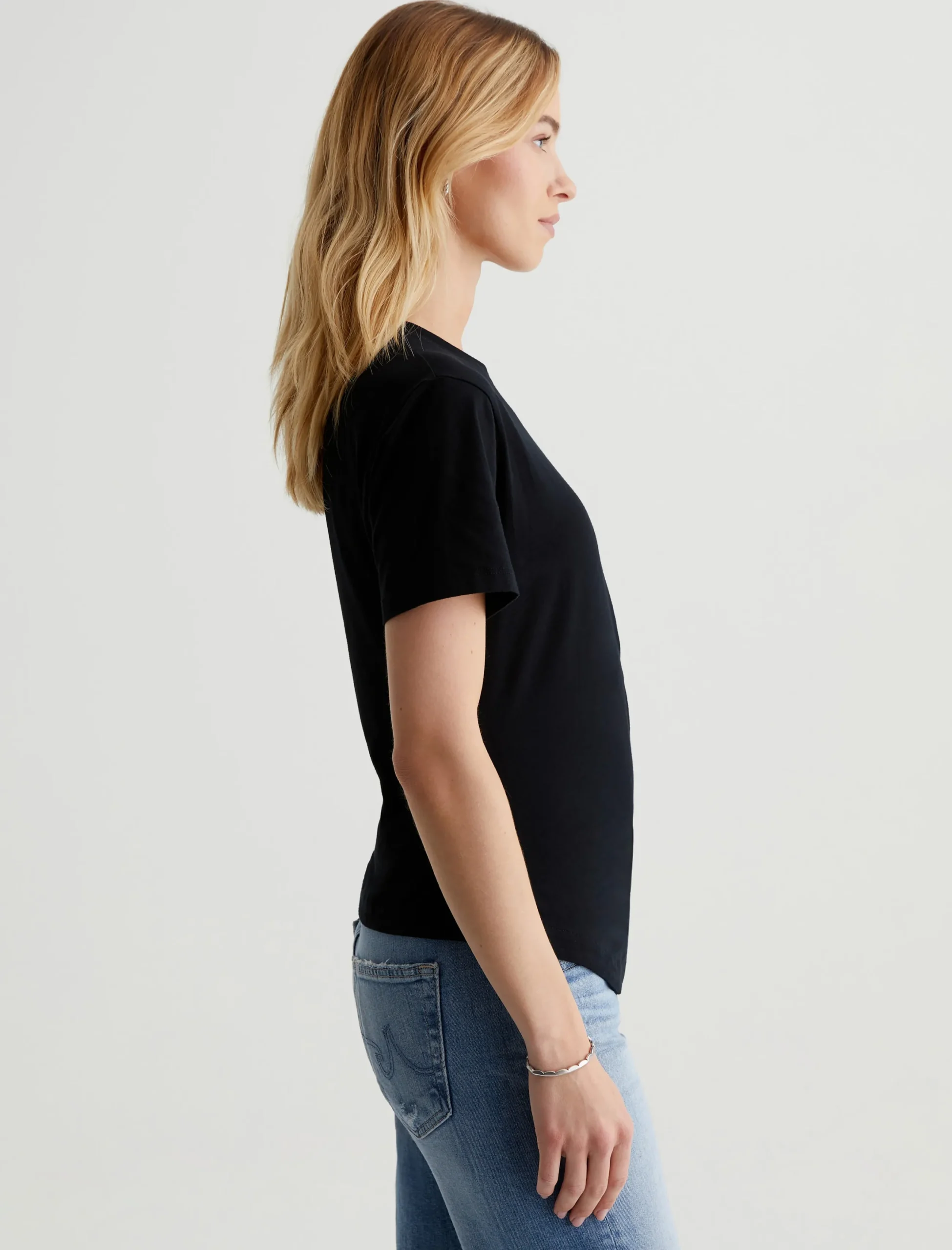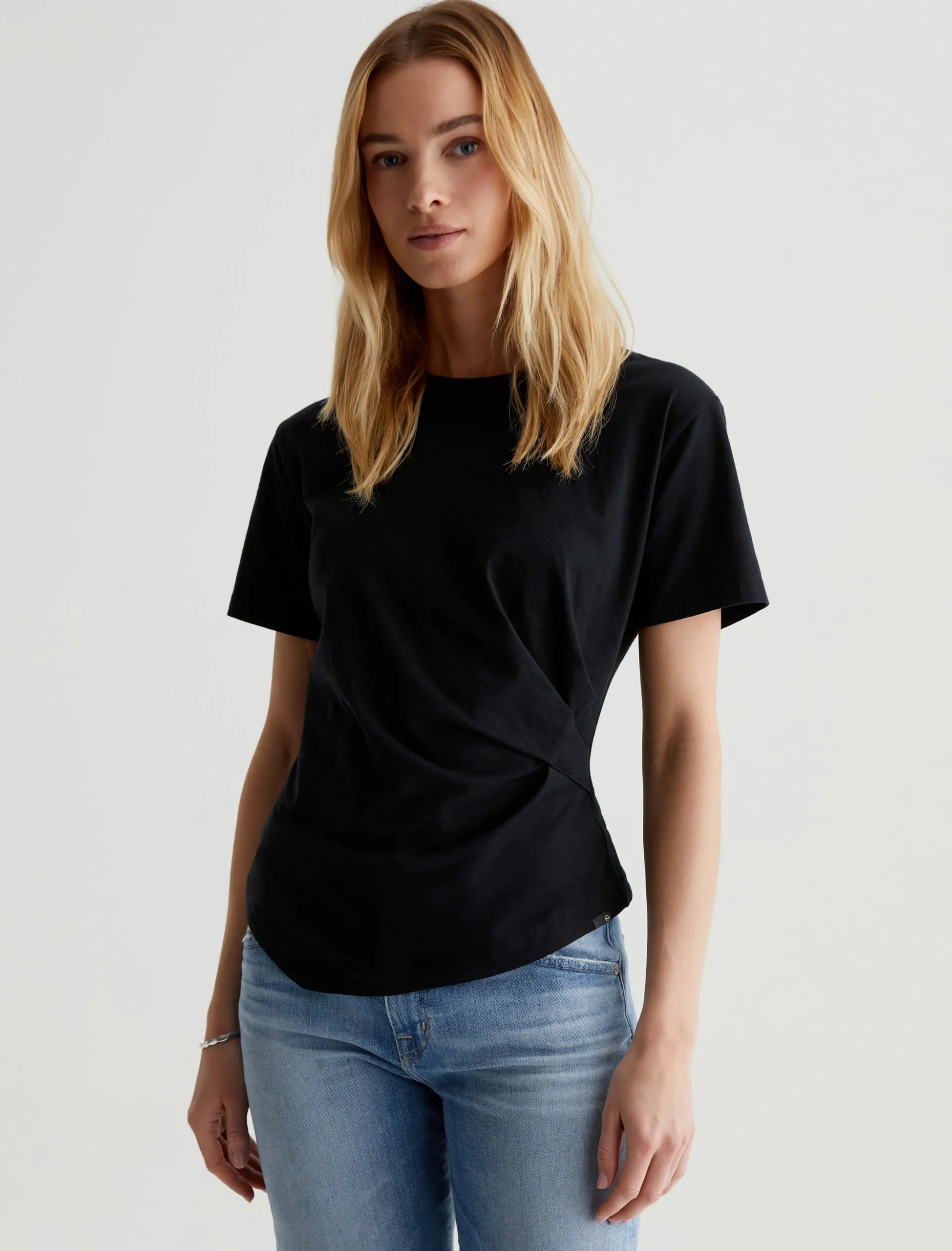 A simple yet elegant take on the classic crewneck T-shirt. Our Rini Top features draped asymmetric styling with side pleats and an uneven hem. Made from black stretch-blend jersey, this short-sleeve tee has a soft, luxurious feel that elevates your casual ensembles.