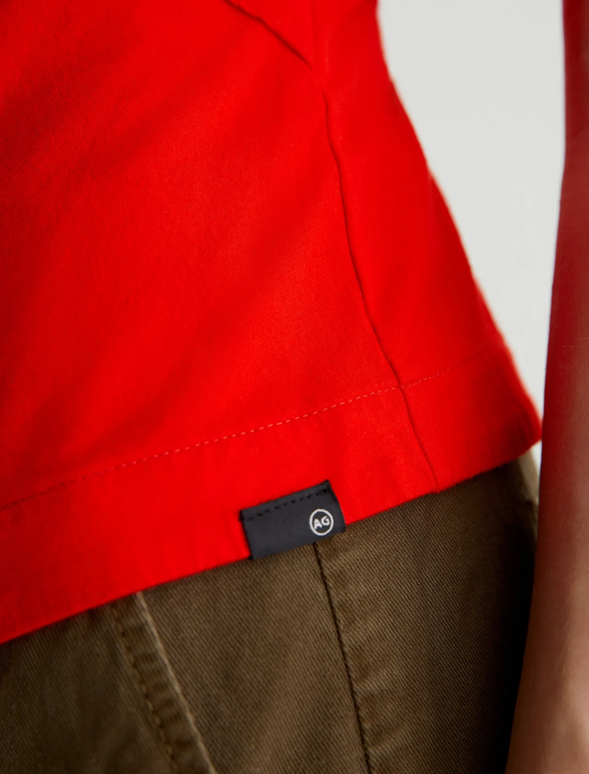 An eye-catching update on the classic crewneck T-shirt. Our Rini Top features draped asymmetric styling with side pleats and an uneven hem. Made from red stretch-blend jersey, this short-sleeve tee has a soft, luxurious feel that elevates your casual ensembles.