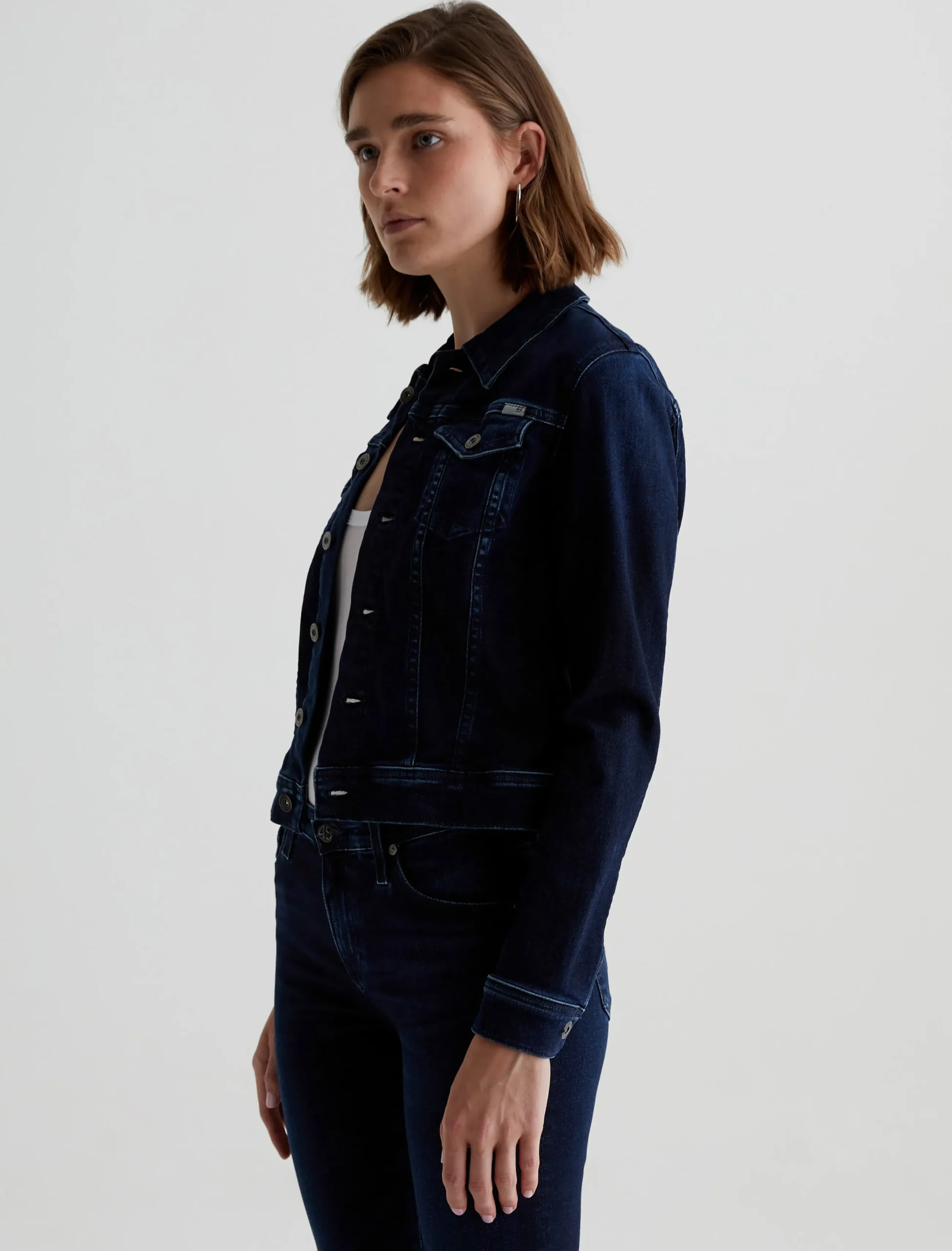 A slim take on the classic denim trucker, our Robyn Jacket features an AG-ed™ dark indigo wash with fading at the seams and edges. This women’s jean jacket fits close in 10 oz. Empower Denim—a high-stretch, high-resilience denim from Japan.