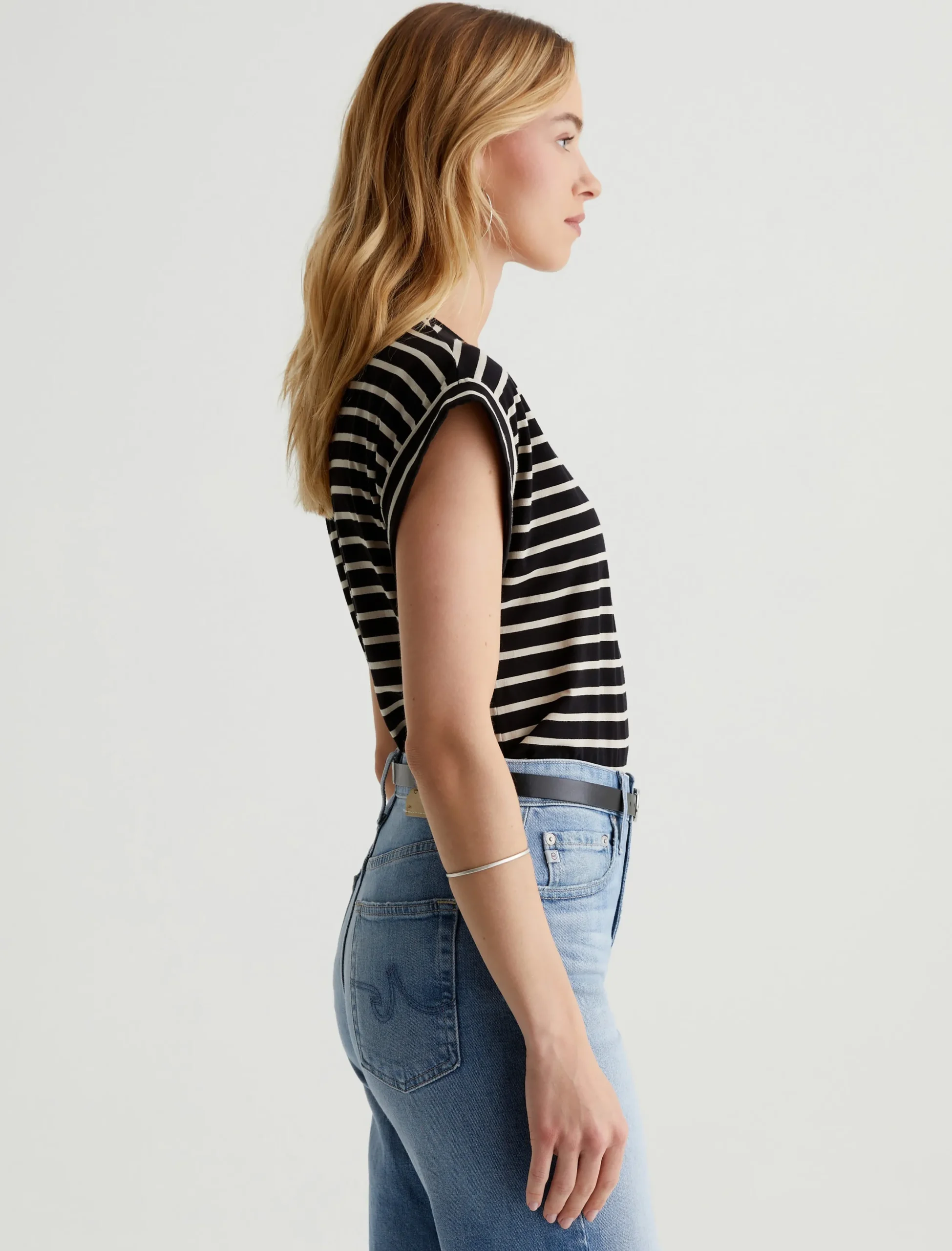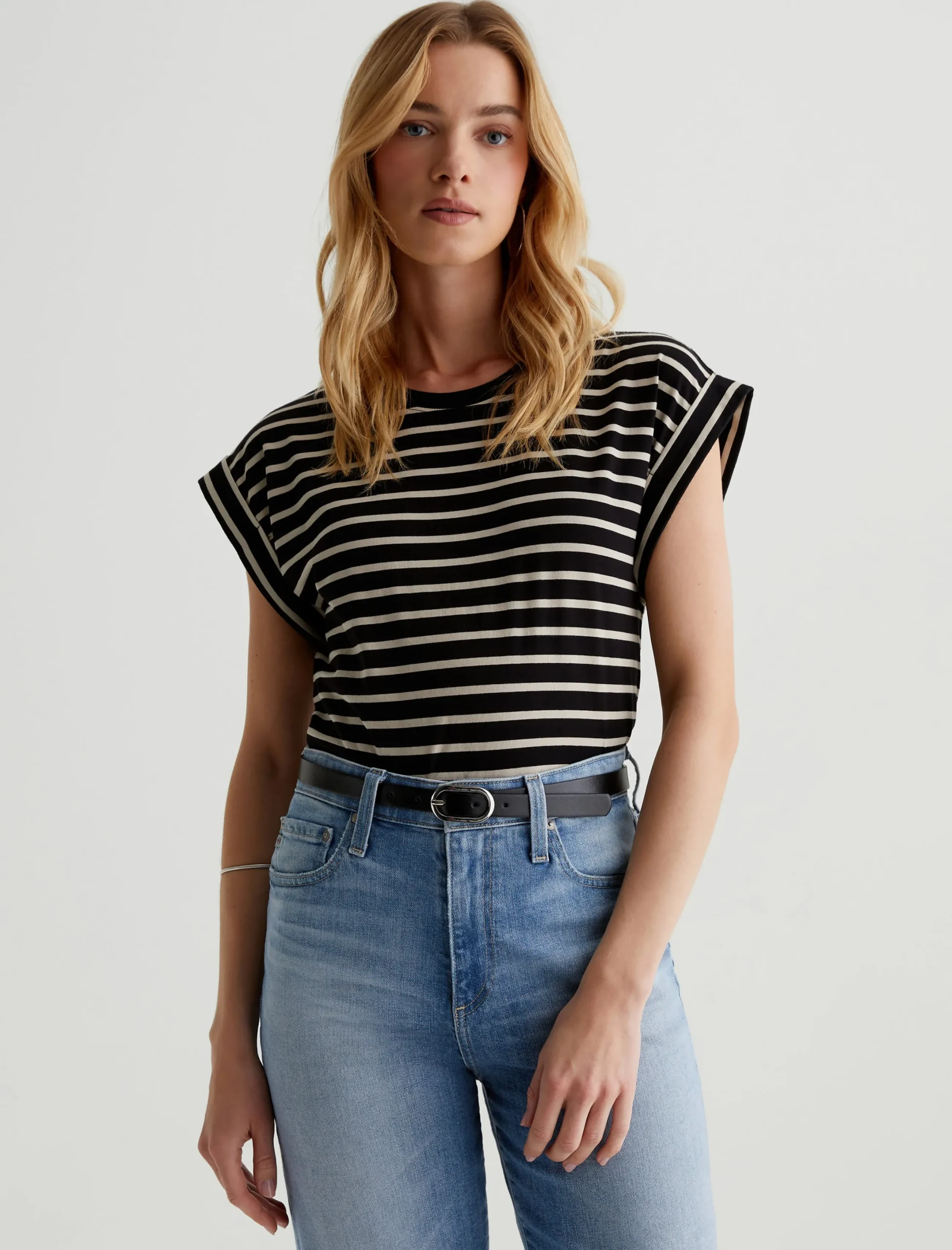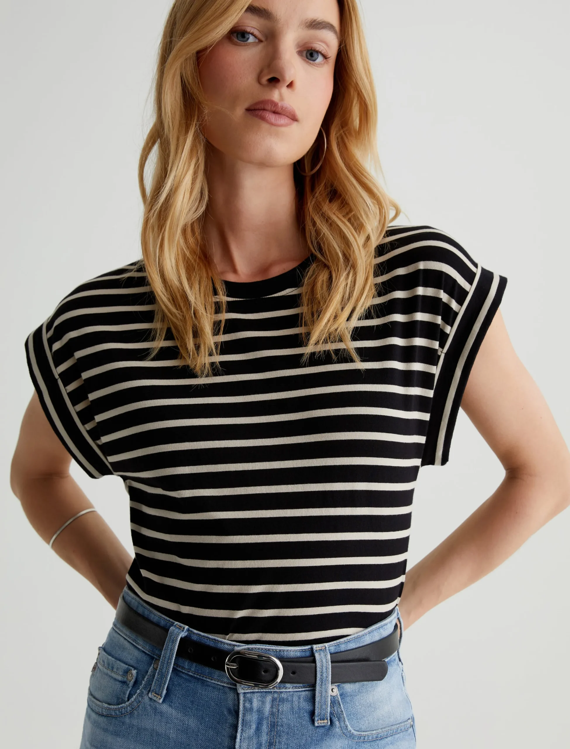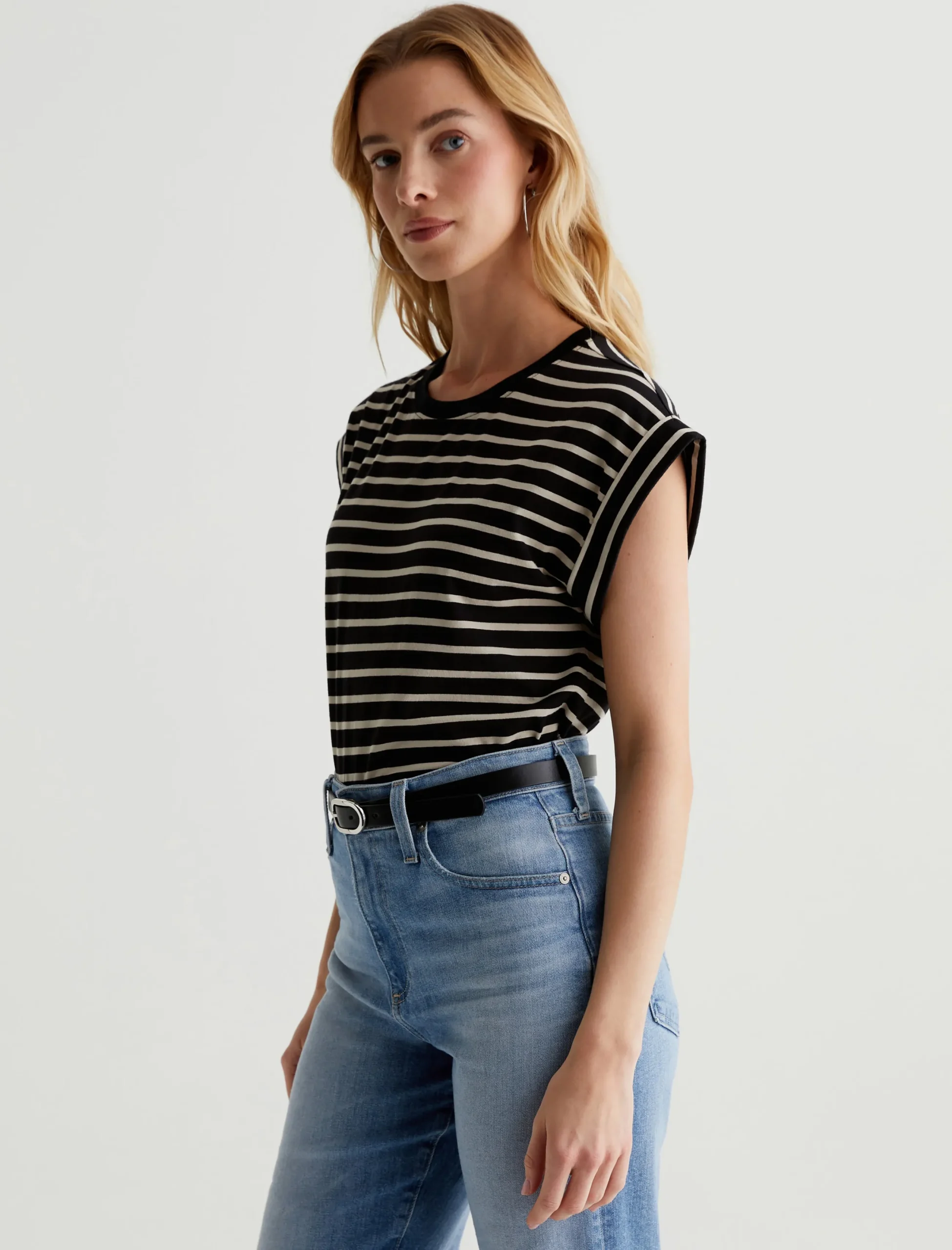 Our Rowan T-shirt has a relaxed, roomy fit defined by a crew neckline and short, rolled-up sleeves. Crafted from comfortable stretch-blend jersey, it’s done here in black with beige stripes.