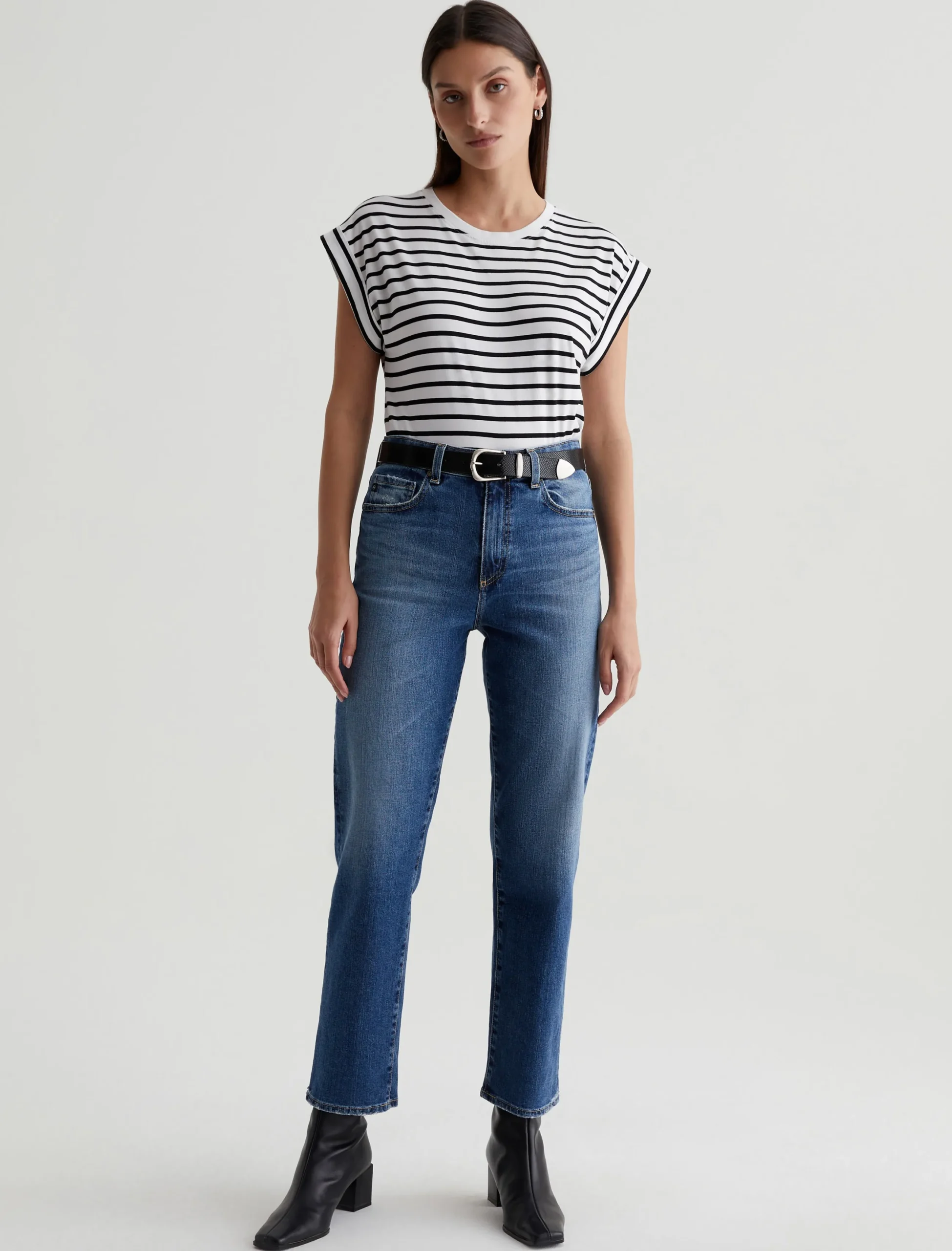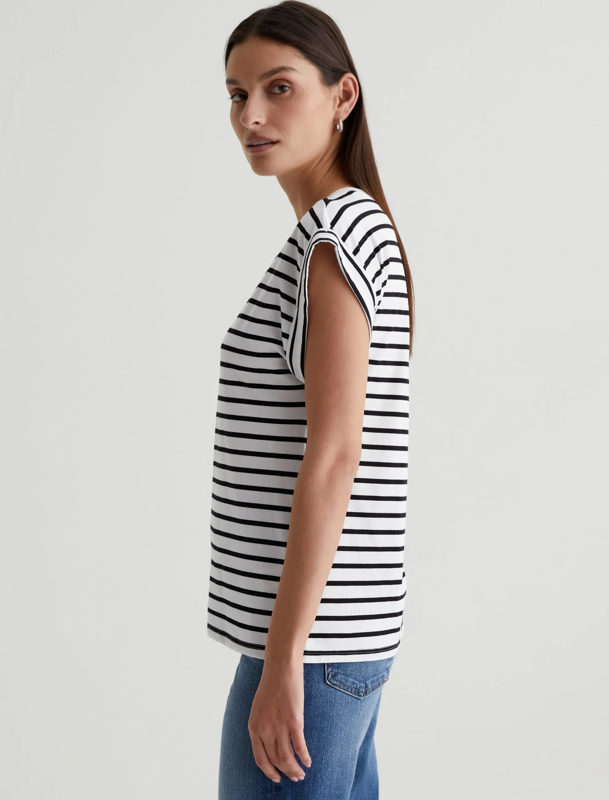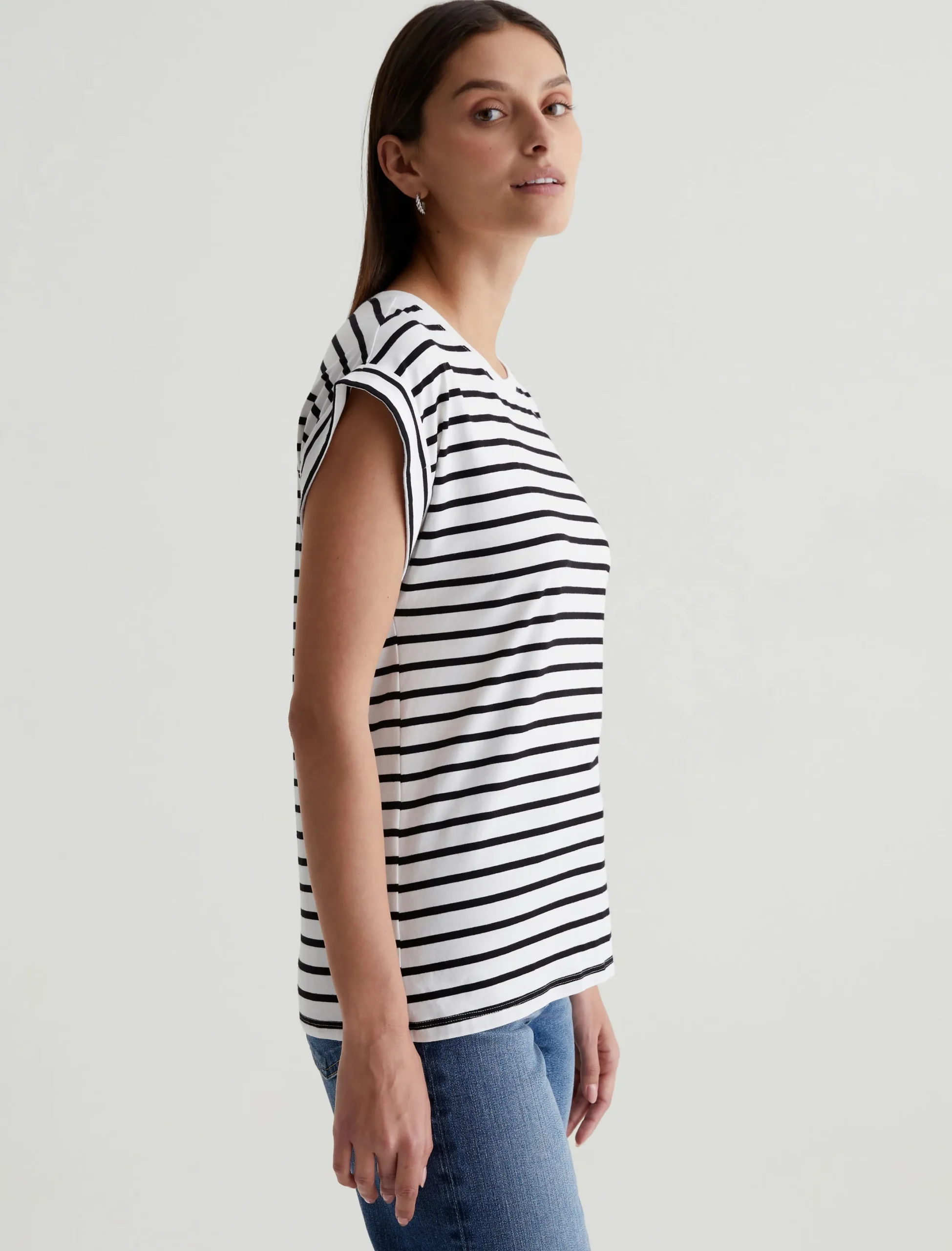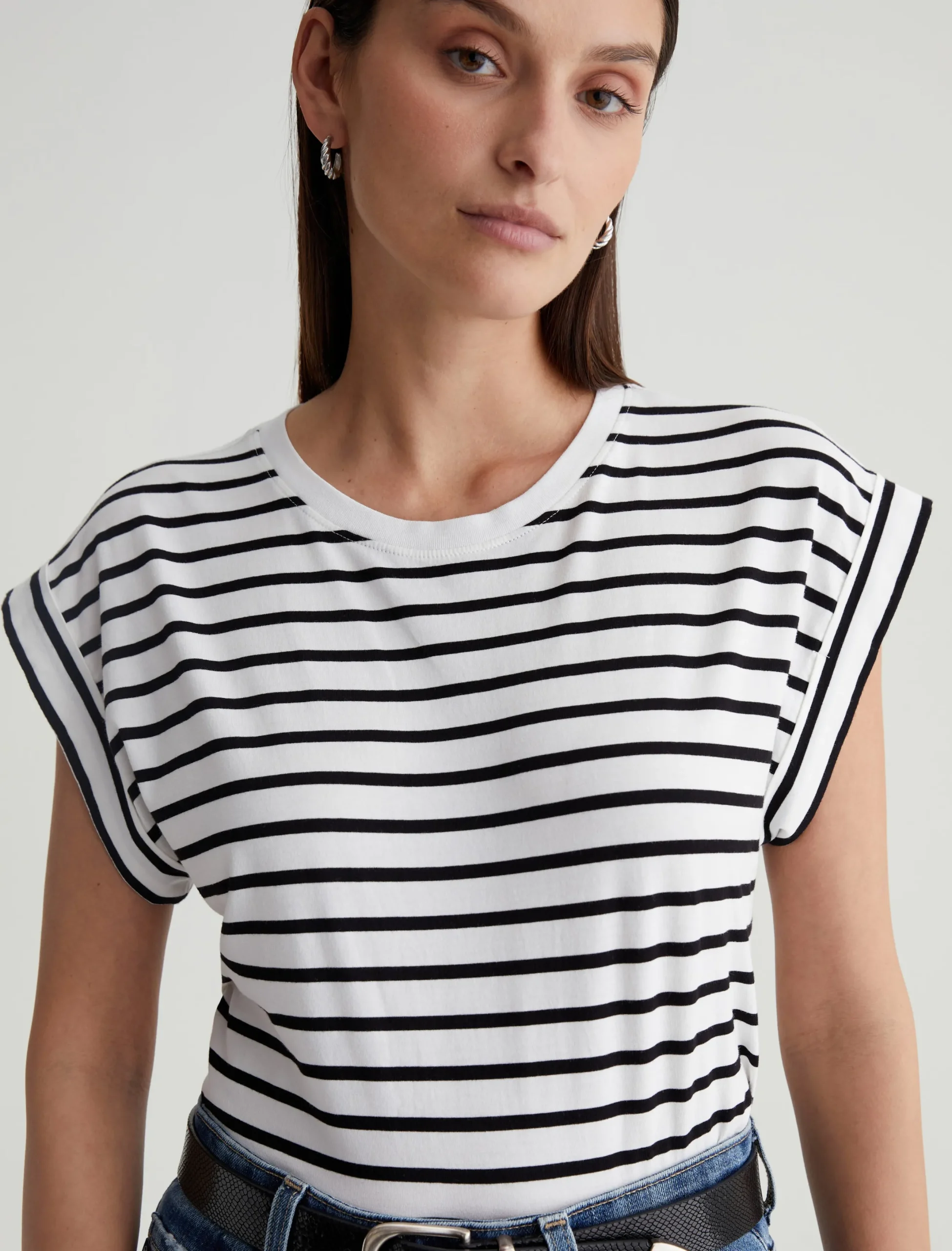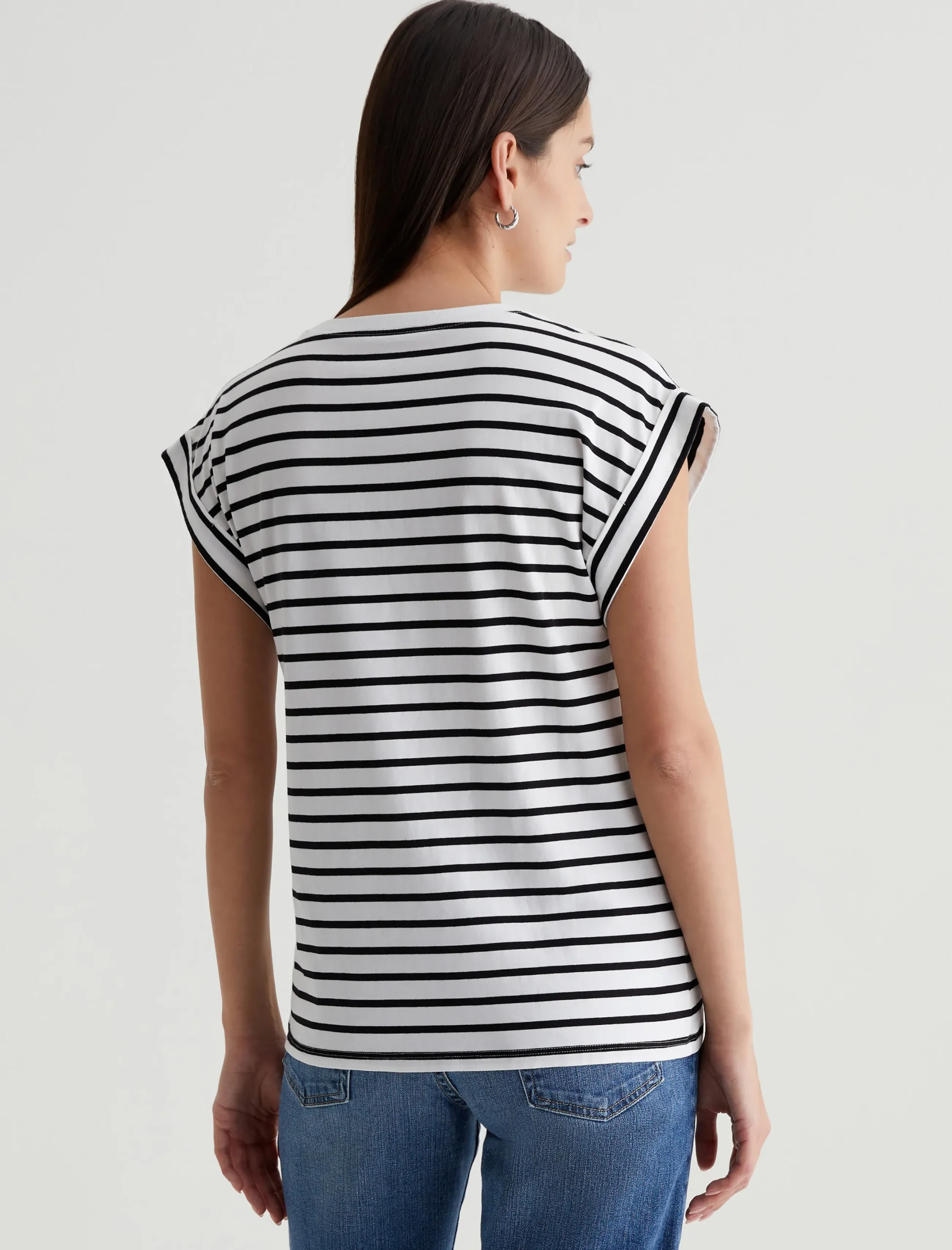 Our Rowan T-shirt has a relaxed, roomy fit defined by a crew neckline and short, rolled-up sleeves. Crafted from comfortable stretch-blend jersey, it’s done here in white with black stripes.