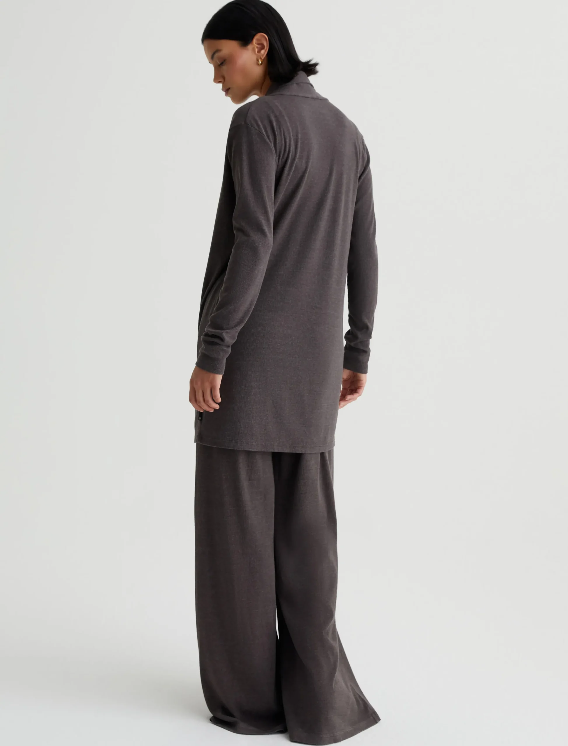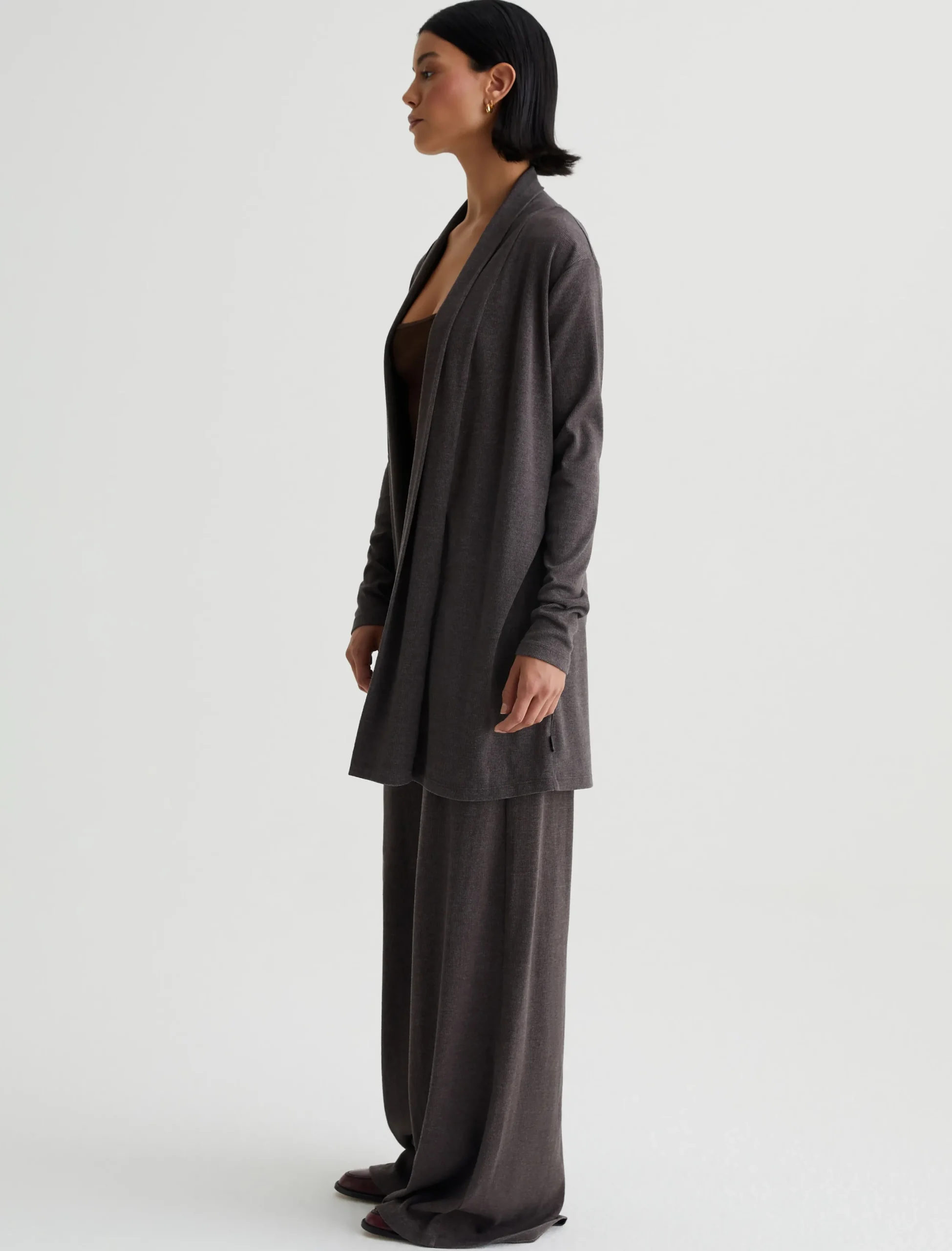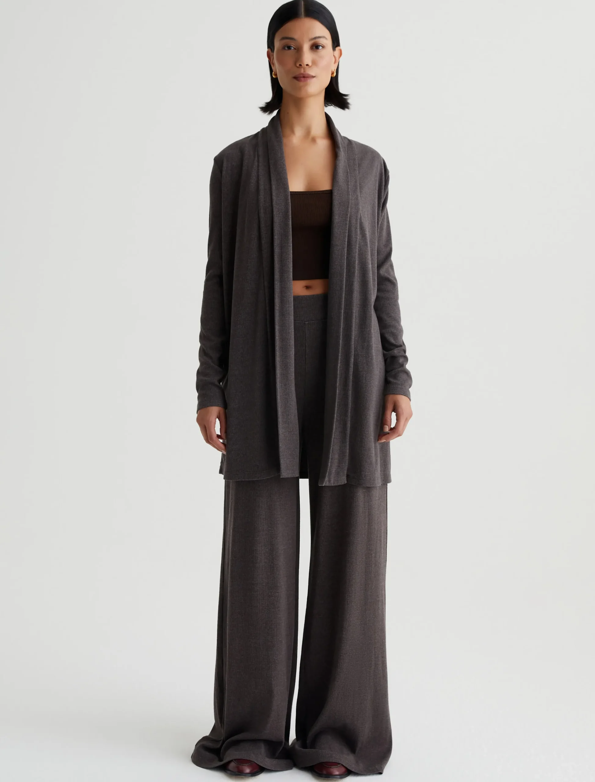 The Saamie Cardigan has a classic cozy fit with long sleeves and an open front placket. Crafted from a comfortable mélange rib knit in Stone Brown, it’s a lounge-ready layer that pairs with our Ever Tank and Sourie pants to create a chic set for your days off.