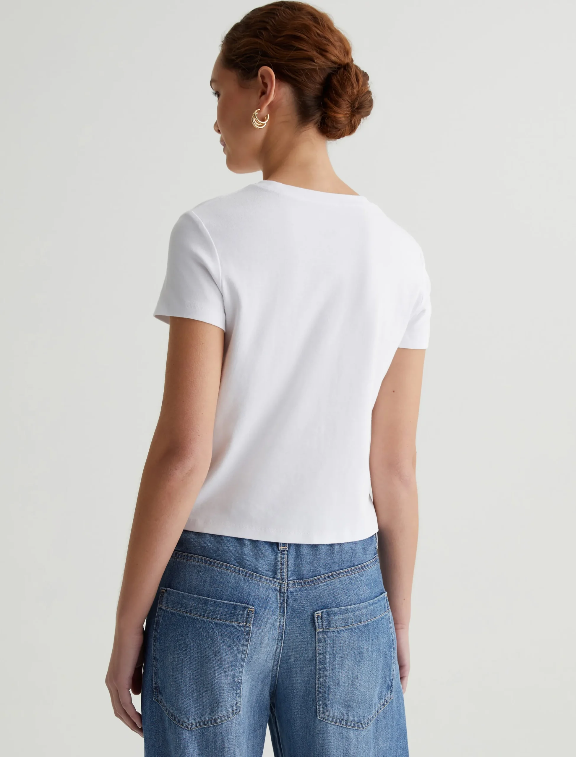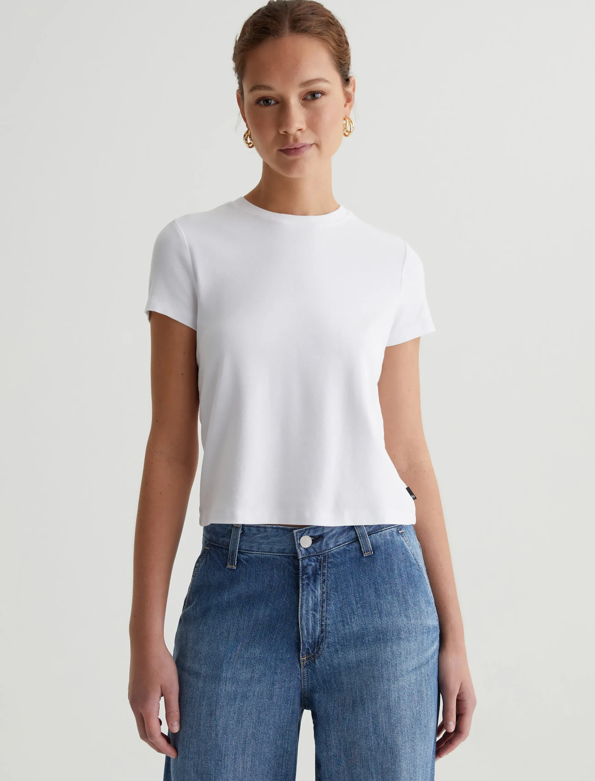 Our Sadie Crew is a cropped crewneck tee with a shrunken, ’90s-esque vintage silhouette. The short-sleeve style is crafted from a cotton-blend baby rib knit in a true white color. An effortless addition to your everyday lineup.