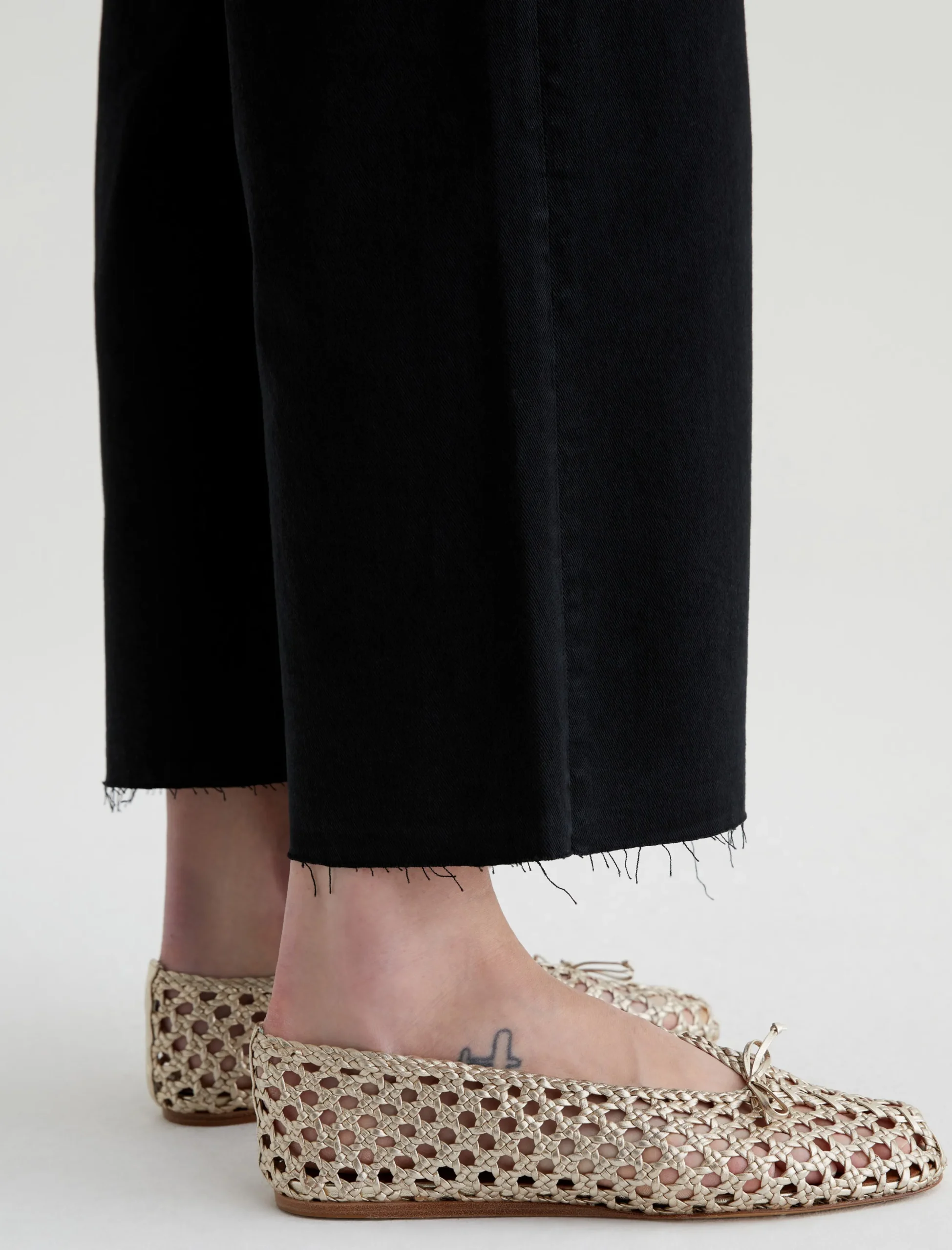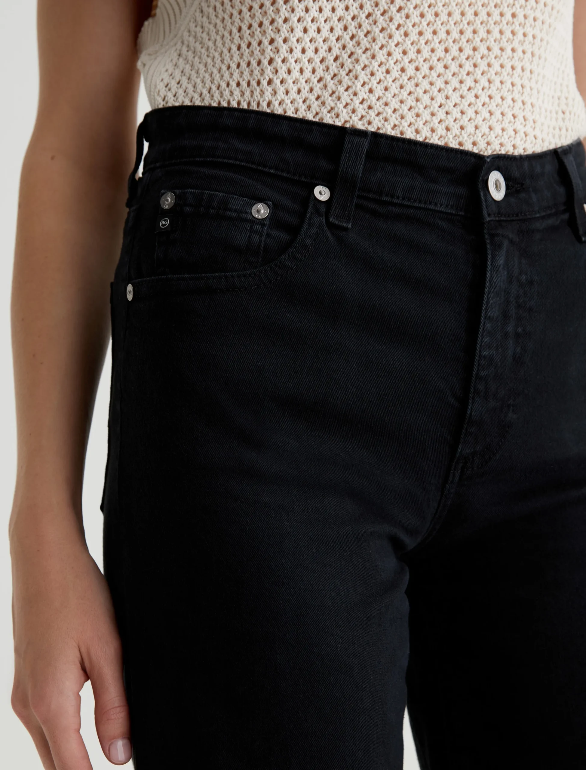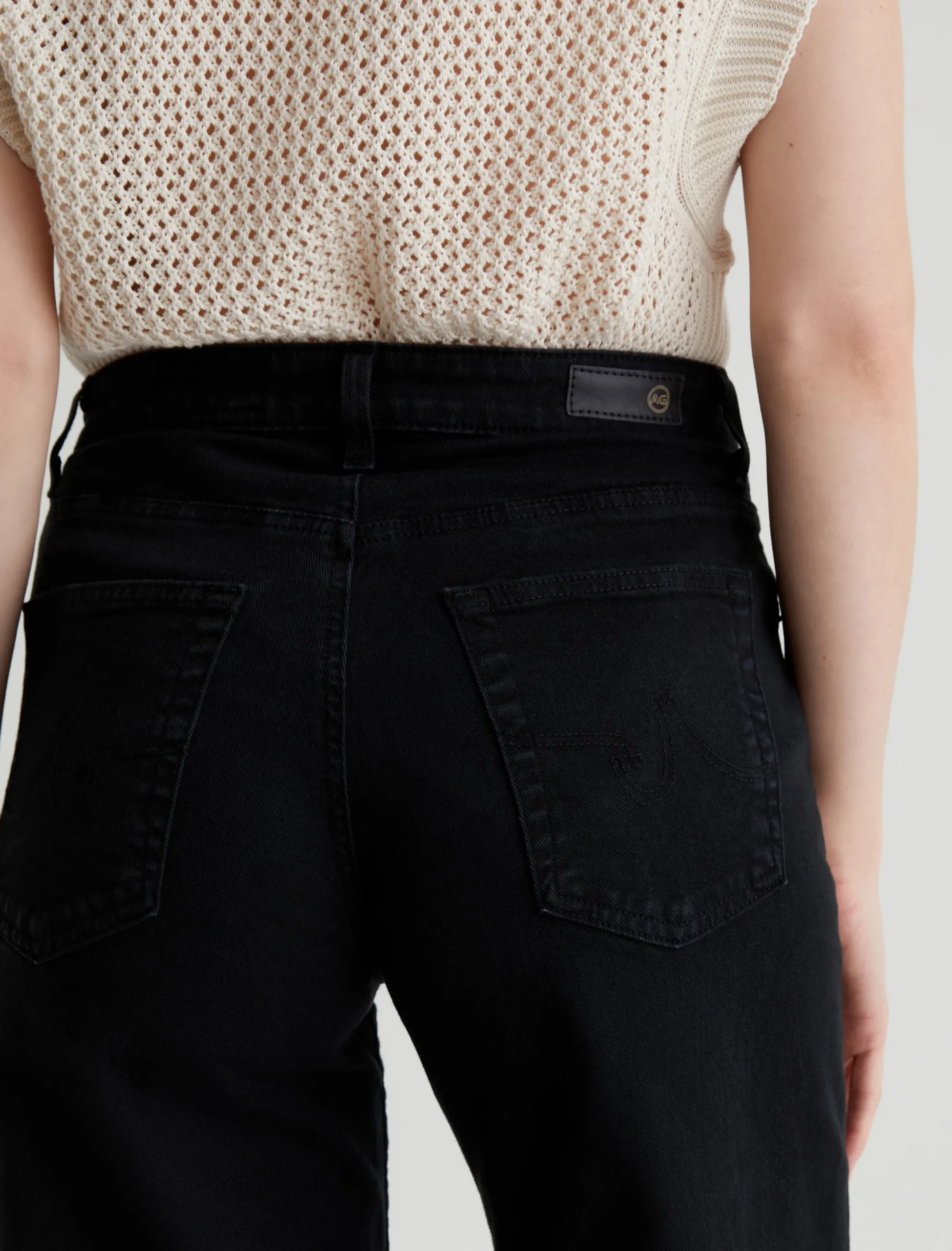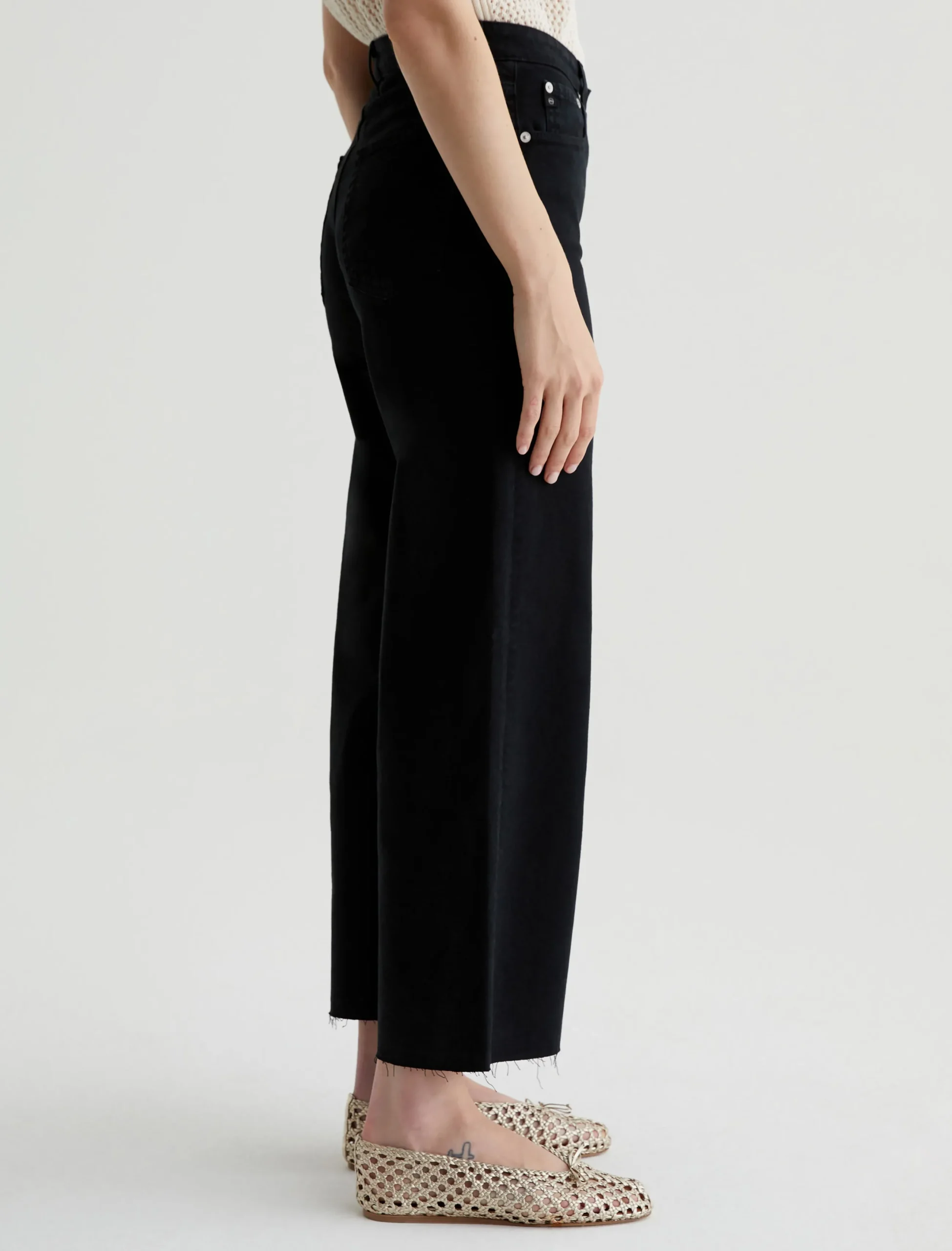 The Saige Wide Leg Crop is a black mid-rise jean with loose, cropped legs and raw hems. Sulfur-dyed for a slightly faded look, these women’s wide-leg jeans come in our 8.7 oz. Hyper Soft Bull Denim featuring dual-elastic for supreme comfort and advanced recovery. AG Cloud Soft Denim™ fabrics feature special left-hand twill construction that allows the yarns to gently relax and untwist for a luxe, supple feel. It’s designed to get even softer the more you wear it.