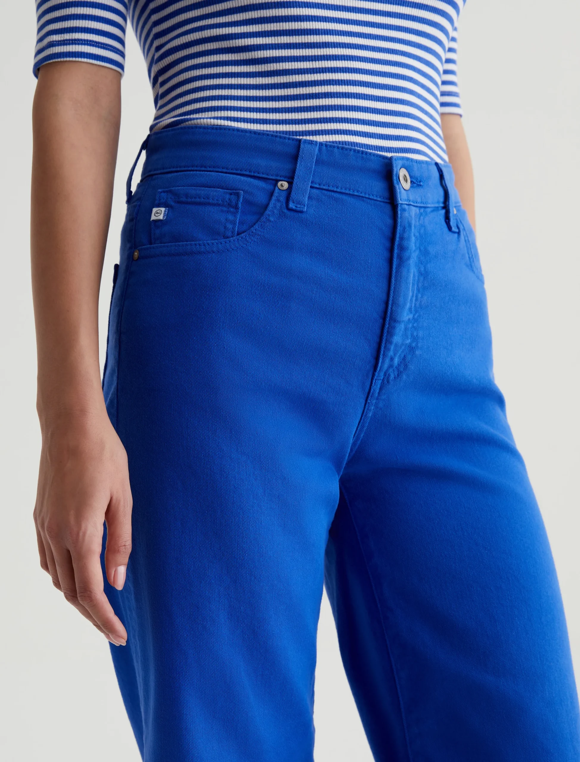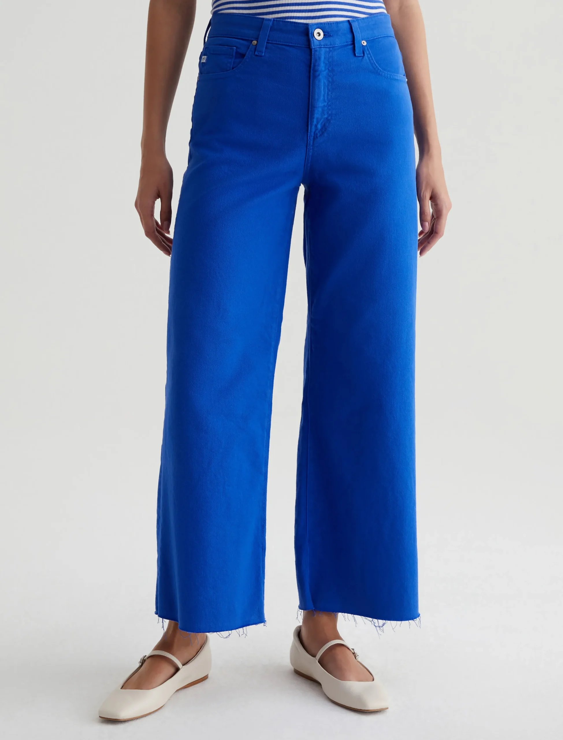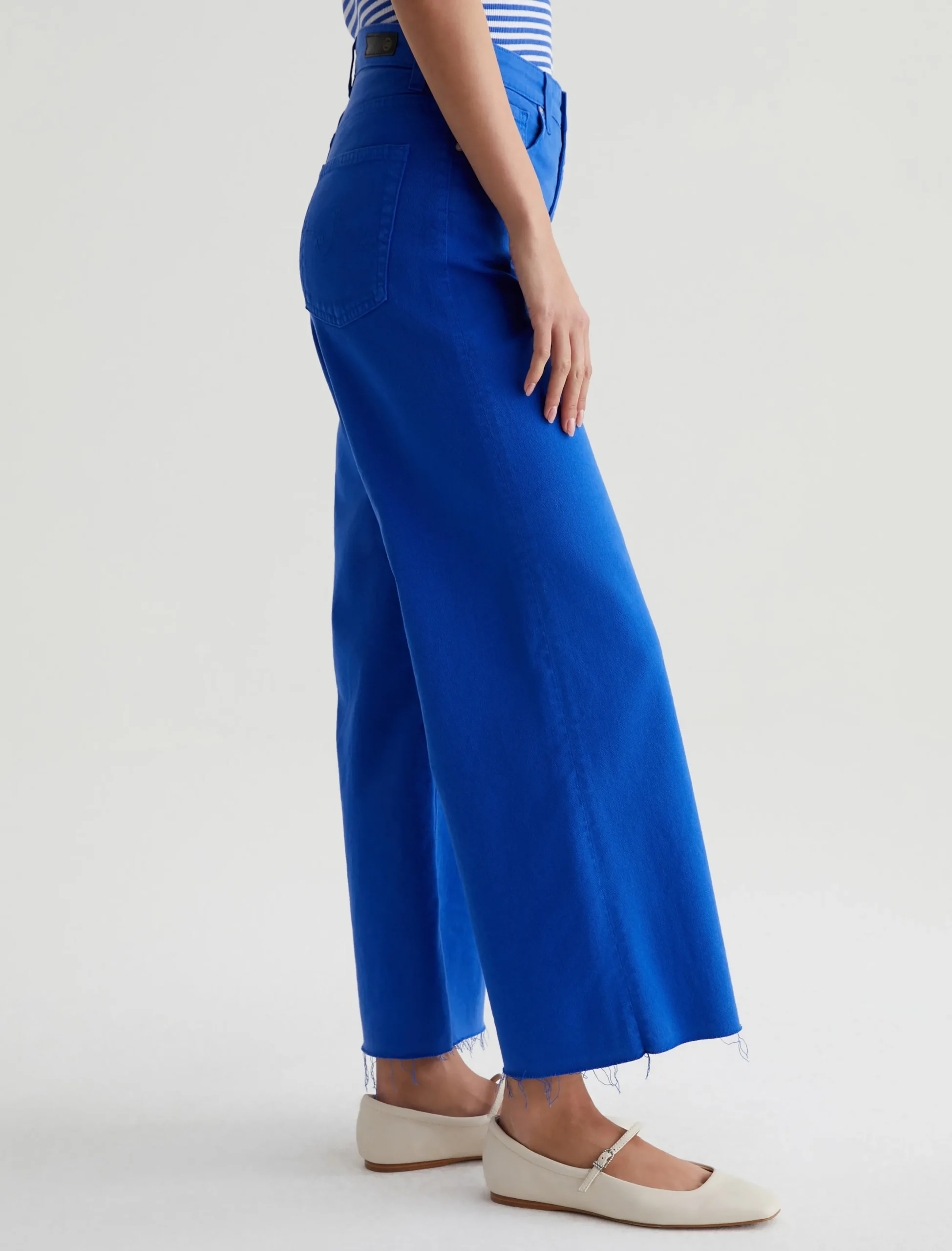The Saige Wide Leg Crop in Mediterranean-inspired blue adds the perfect pop of color to your look. These five-pocket jeans for women have a mid-rise waist and loose, cropped legs with raw hems. Made from our exclusive AG Cloud Soft Denim™, this pair comes in 8.7 oz. Hyper Soft Bull Denim featuring AG’s special left-hand twill fabric that allows the yarns to gently relax and untwist for a supple, velvety feel. It’s designed to get even softer the more you wear it. Dual-elastic stretch offers extra comfort and a resilient shape.