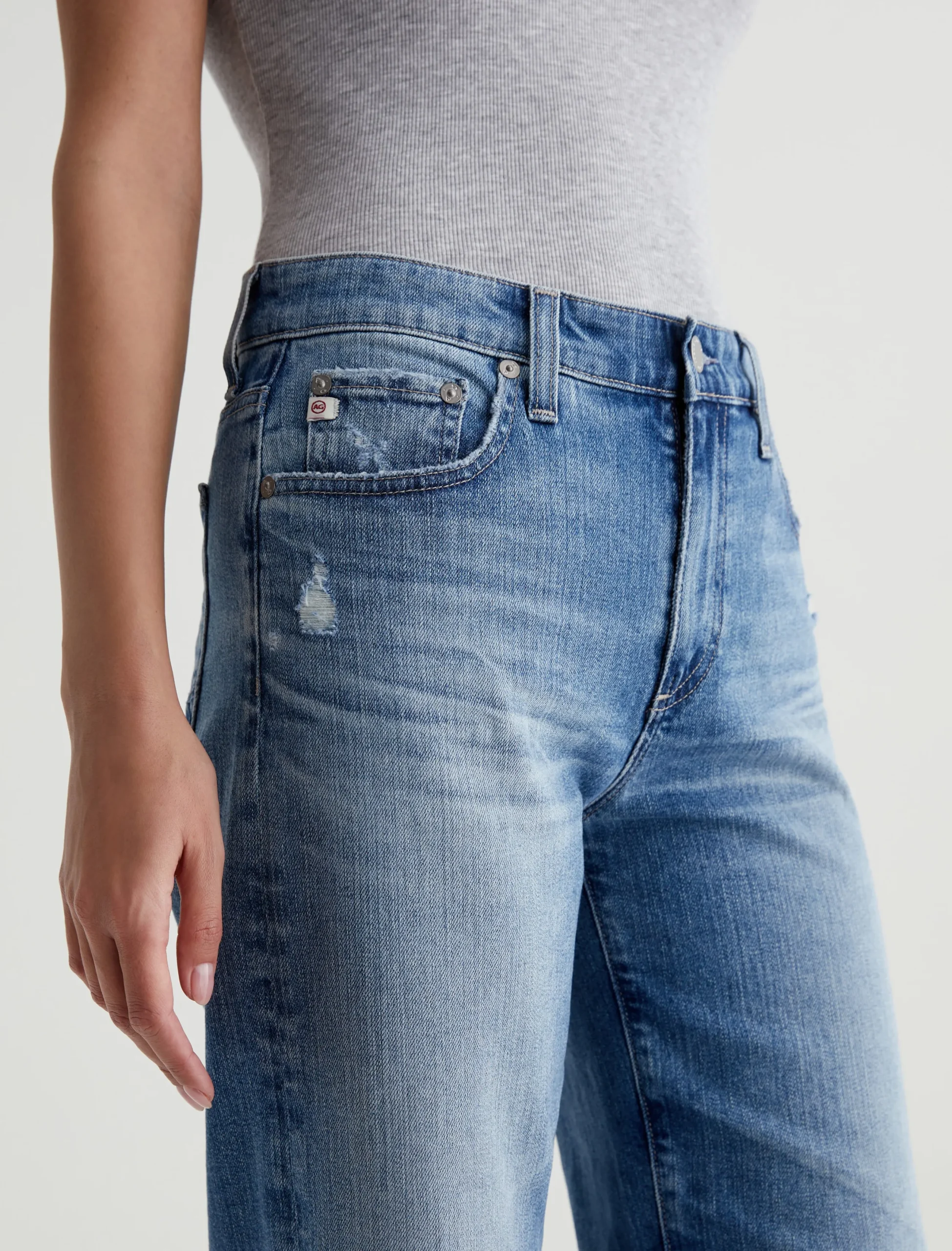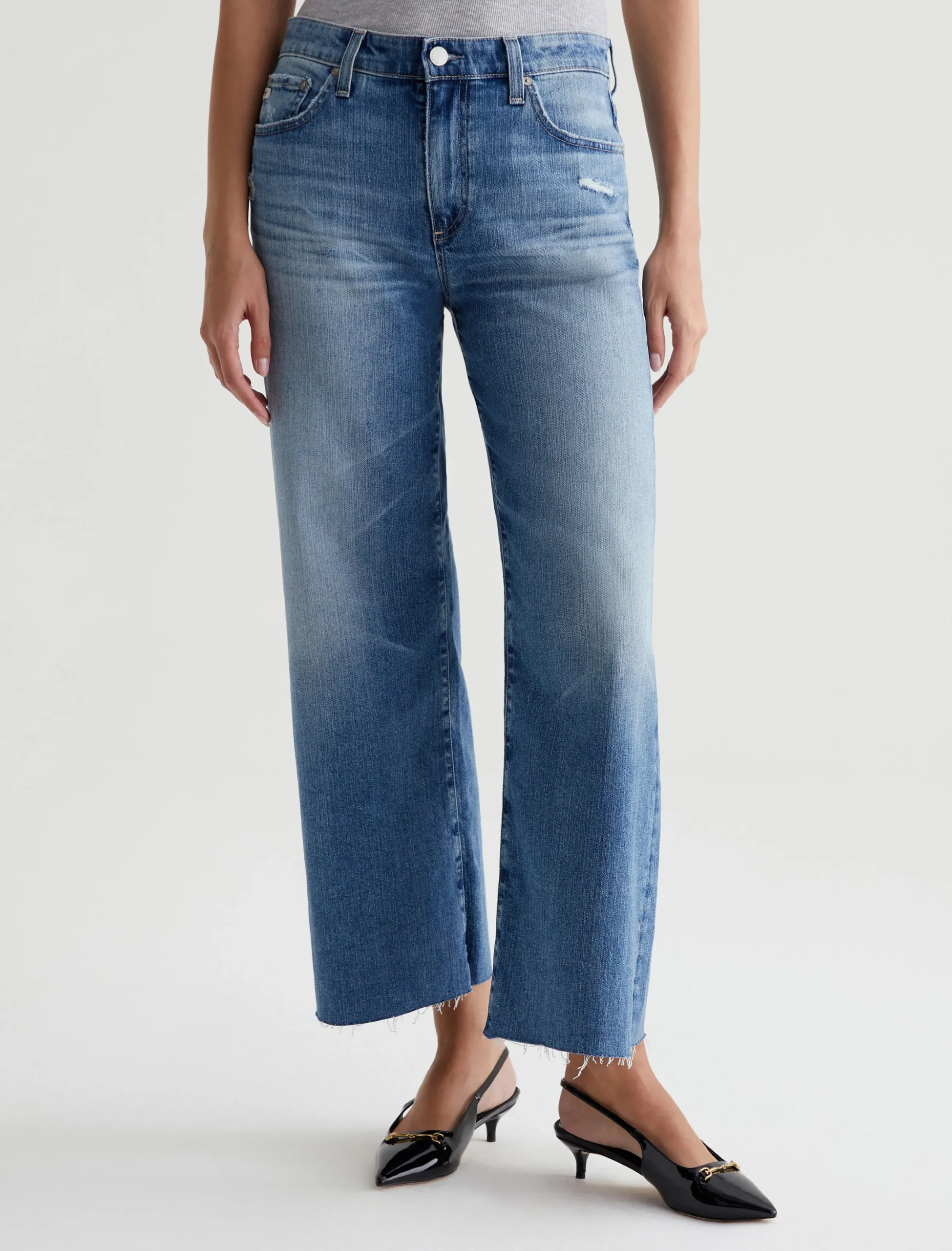 The Saige Wide Leg Crop is a mid-rise jean with loose, cropped legs and raw hems. Made from 11 oz. Lead Denim with comfort stretch, these 5-pocket women’s jeans come in a light indigo wash featuring a 17-year AG-ed™ fade. It’s got whiskering, crease marks, and a bit of distressing at the pockets for a lived-in look.