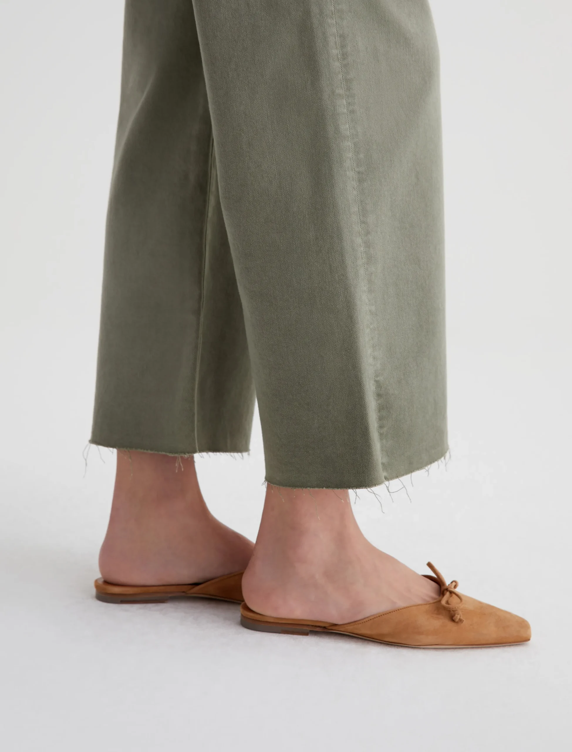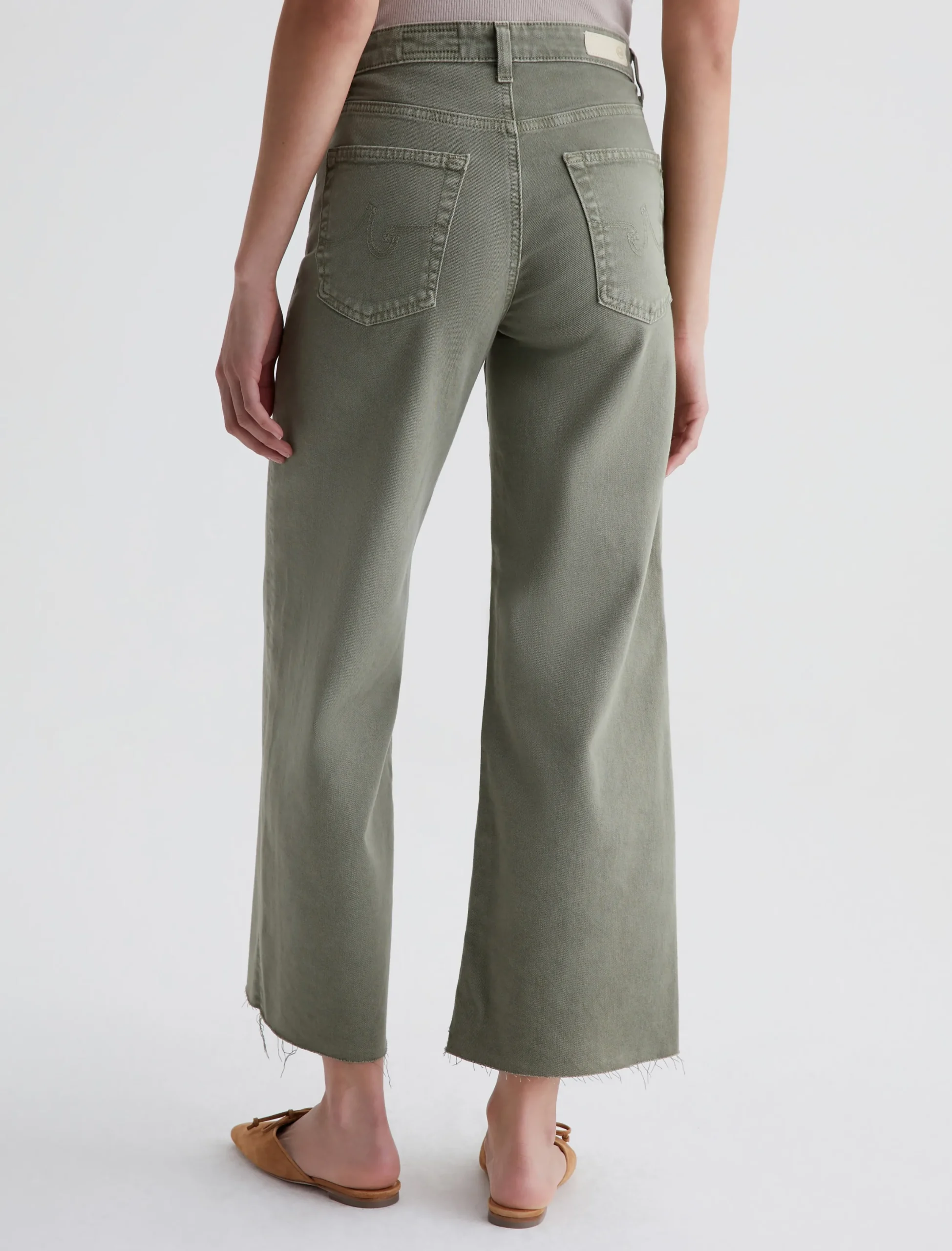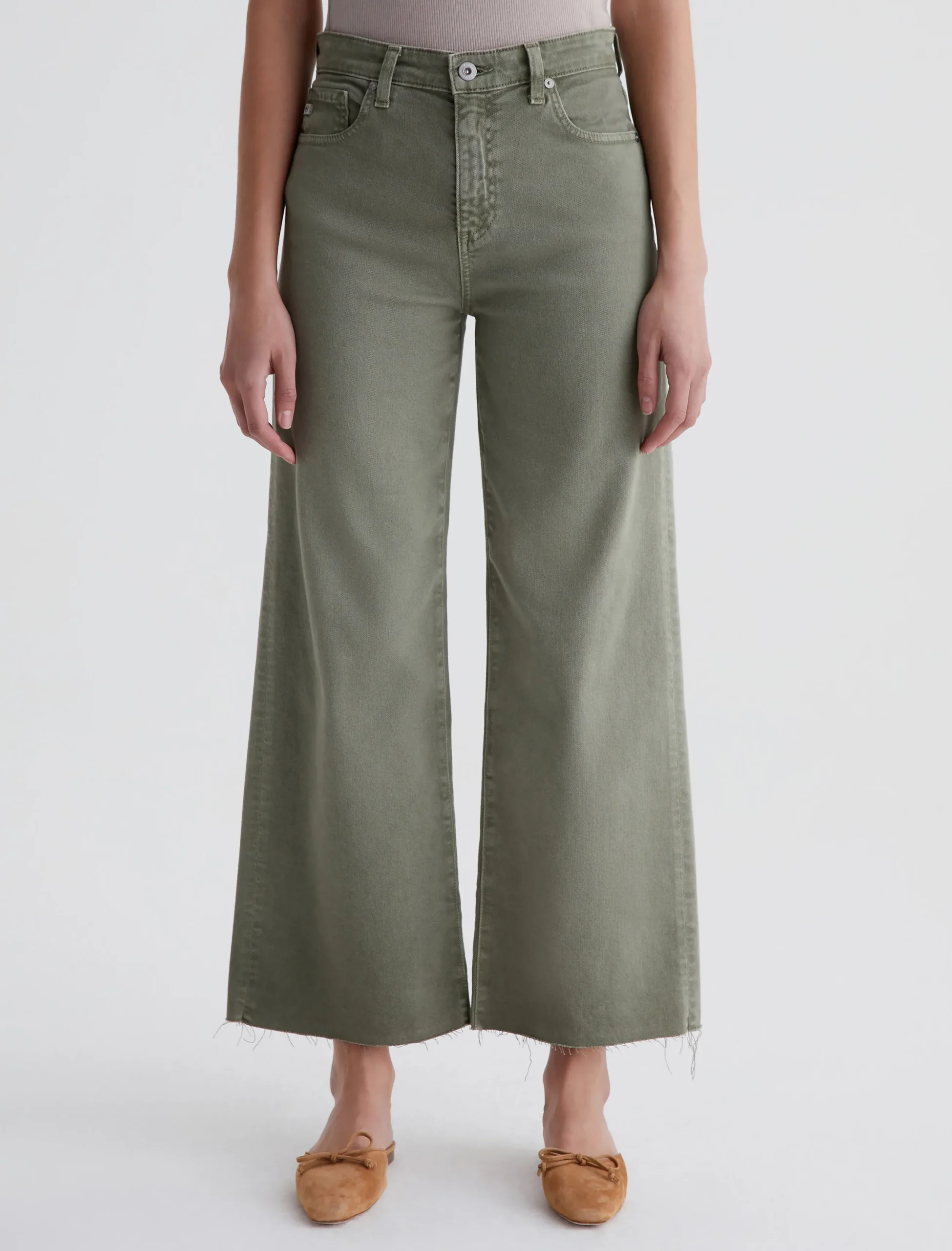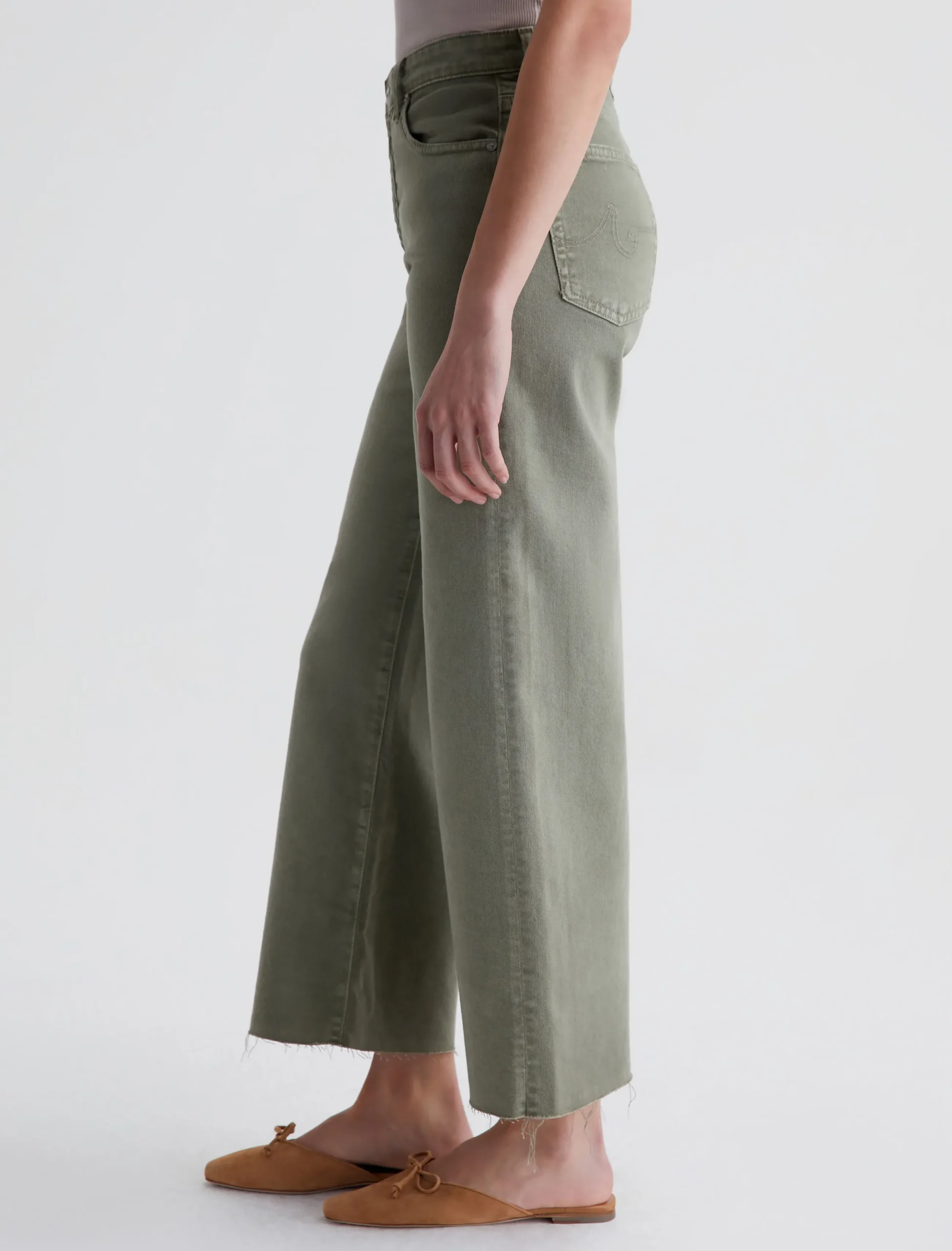 The Saige Wide Leg Crop is a mid-rise jean with loose, cropped legs and raw hems. This 5-pocket pair features our 8.7 oz. Hyper-Soft Bull Denim in a faded olive green shade. AG Cloud Soft Denim™ fabrics have a special left-hand twill construction, allowing the yarns to gently relax and untwist for a supple feel that gets softer with every wear. Dual-elastic stretch offers extra comfort and a resilient shape.