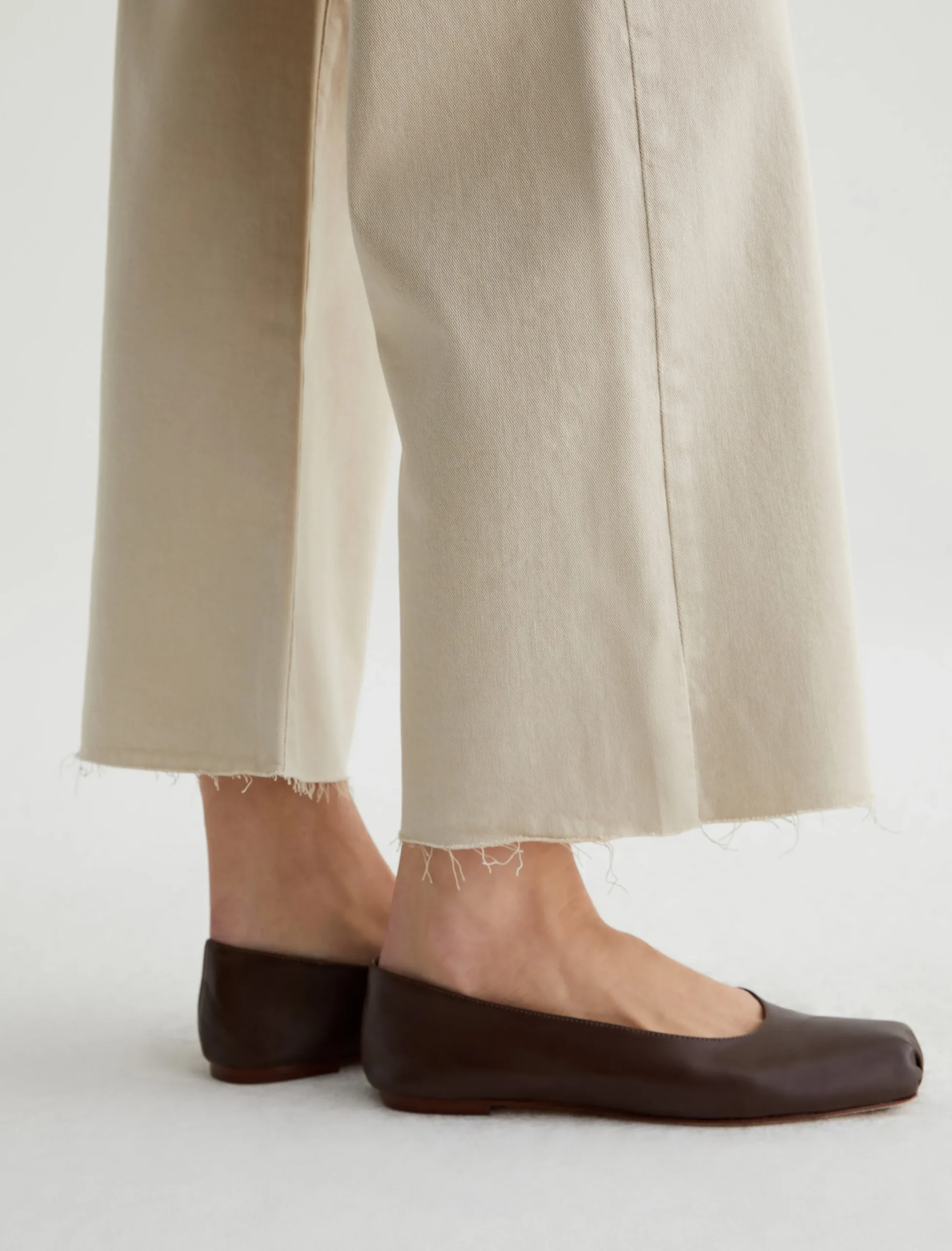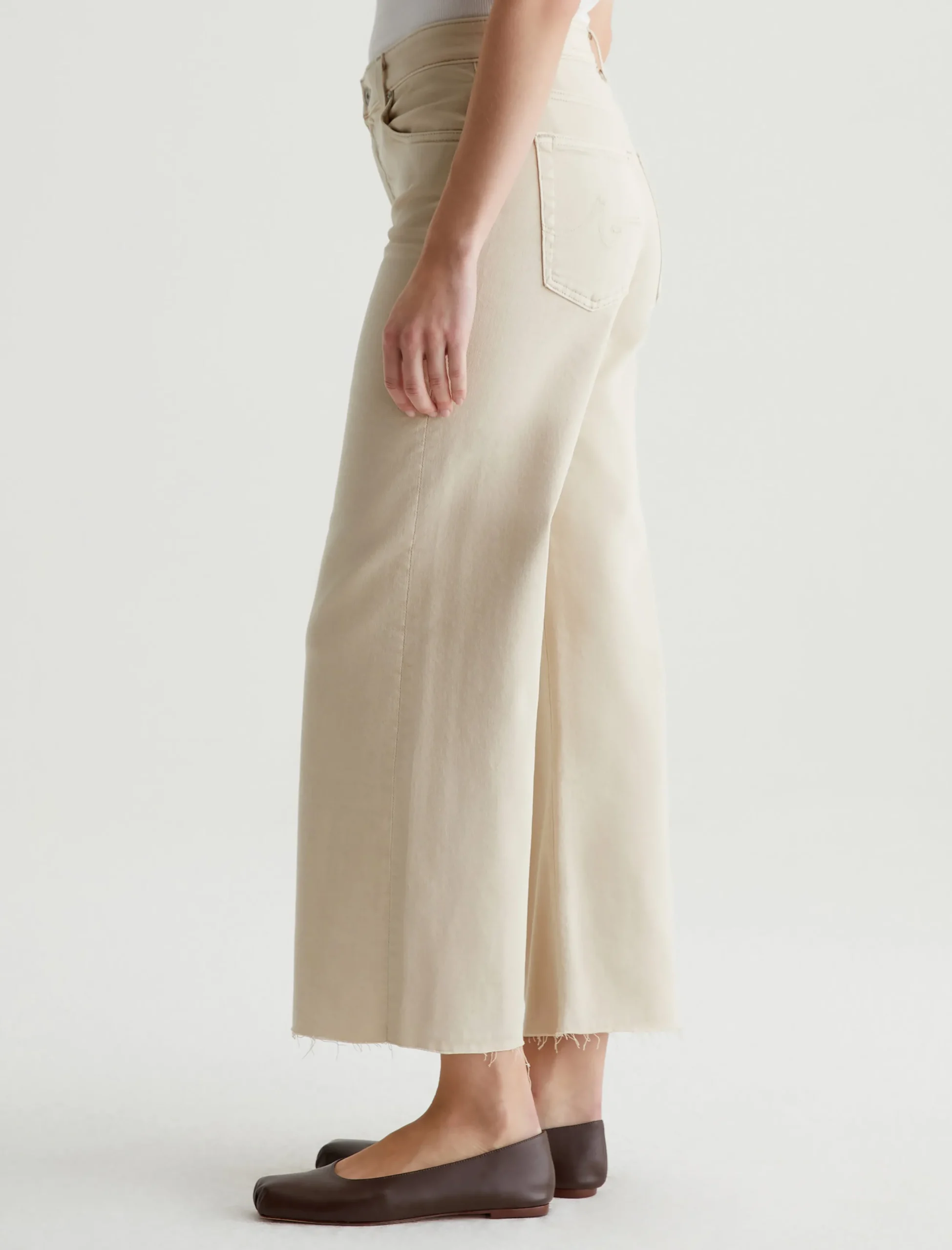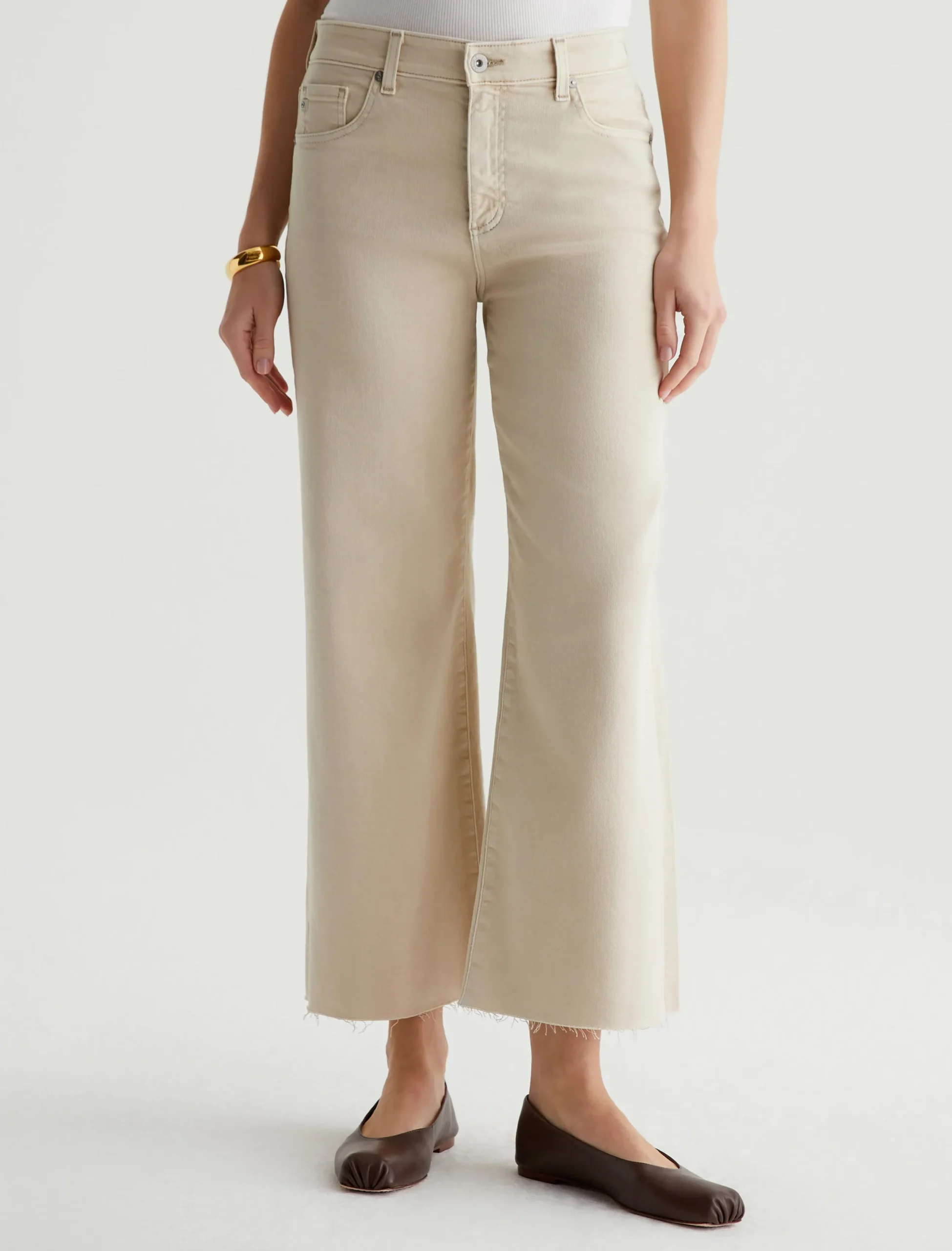The Saige Wide Leg Crop is a mid-rise jean with loose, cropped legs and raw hems. This 5-pocket pair features our 8.7 oz. Hyper-Soft Bull Denim in a sulfur-dyed pale beige shade. AG Cloud Soft Denim™ fabrics have a special left-hand twill construction, allowing the yarns to gently relax and untwist for a supple feel that gets softer with every wear. Dual-elastic stretch offers extra comfort and a resilient shape.