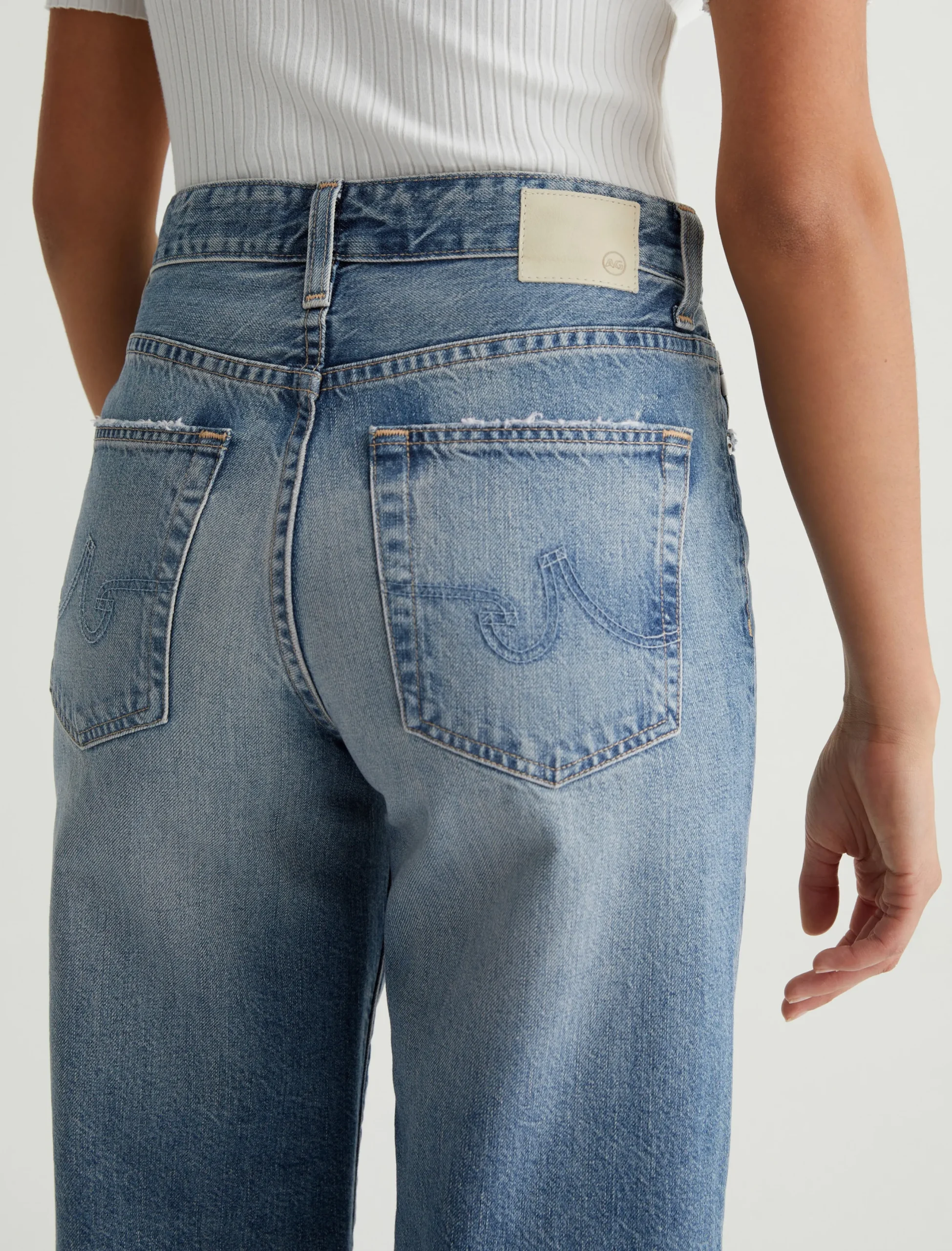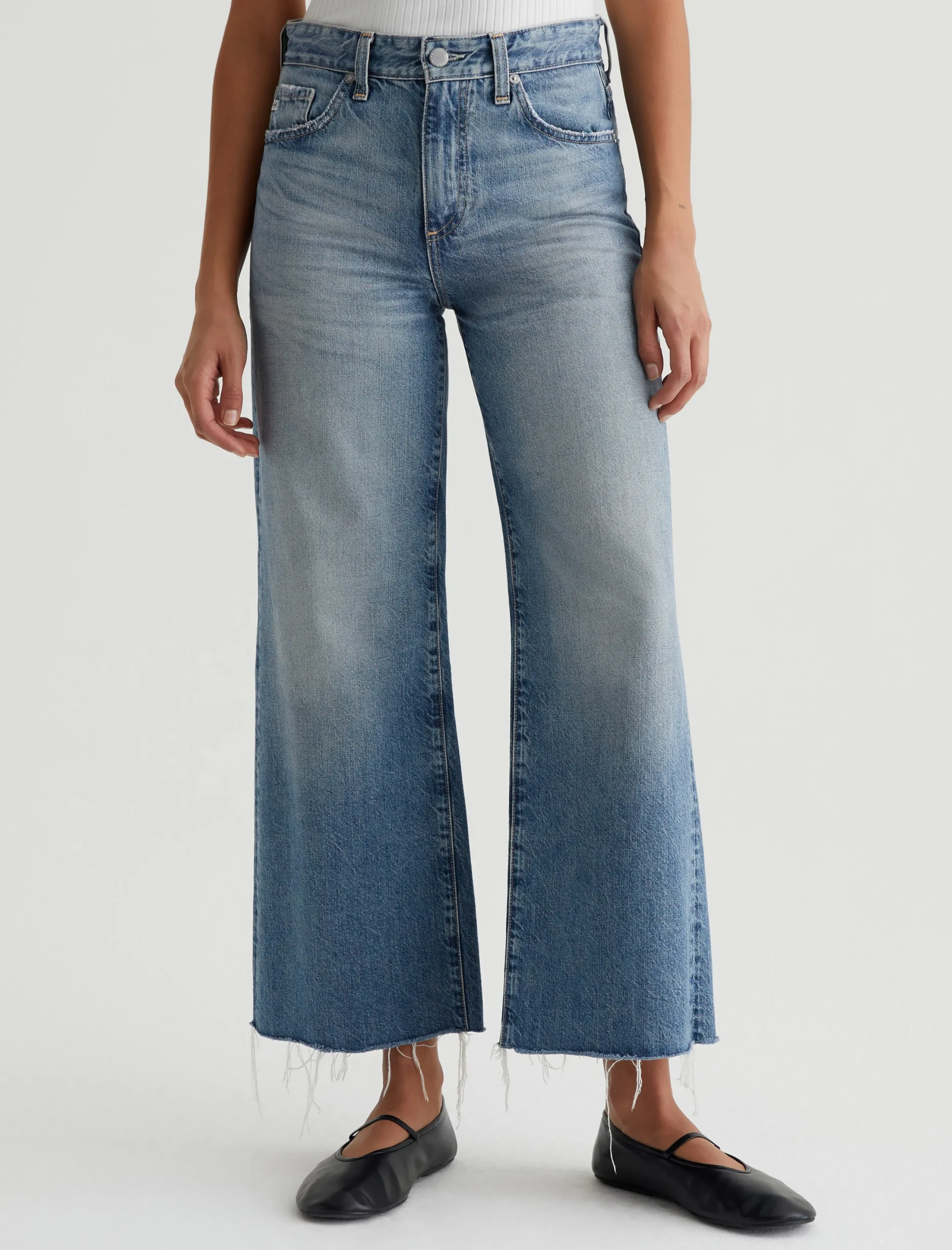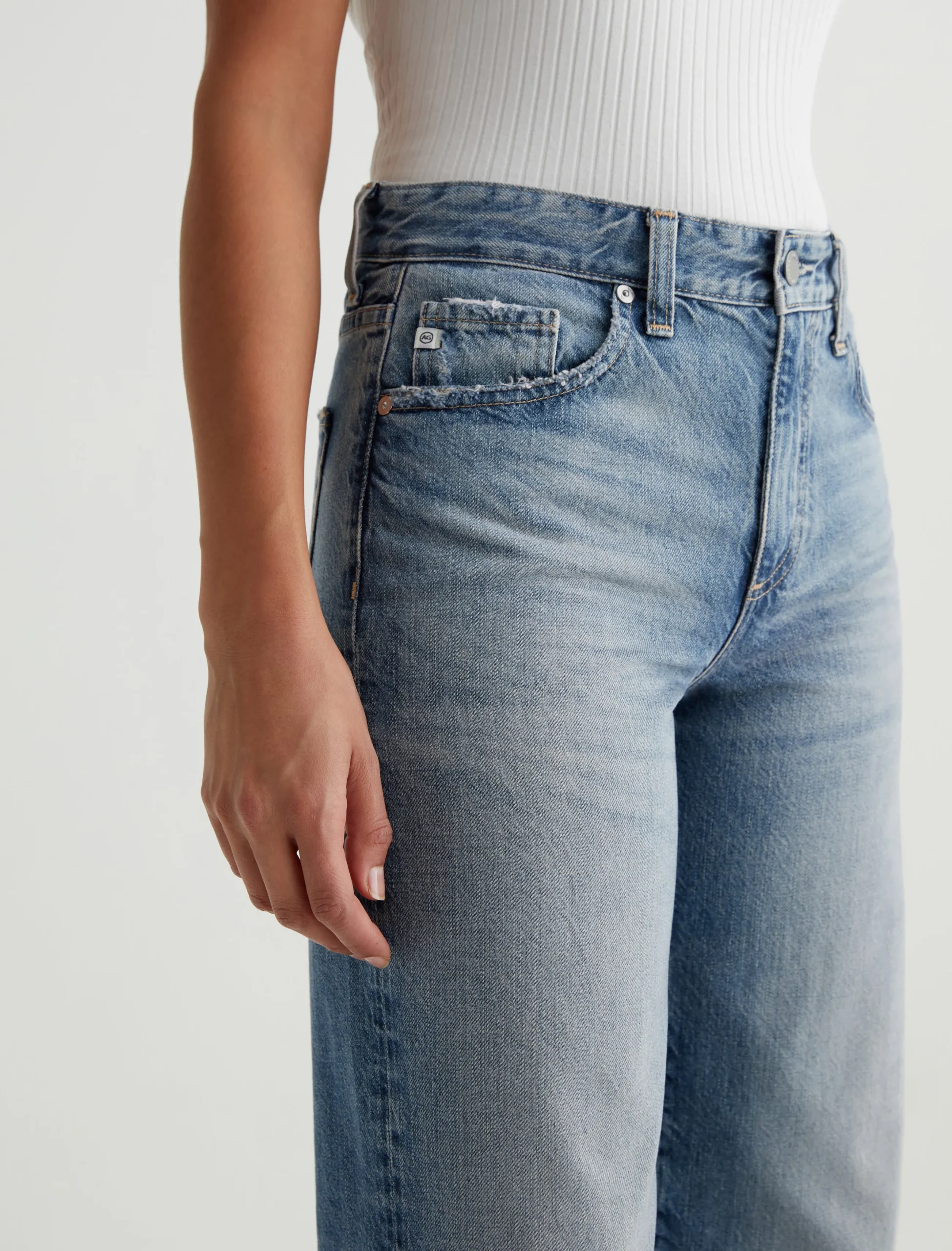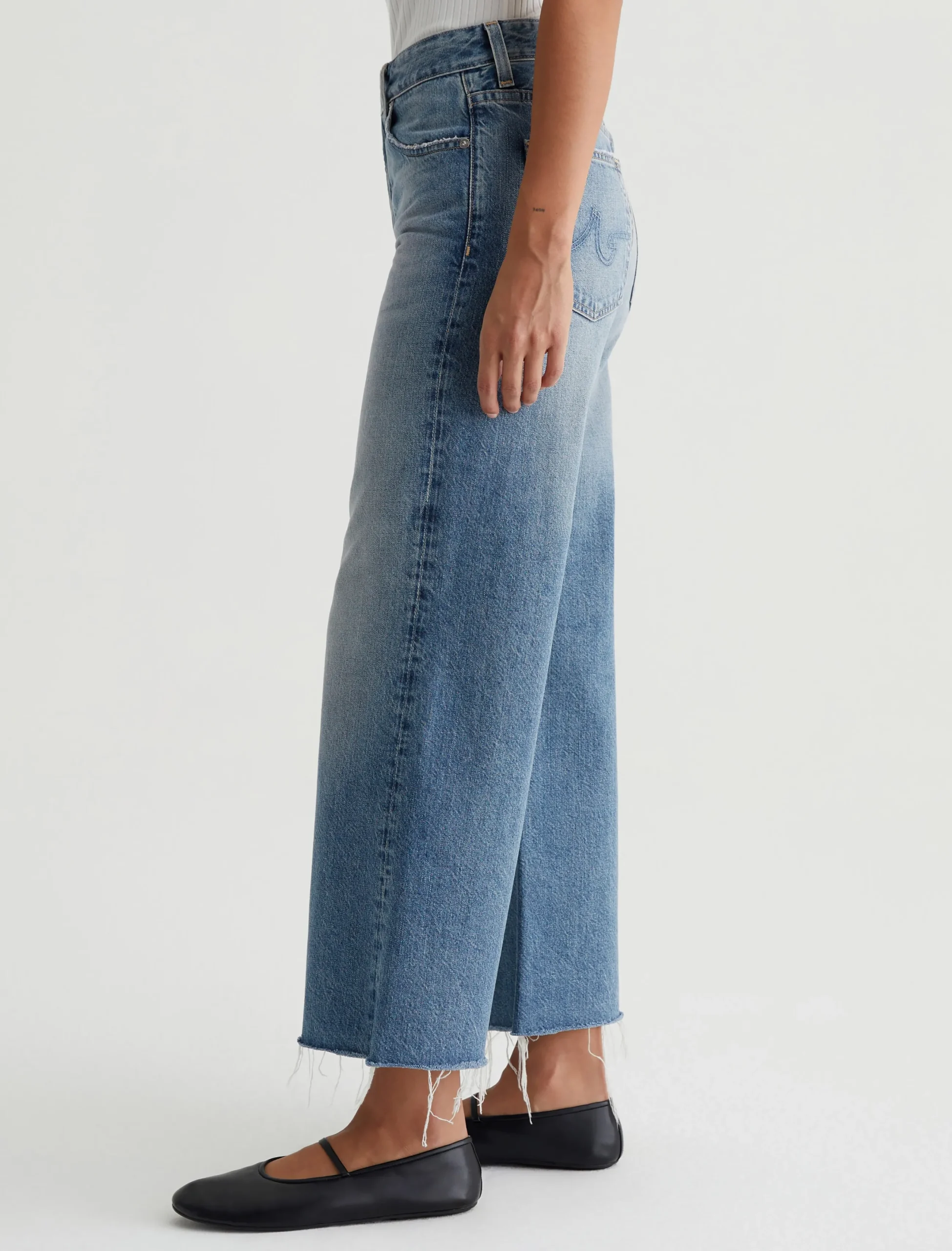 Our Saige Wide Leg Crop features a mid-rise waist and loose, cropped legs with softly frayed raw hems. It’s crafted from rigid 11.75 oz. Legion Denim in a light blue wash with heavy fading.