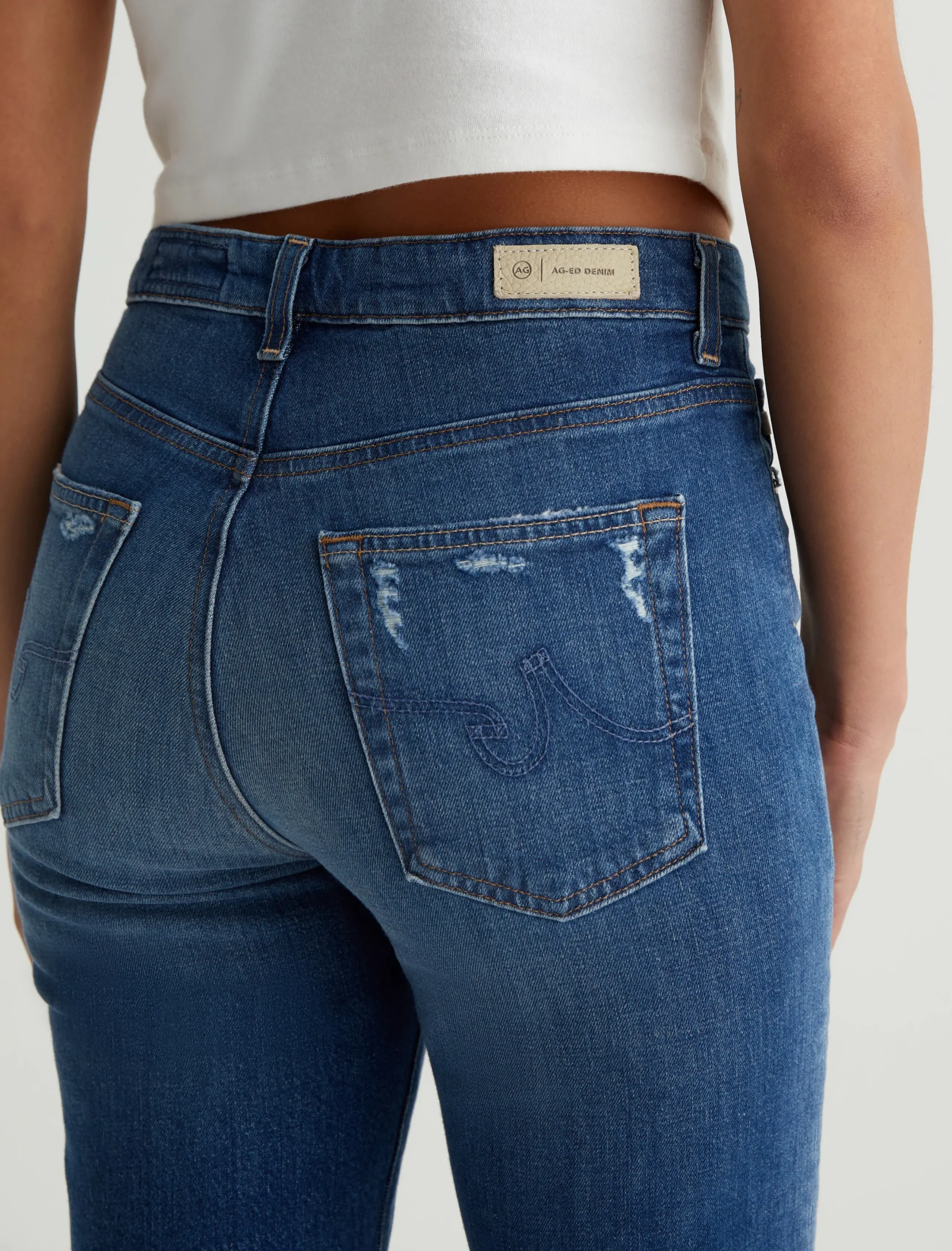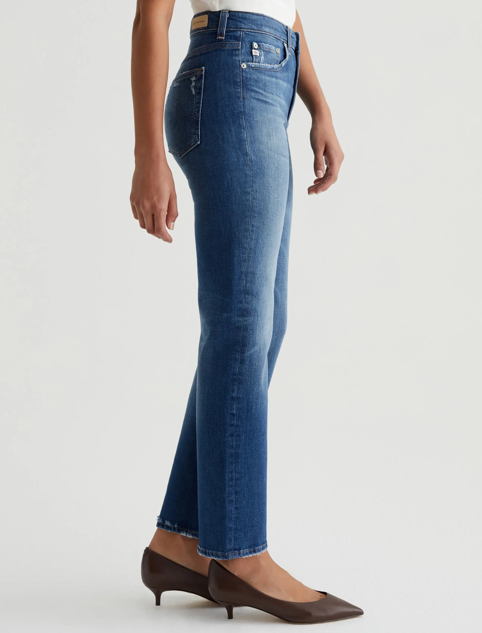 Saige is a women’s mid-rise straight jean, done here in a medium blue wash with a 14-year AG-ed™ Denim finish. Whiskering and touches of distressing at the pockets and hems add a naturally lived-in appearance. Made from 11 oz. Journey Denim, these five-pocket jeans have stretch built in for enhanced comfort.