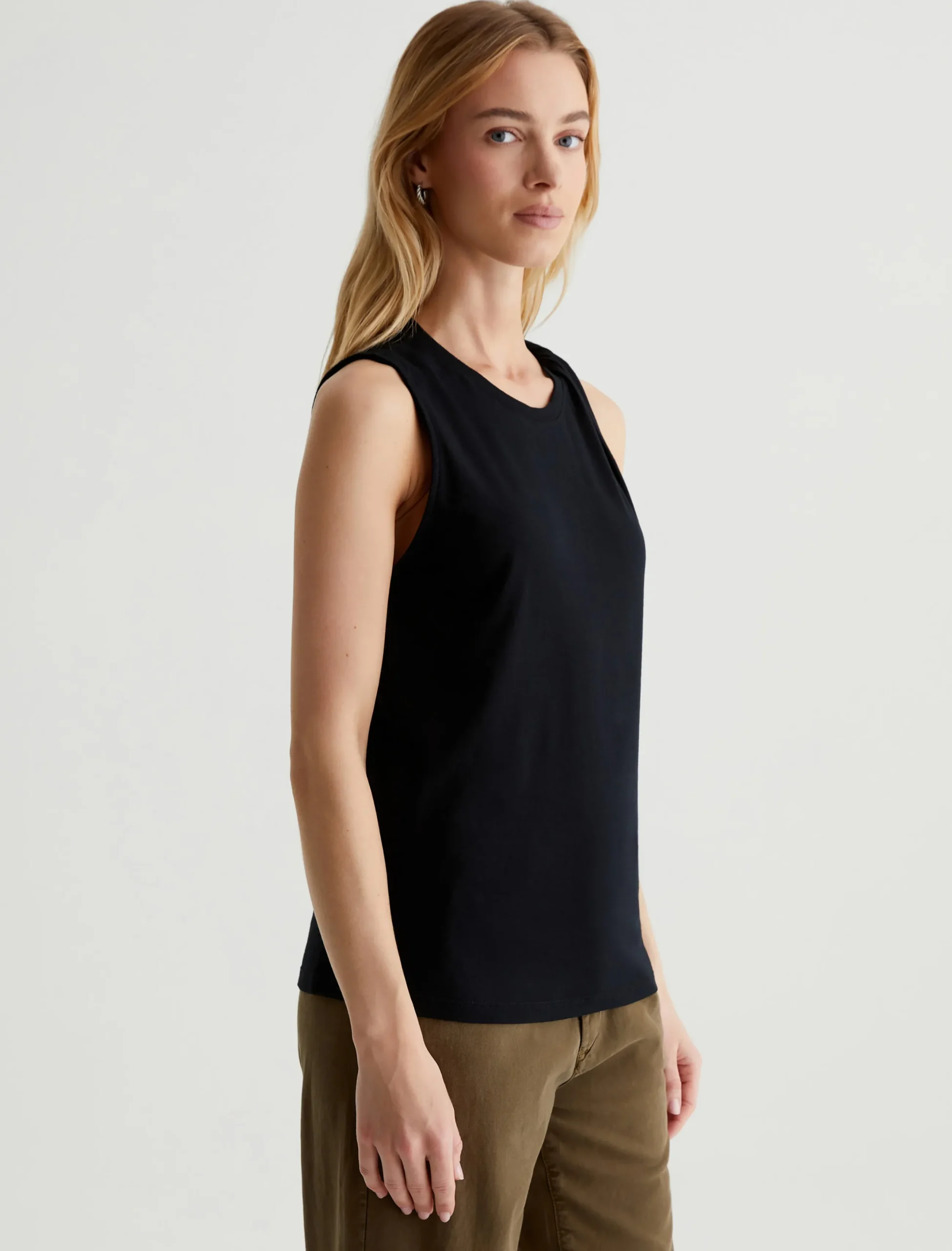 The Sato Tank’s asymmetrical twist detail on the left shoulder lends a novel approach to the classic muscle tee. Done in classic black, it’s made from stretch-blend Luxe Comfort Jersey for a soft, easy feel.
