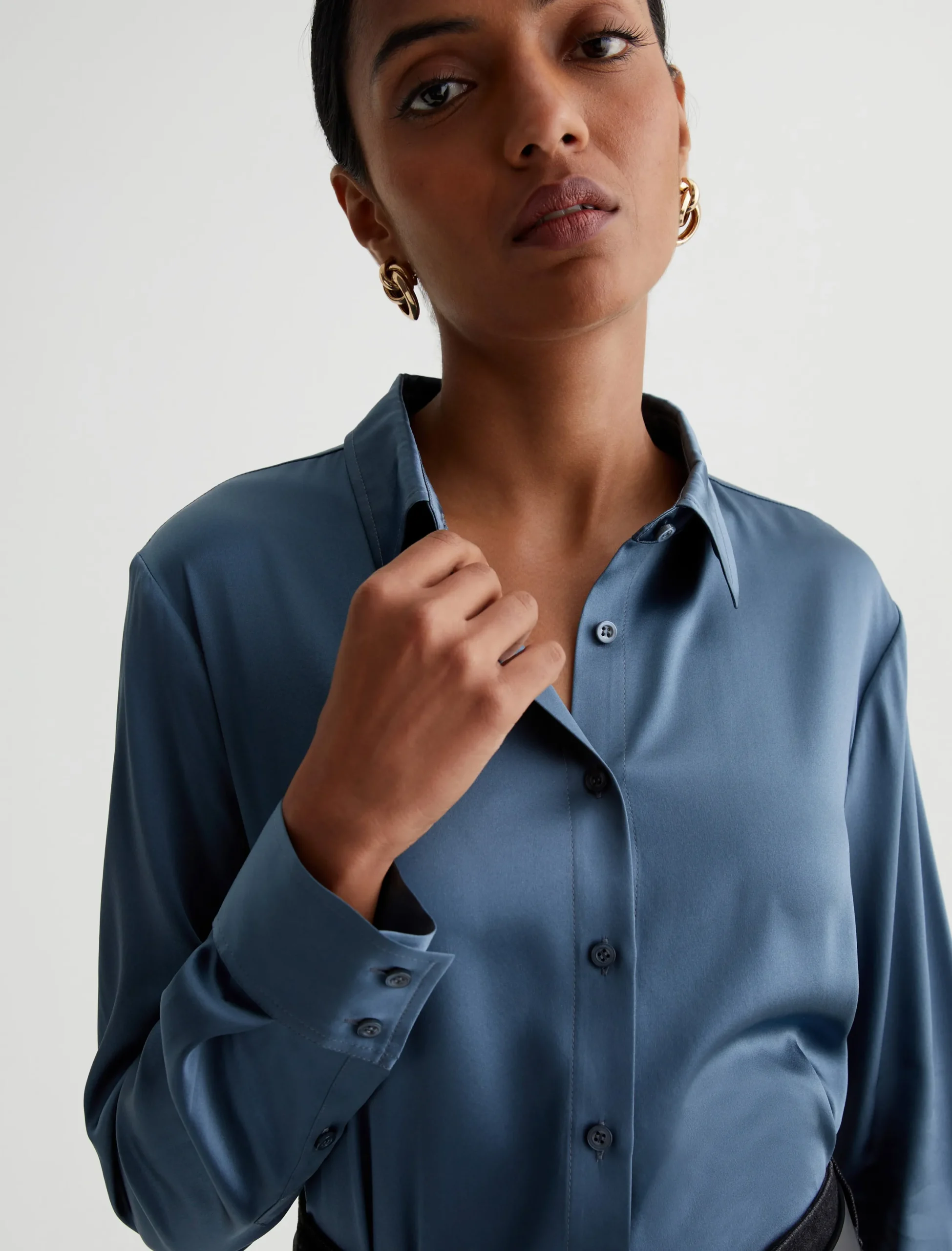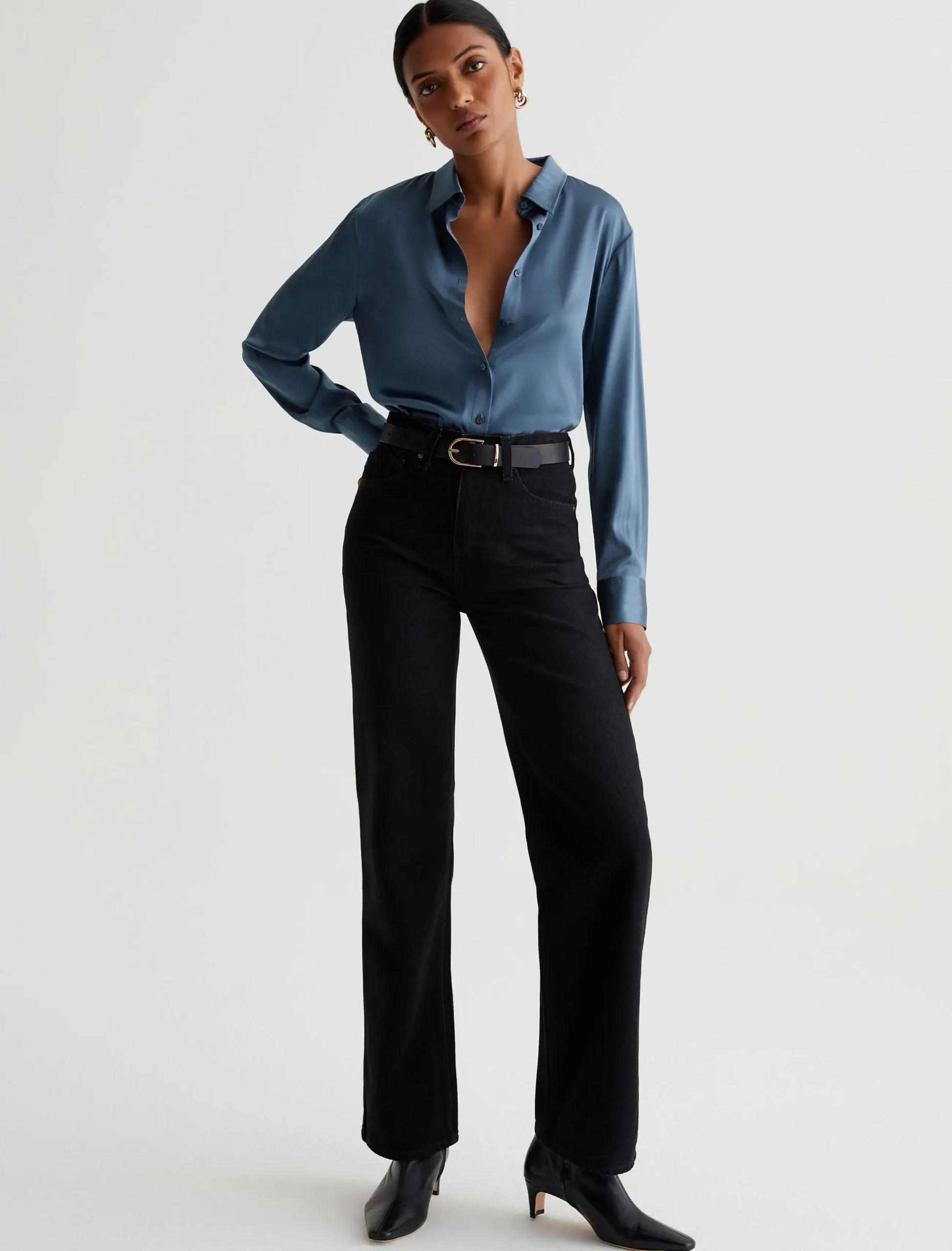 The Shiela button-up shirt is an AG favorite elevated by luxurious stretch silk in blue. The long-sleeve style has a classic fit with pointed collar and an exposed button placket. An easy piece to dress up or wear with jeans for a more casual look.