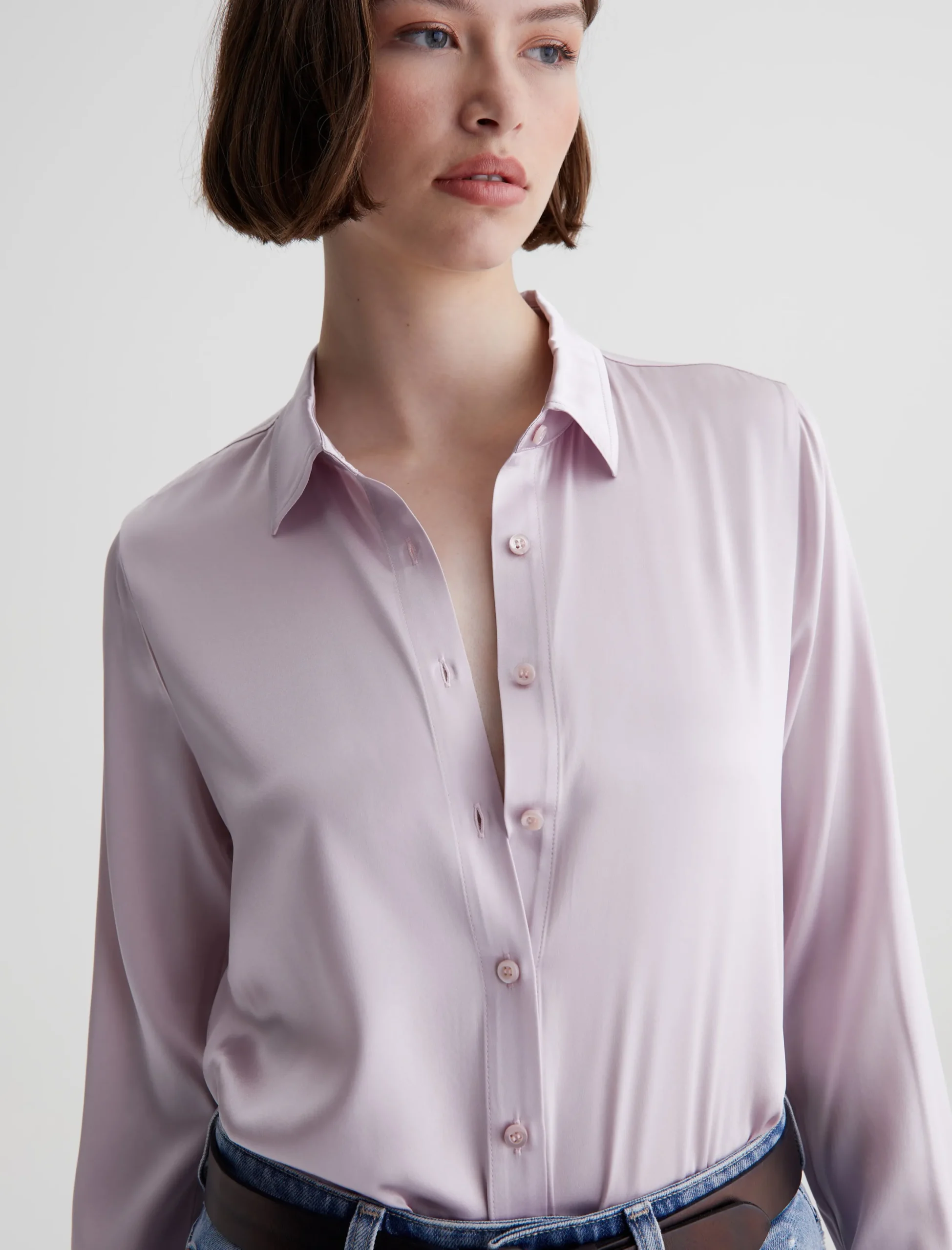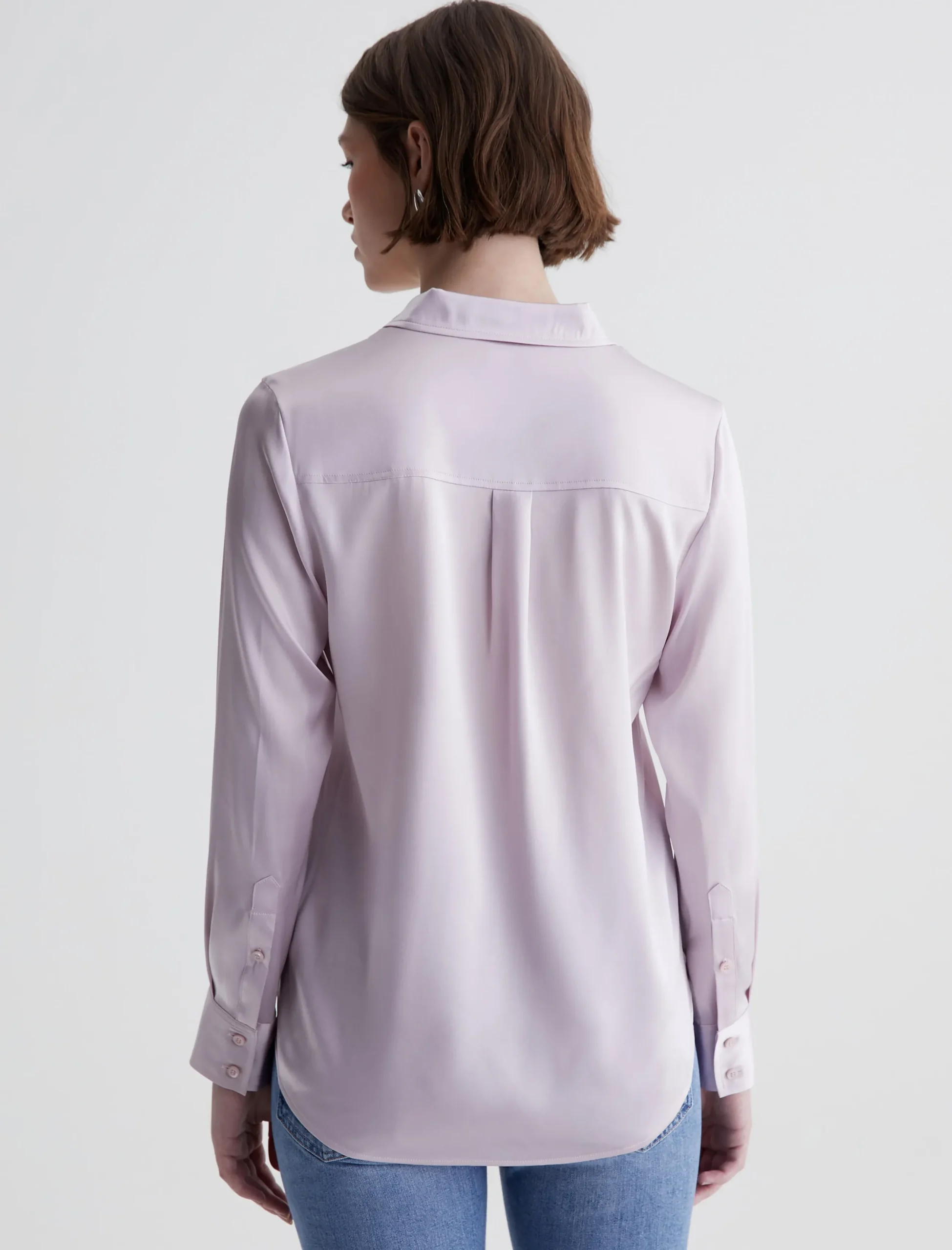The Shiela button-up shirt is an AG favorite elevated by luxurious stretch silk in a pale purple hue. The long-sleeve style has a classic fit with pointed collar and an exposed button placket. An effortless piece to dress up or down.