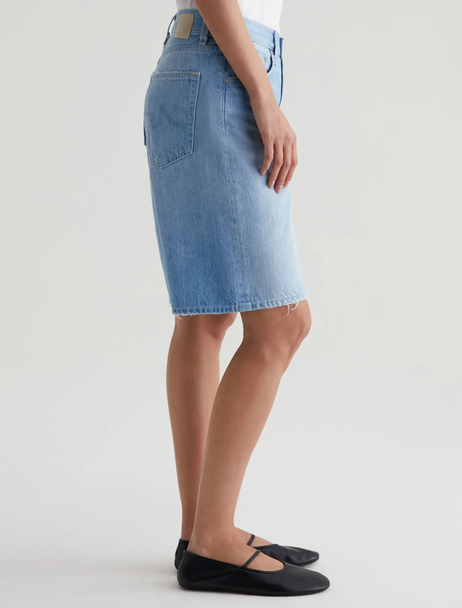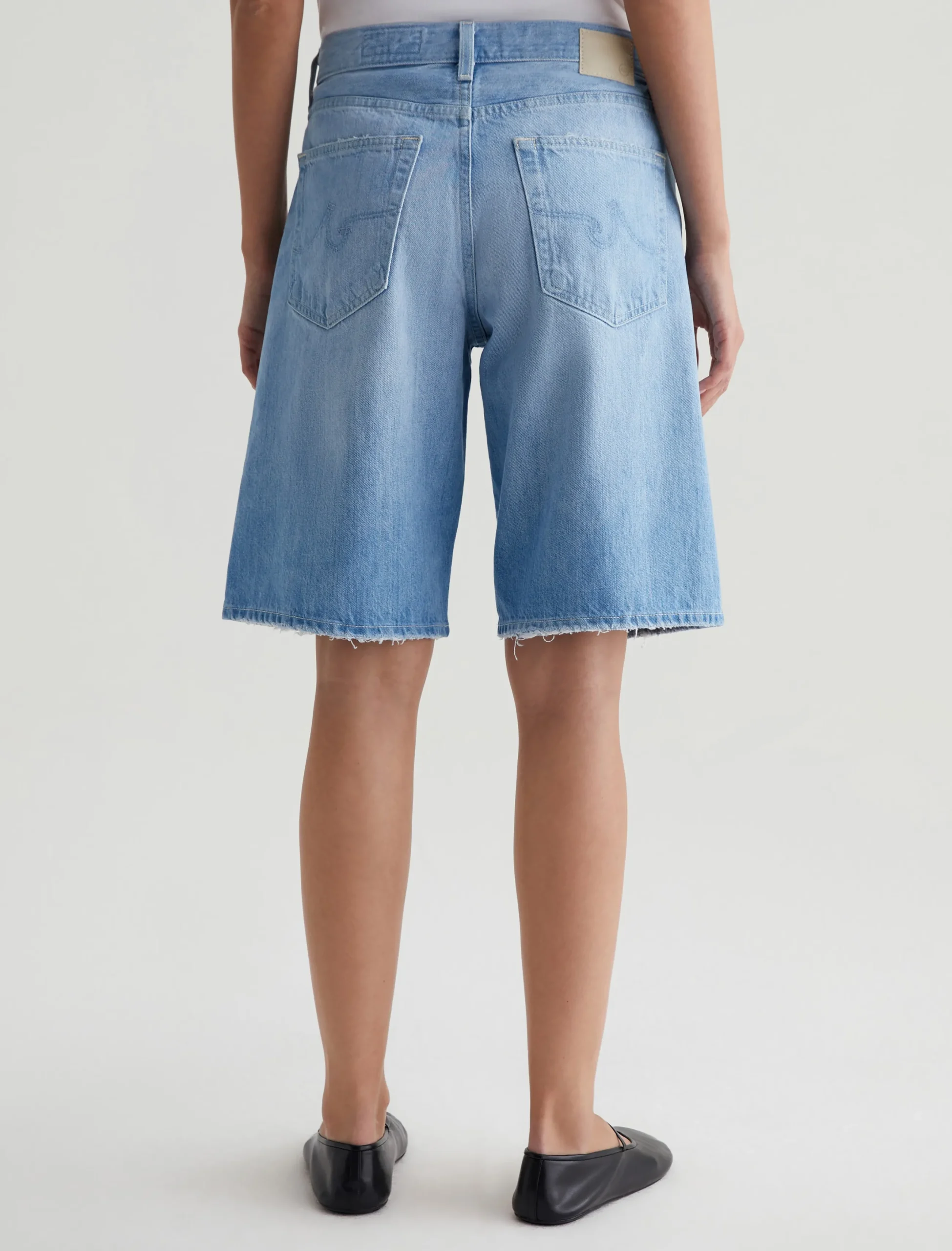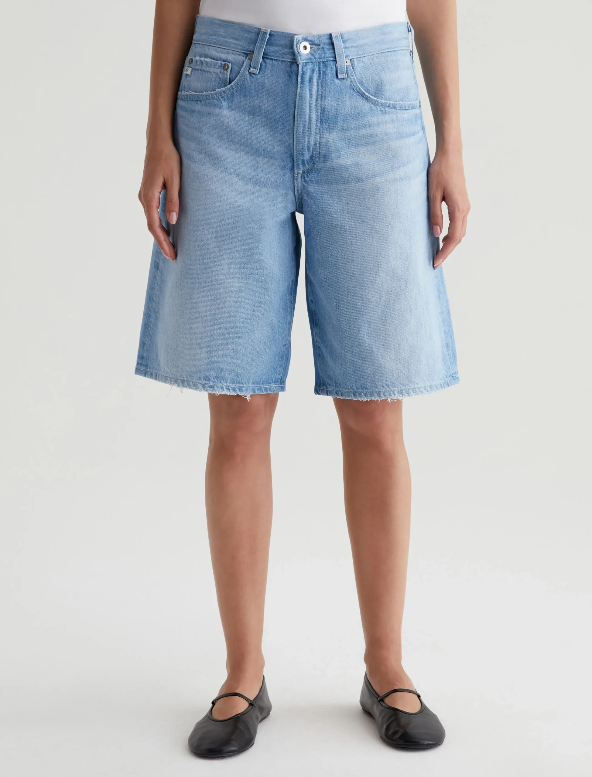 Our Thalia wide-leg bermuda shorts have a low-slung waist and a slouchy fit. Cut from 13 oz. Sioux Rigid Denim in 100% cotton, this five-pocket style features a light indigo wash with faded whiskers and gently worn edges.