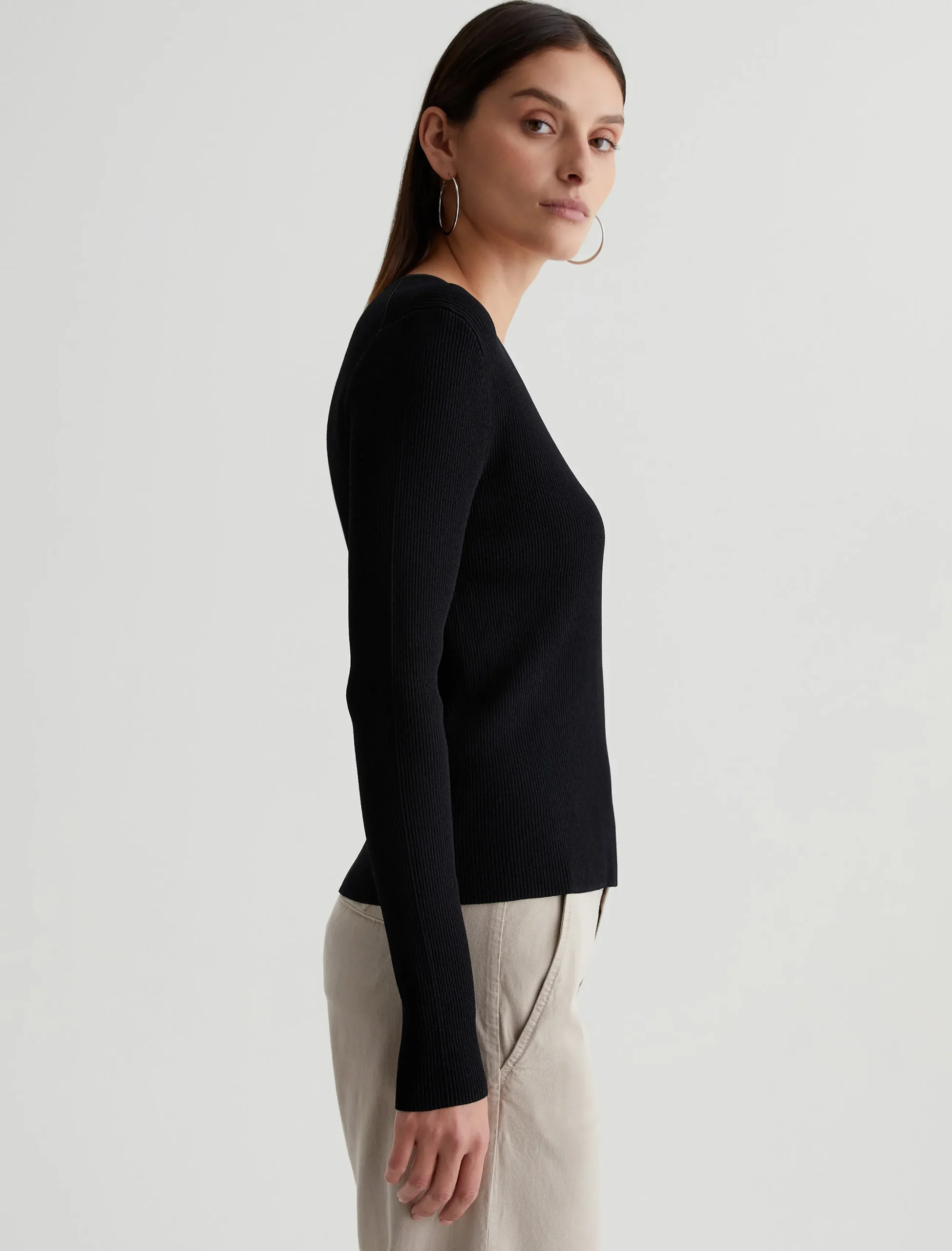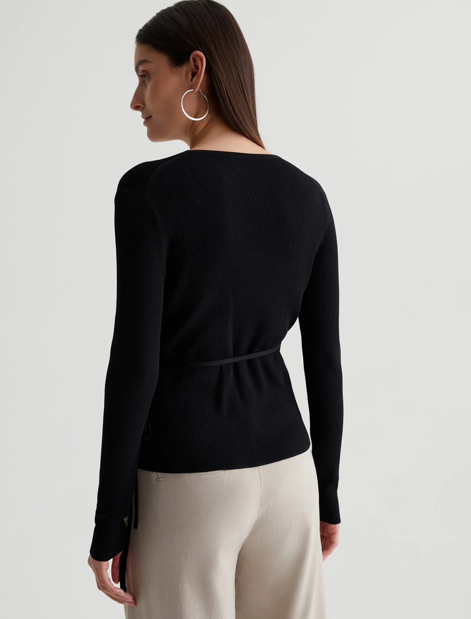 The Yukiko classic-fit wrap sweater in black boasts a slightly cropped silhouette enriched with a ribbed texture. The long-sleeve style is detailed with a customizable tie waist, allowing you to personalize the fit.