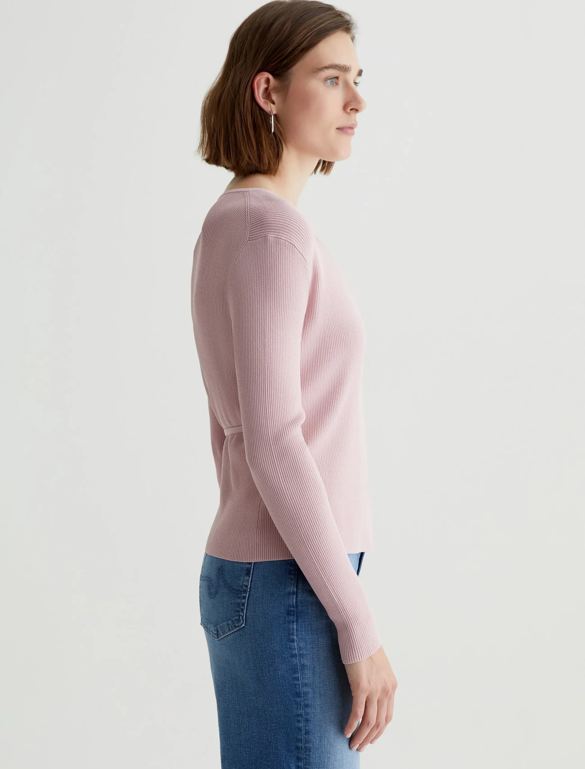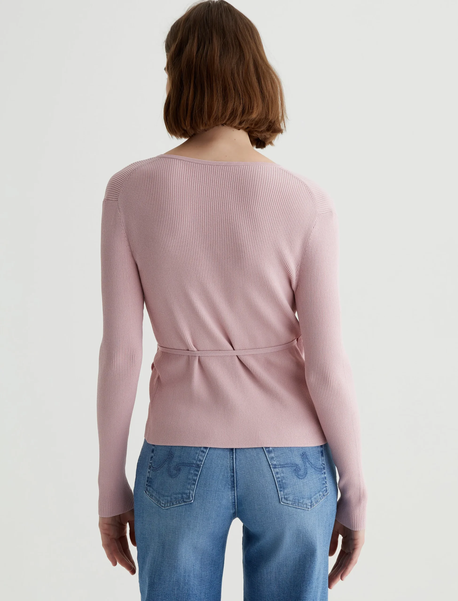 The Yukiko classic-fit wrap sweater in pale pink boasts a slightly cropped silhouette enriched with a ribbed texture. The long-sleeve style is detailed with a customizable tie waist, allowing you to personalize the fit.