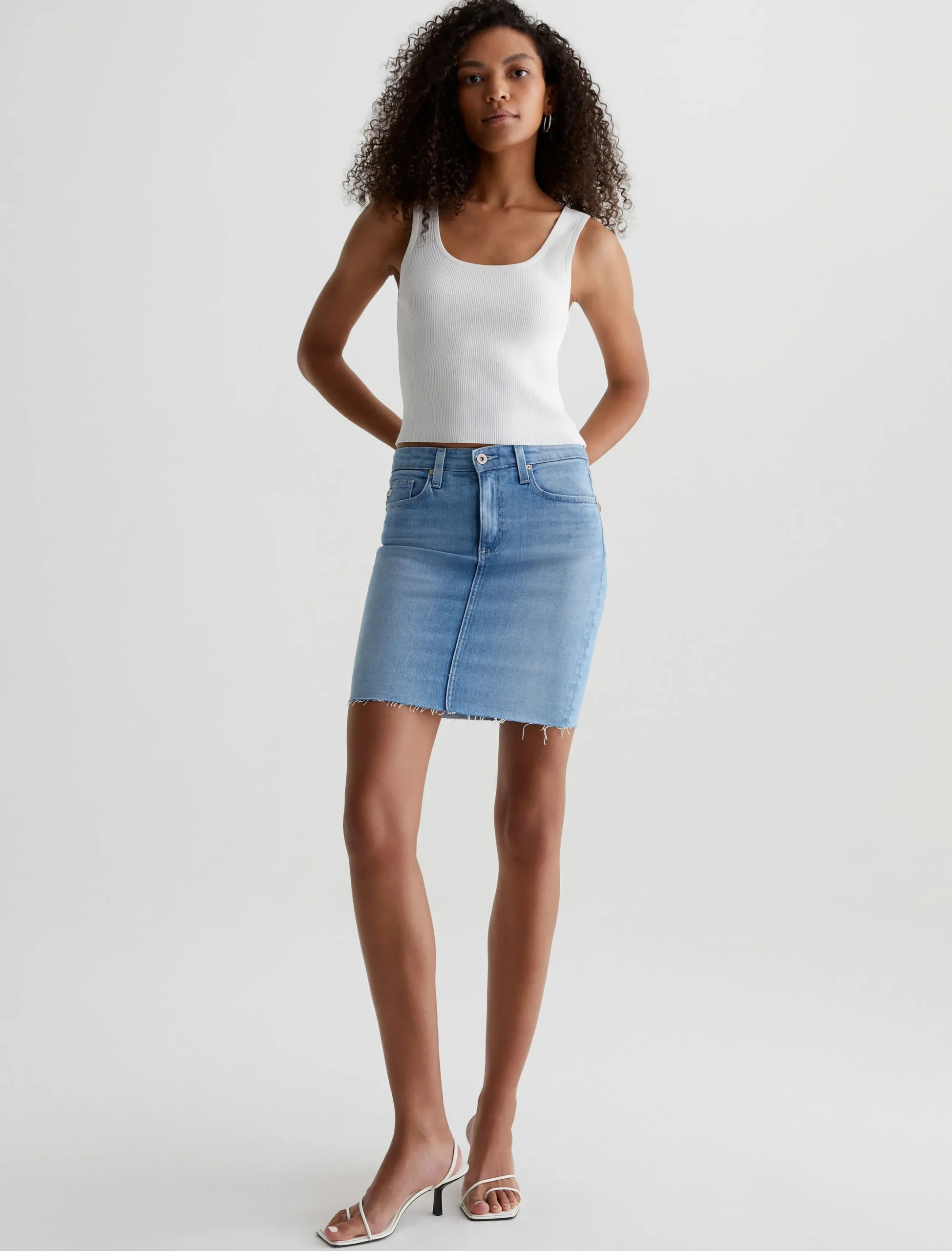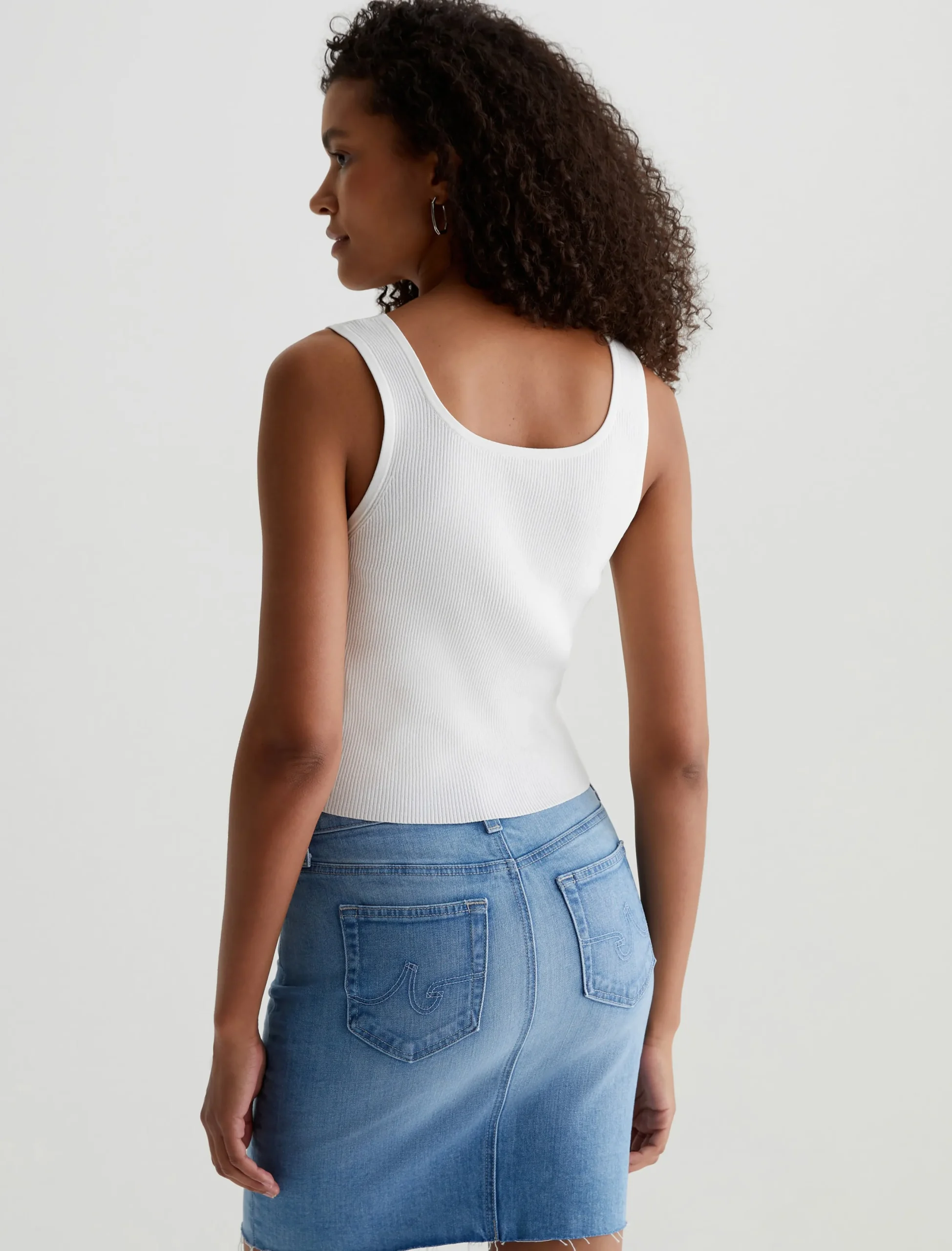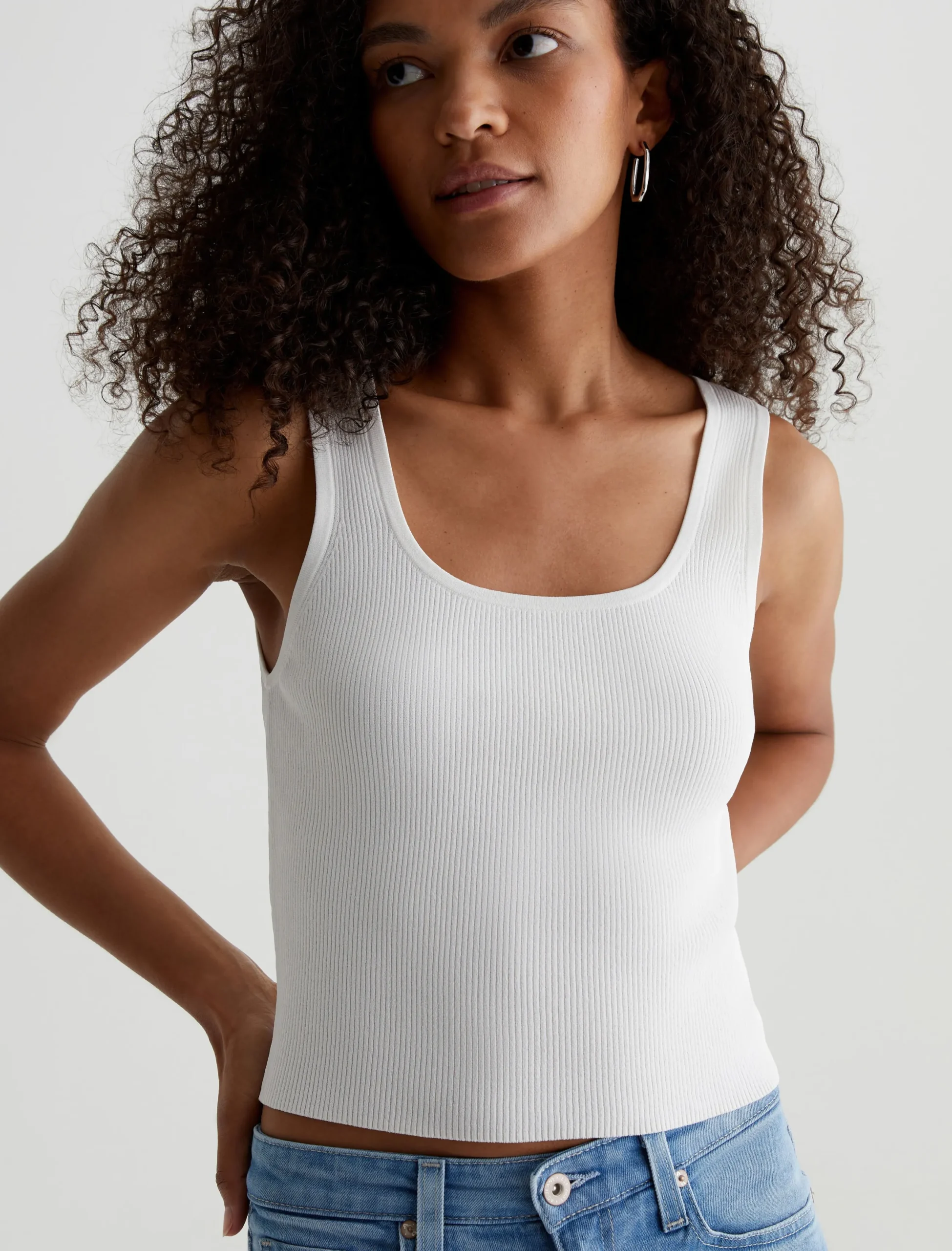 The Yuri fitted tank embodies chic sophistication, offering a sleek, formfitting design in a shorter length that grazes the upper hip. Defined by a flattering scoop neckline, it’s crafted from ribbed Luxe Loom Viscose fabric in powder white.