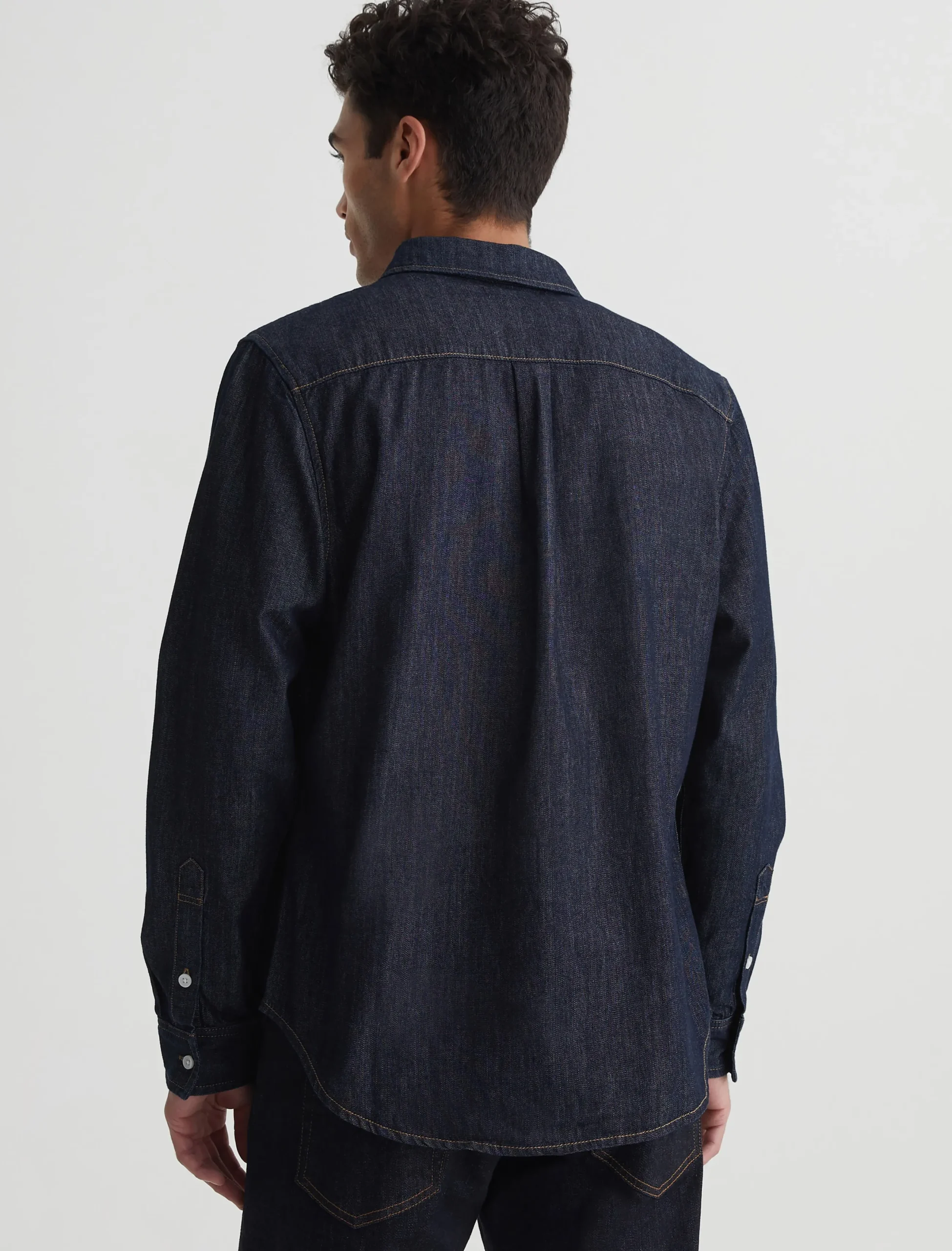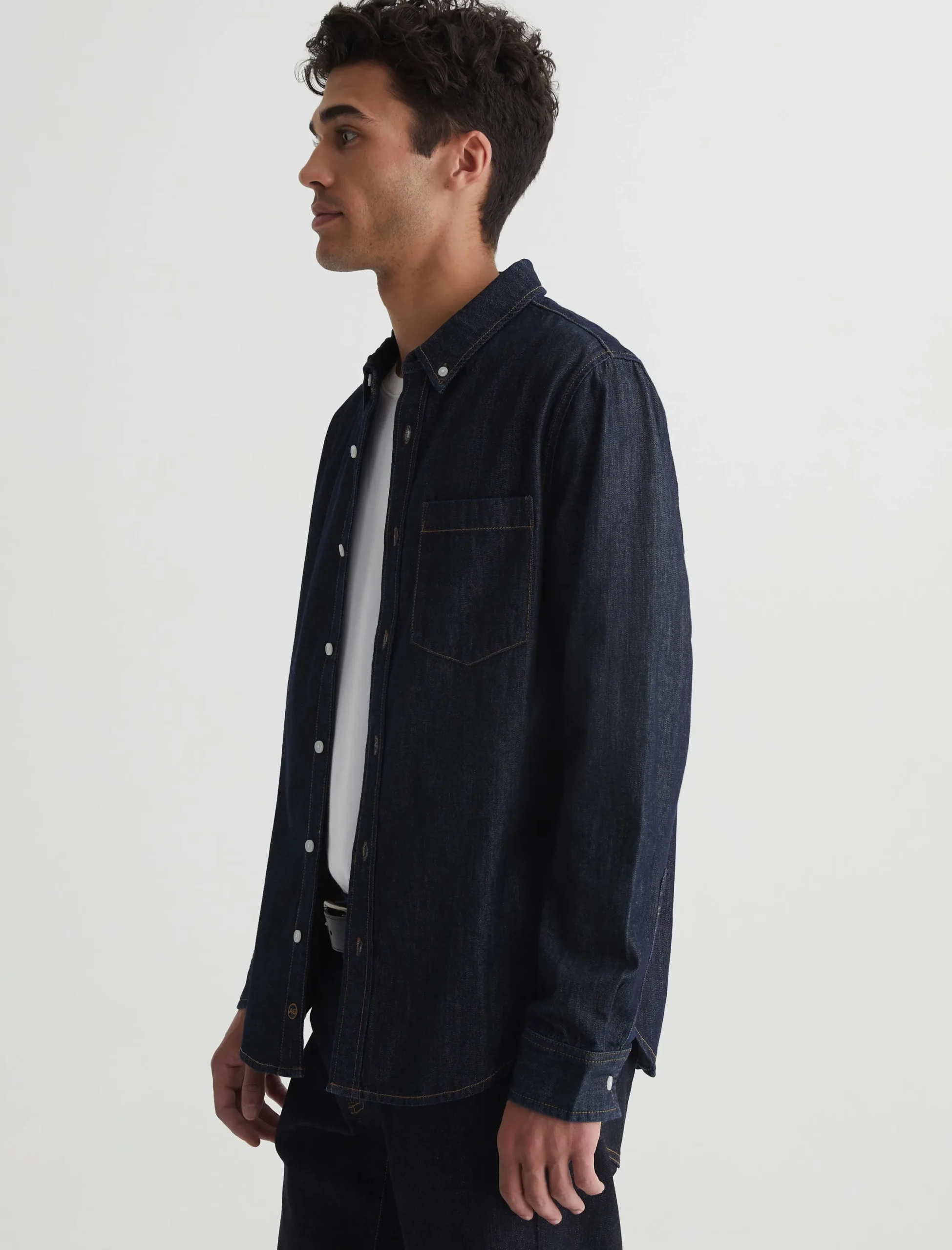 The Aiden Classic Shirt for men features a dark denim wash. The Aiden Classic Shirt features a single front chest pocket, gentle fading, and white buttons, designed in a comfortable and lightweight Cove Denim.