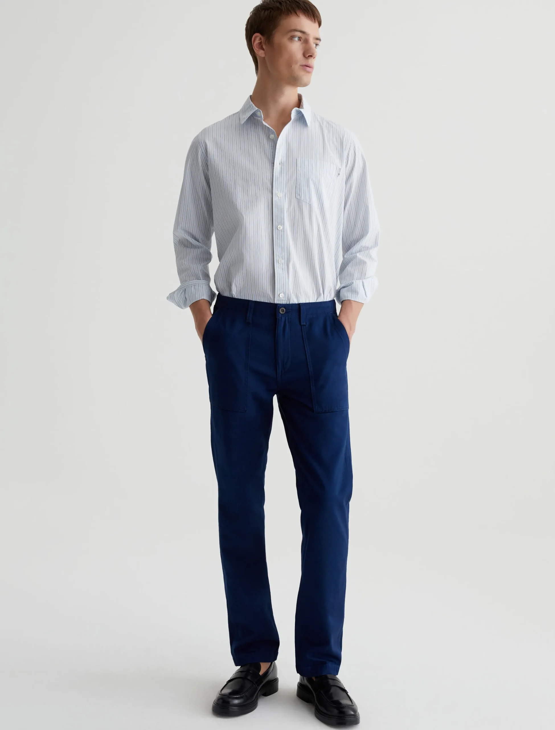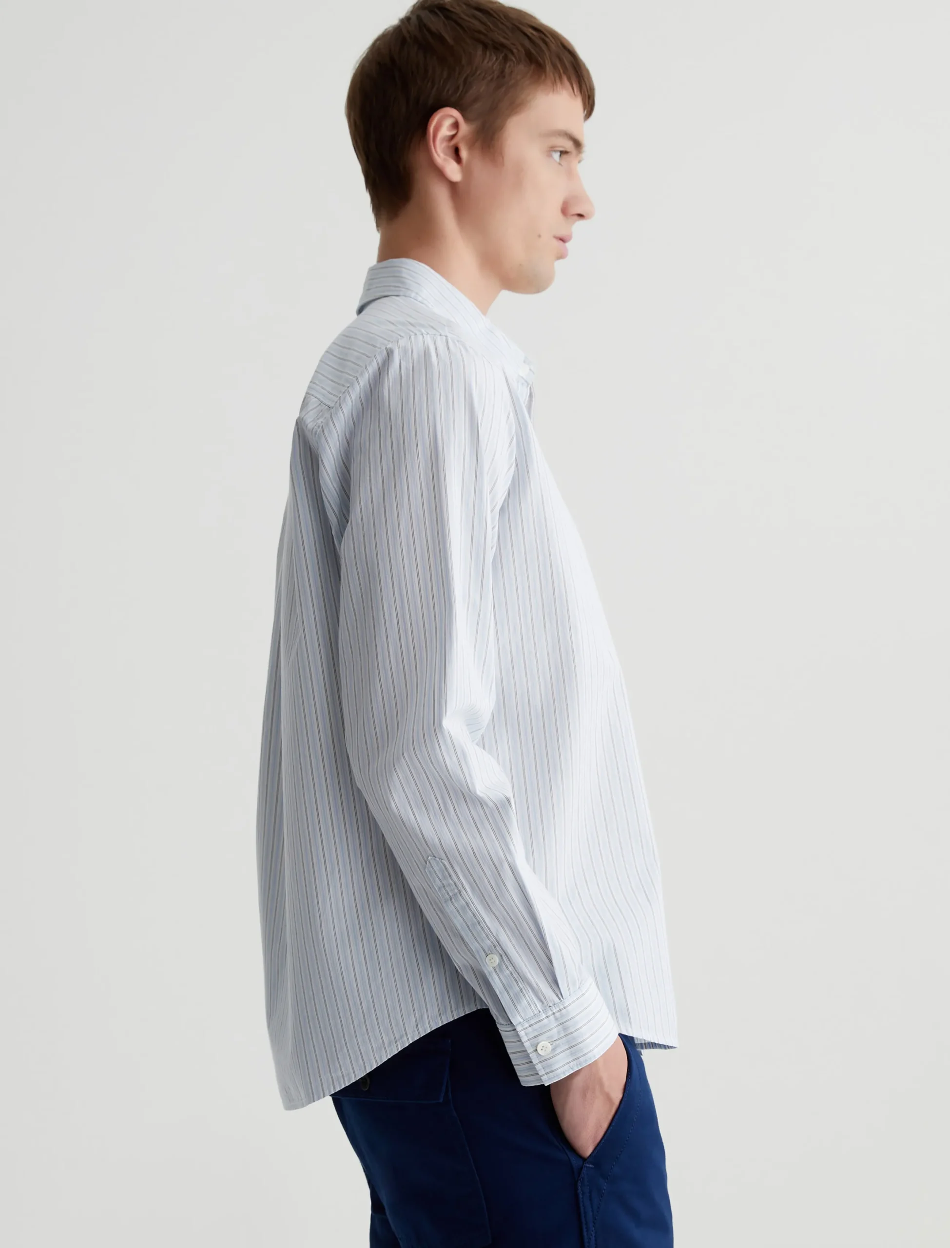 The Aiden Shirt is cut from crisp cotton poplin patterned with blue and grey stripes. This men’s shirt is cut for a classic fit with long sleeves, a pointed collar, and buttons down the front placket. It’s got a shirttail hem, plus a single patch pocket at the chest.