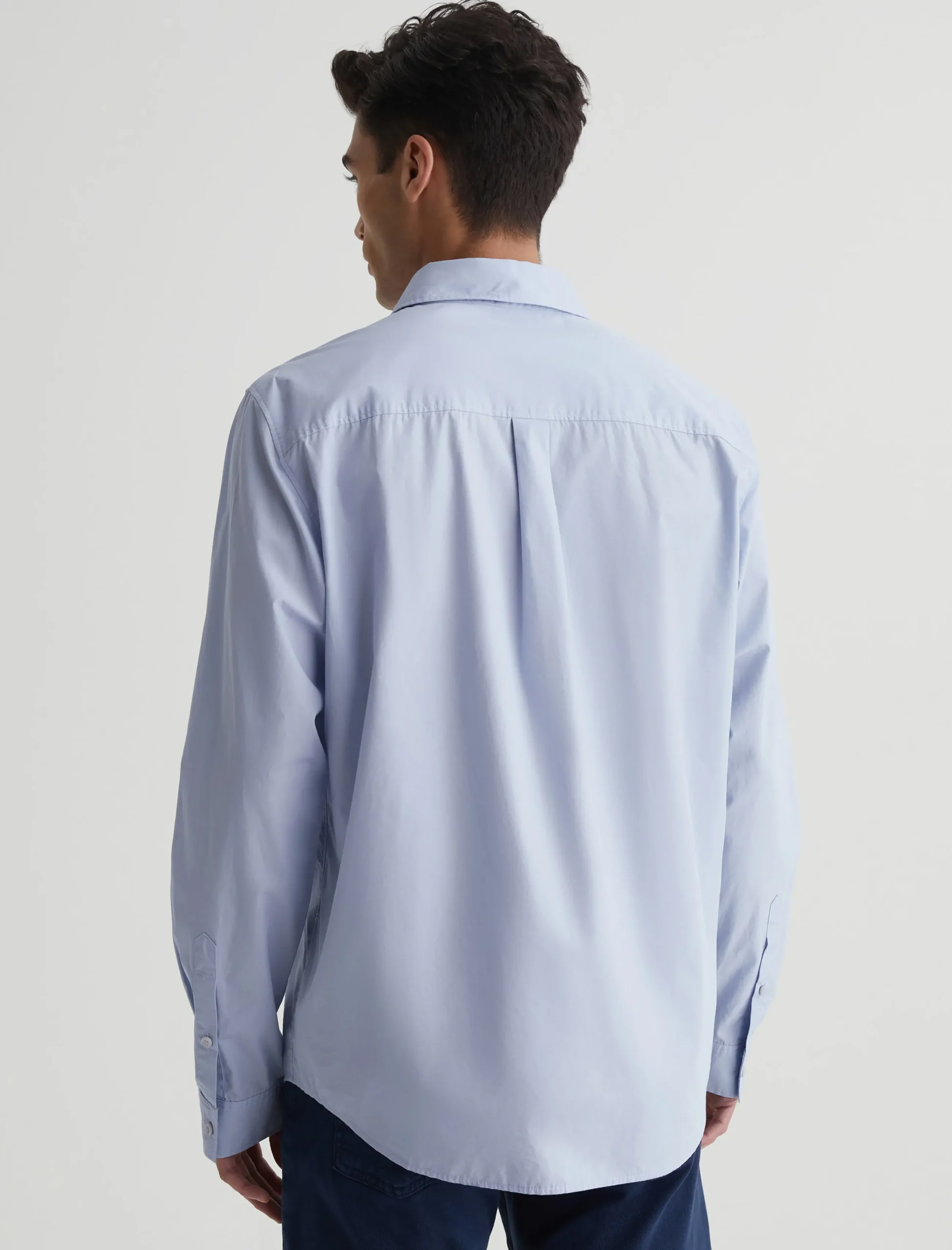 The Aiden Shirt is cut from crisp cotton poplin in a pale blue shade. This men’s shirt is cut for a classic fit with long sleeves, a pointed collar, and buttons down the front placket. It’s got a shirttail hem, plus a single patch pocket at the chest.