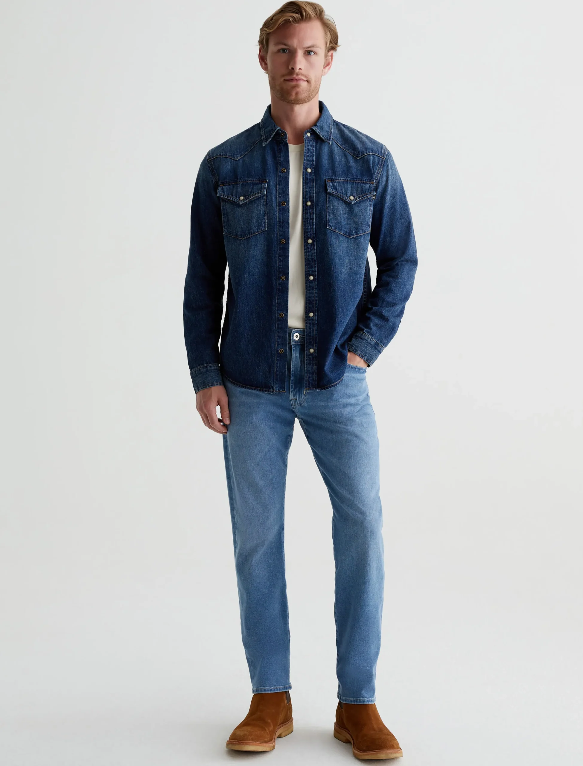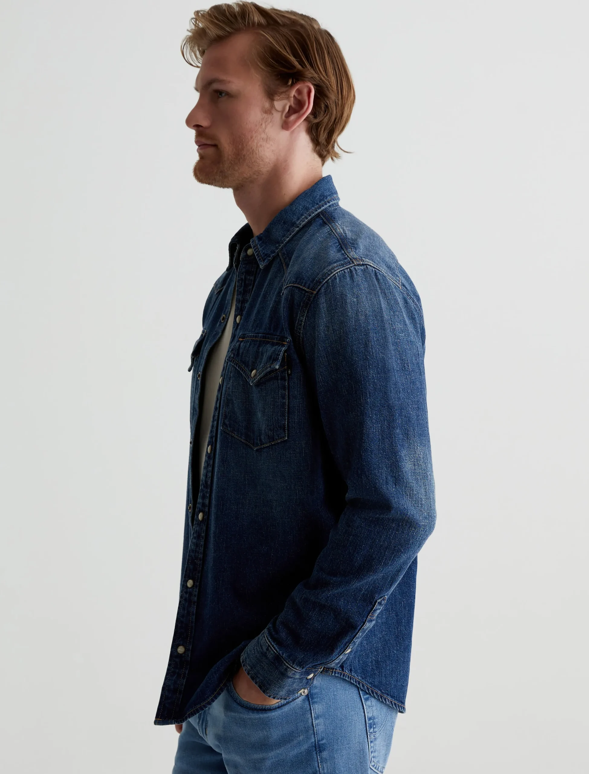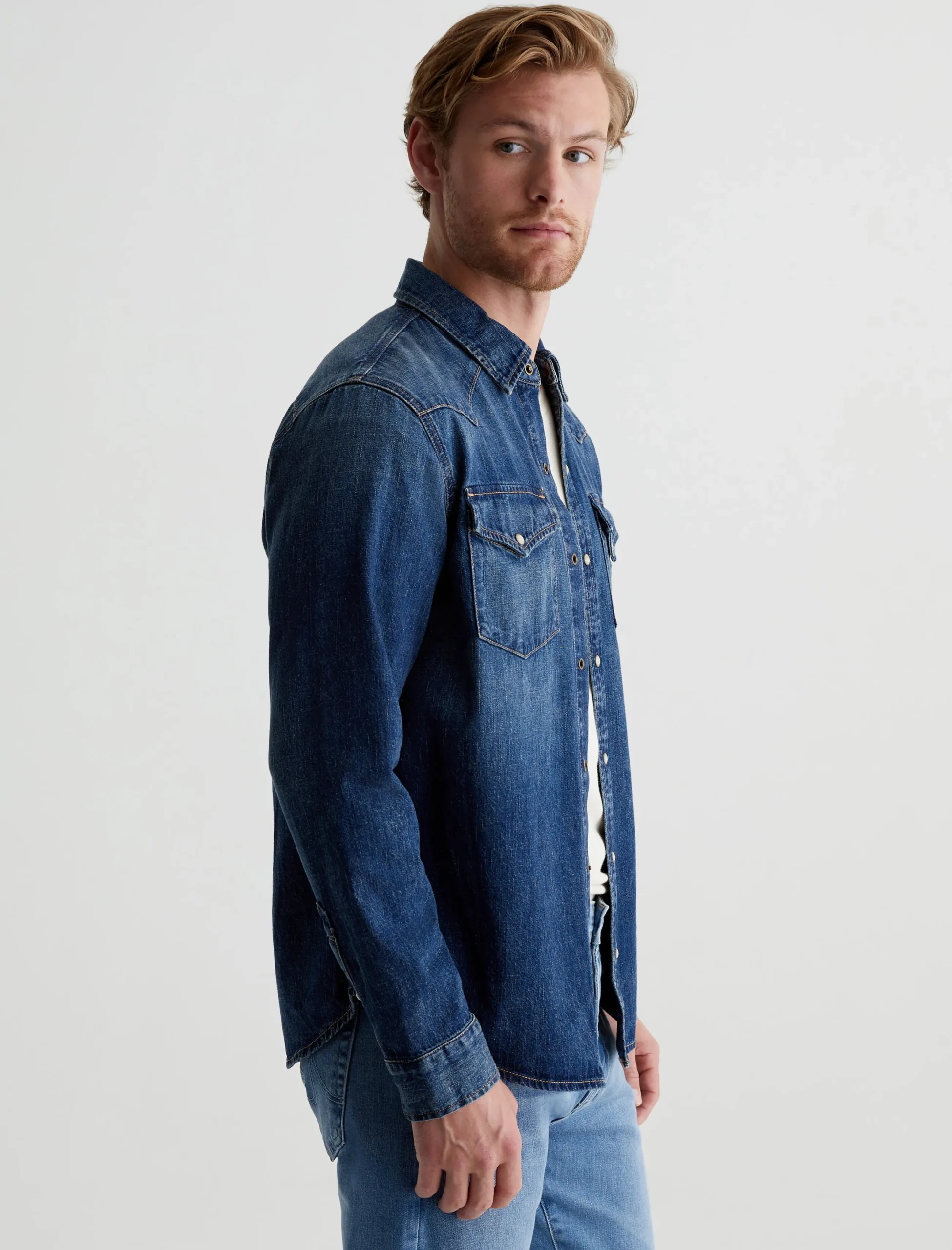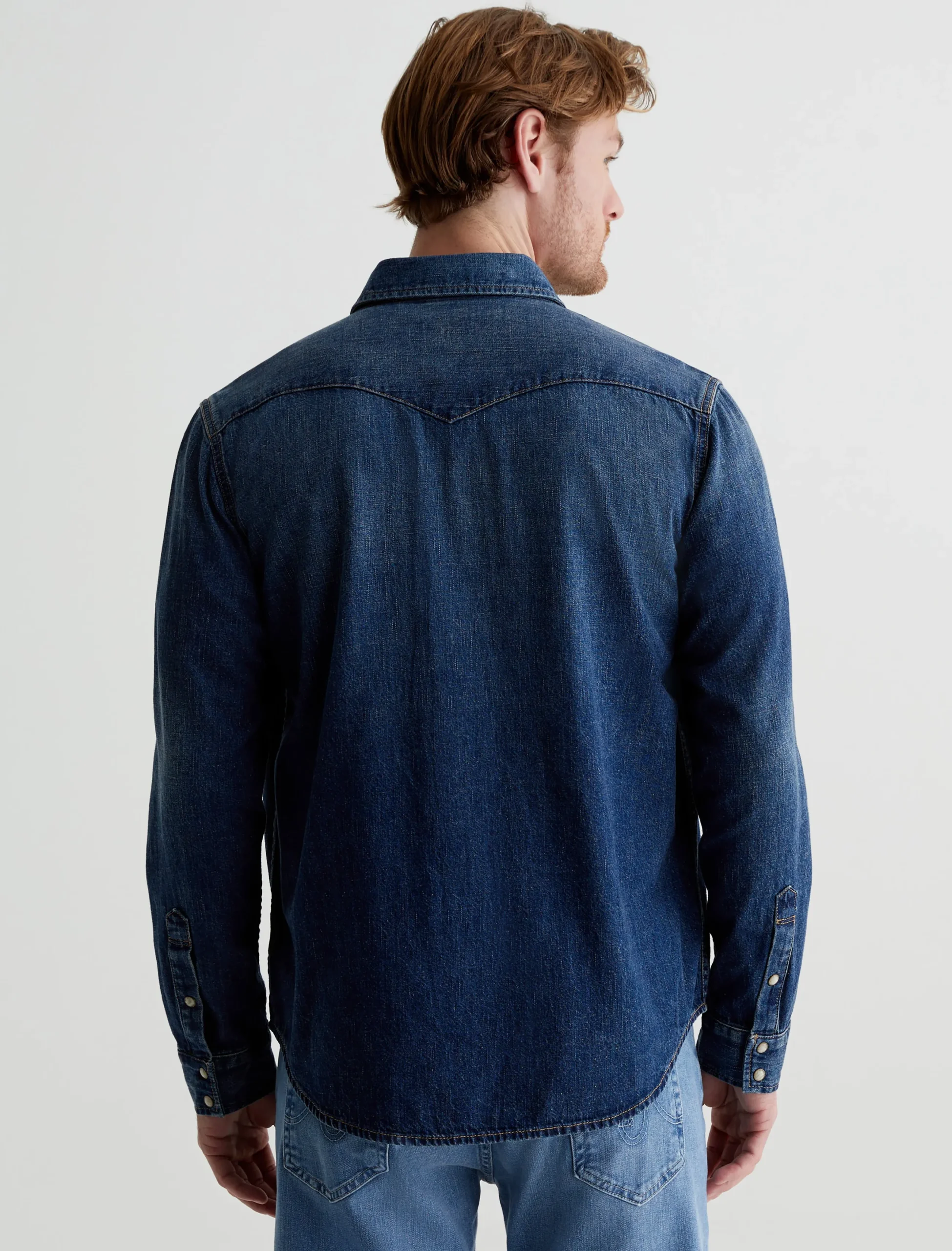 The Aiden Western Shirt for men offers a modern take on vintage Americana style. Made from 100% cotton in a faded indigo wash, this classic denim shirt has angled shoulder panels, flap pockets at the chest, and snap buttons throughout.