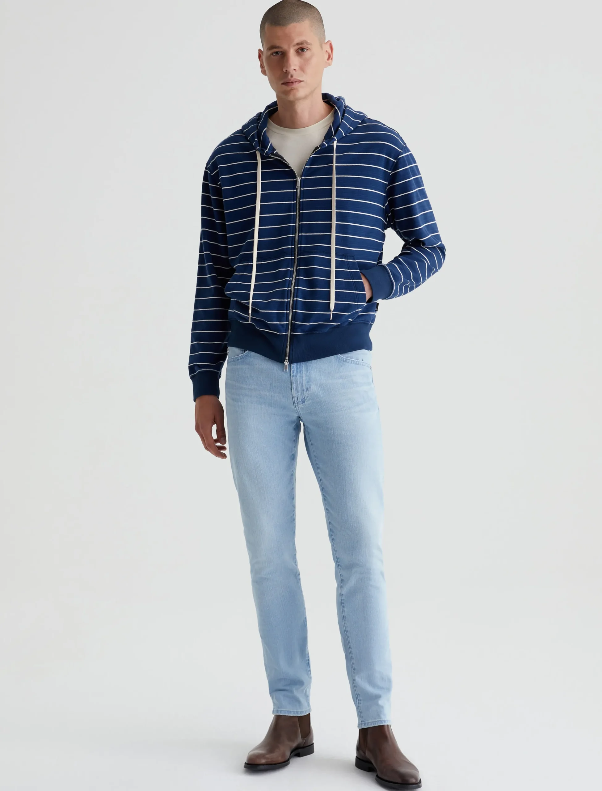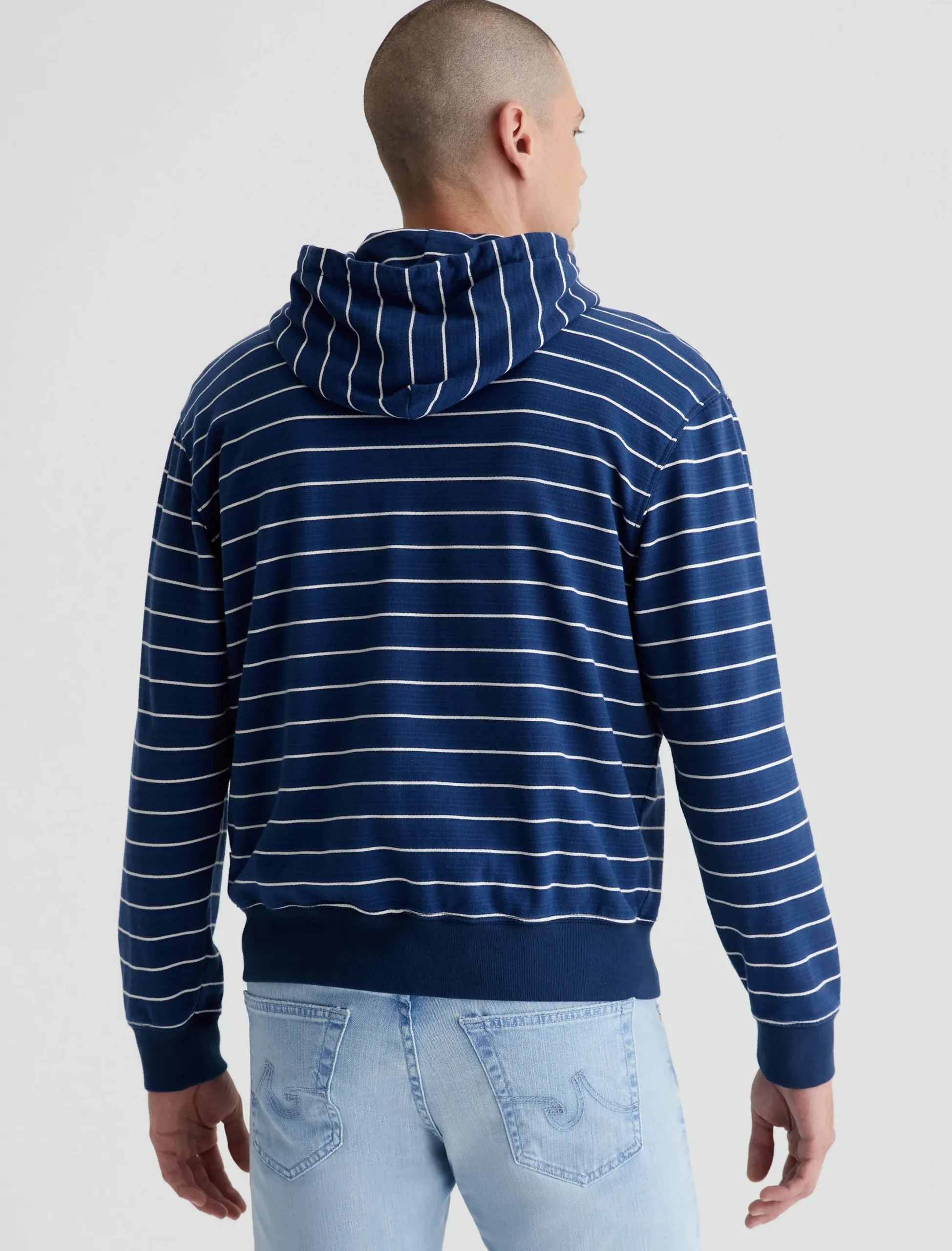The Arc Zip Hoodie features a relaxed fit in 100% cotton French terry. Featuring a navy blue with white stripes, this cozy layer features an adjustable drawstring hood, roomy pockets at the front, and soft banded trim.