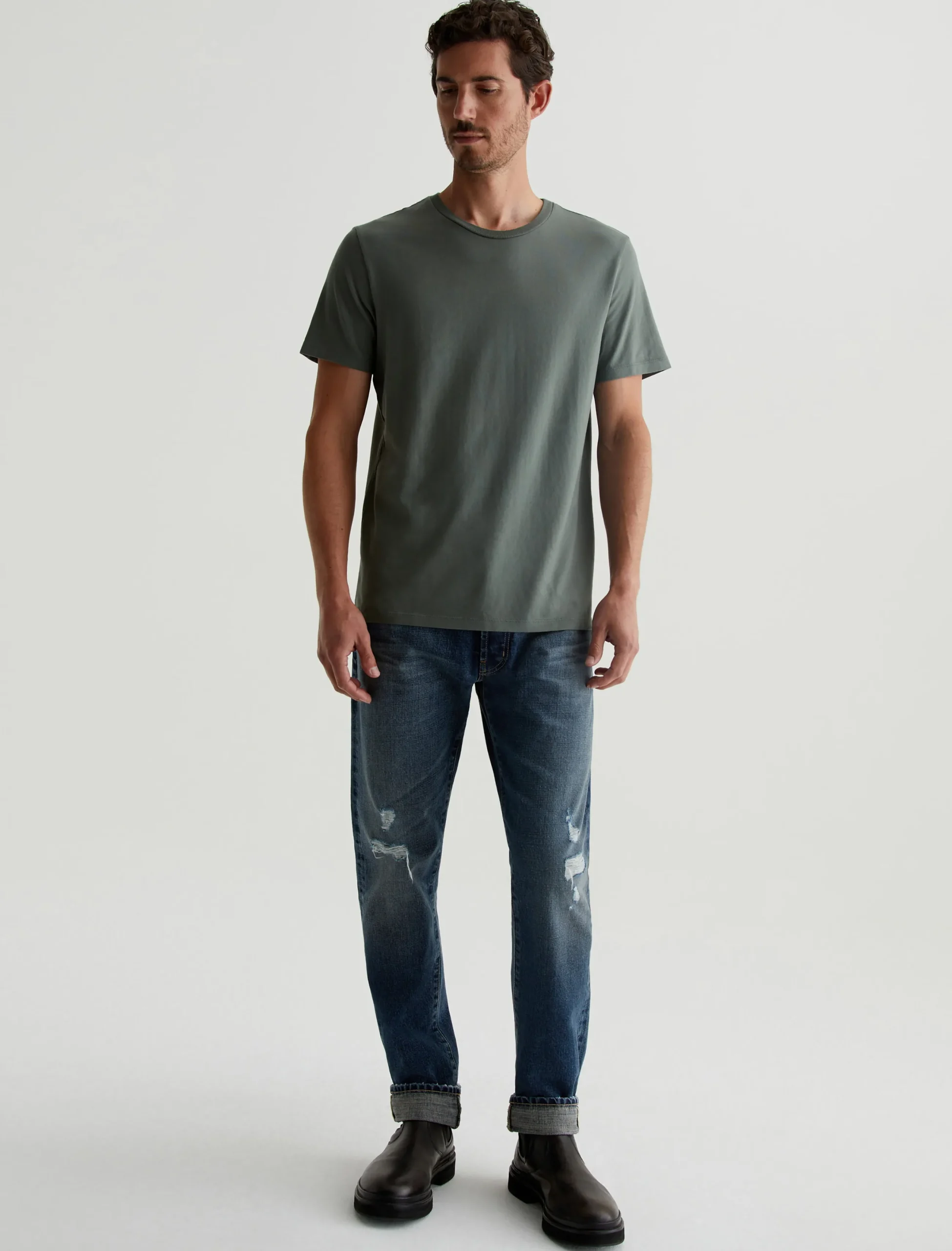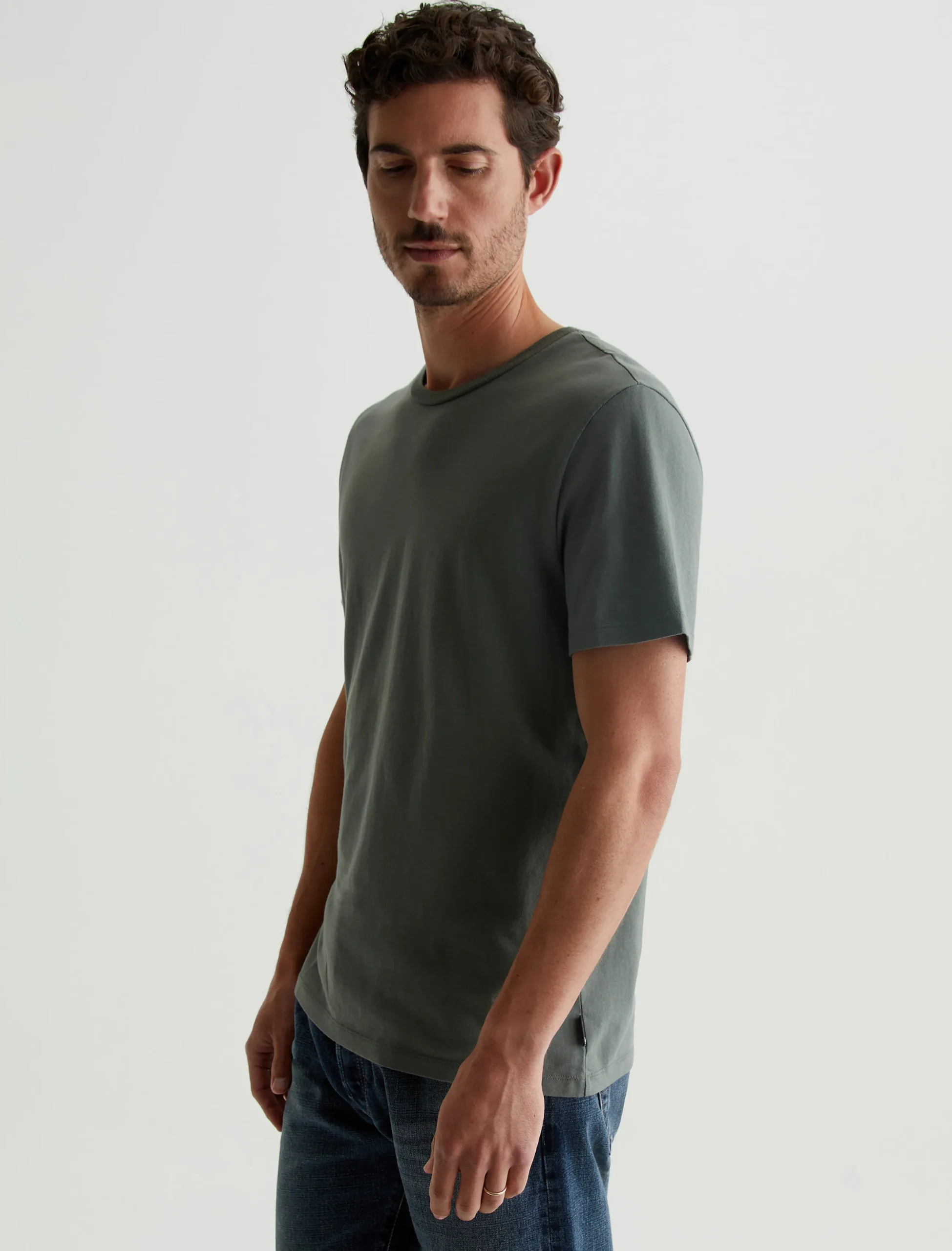 The Bryce Crew in hunter sage is a classic fit crewneck, short sleeve tee. The tee offers a 1X1 baby rib at the neck to create a great crew shape and serves as the perfect base when layering all year long. Our Jersey Knit offers a luxurious comfort that is unrivaled—knitted with both S-twist and Z-twist yarn to sustain longevity and stability, preventing unnecessary twisting and torquing. During the production process, the S-twist yarn is spun counter-clockwise creating a right-handed twill. The Z-twist yarn works in opposition, spinning clockwise for a left-handed twill. This opposition—when working together—yields a softer, more durable fabrication and gives strength to the yarn making it more difficult to pull apart. Designed in 100% Cotton.