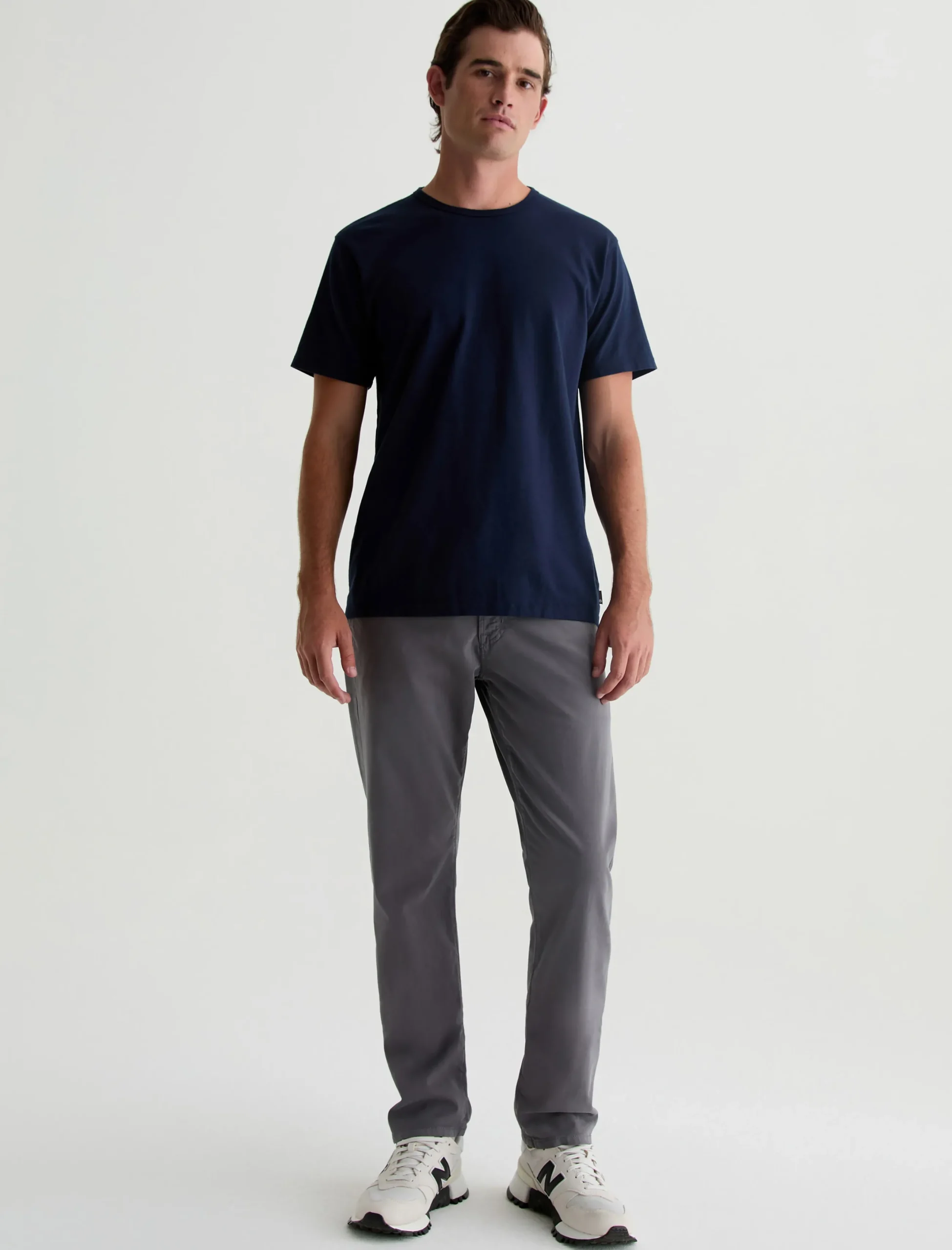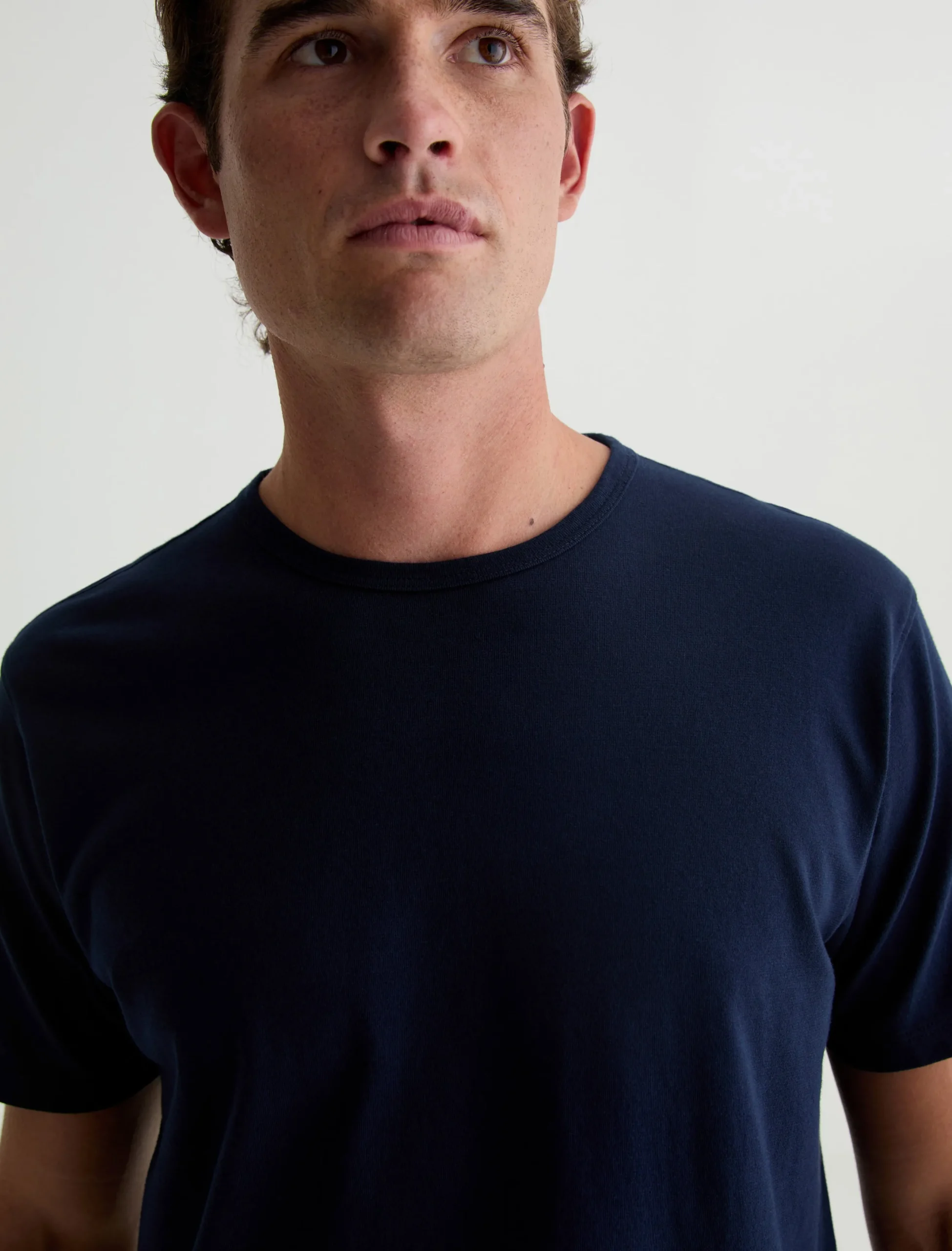 The Bryce Crew in deep navy is a classic fit crewneck, short sleeve tee. The tee offers a 1X1 baby rib at the neck to create a great crew shape and serves as the perfect base when layering all year long. Our Jersey Knit offers a luxurious comfort that is unrivaled—knitted with both S-twist and Z-twist yarn to sustain longevity and stability, preventing unnecessary twisting and torquing. During the production process, the S-twist yarn is spun counter-clockwise creating a right-handed twill. The Z-twist yarn works in opposition, spinning clockwise for a left-handed twill. This opposition—when working together—yields a softer, more durable fabrication and gives strength to the yarn making it more difficult to pull apart. Designed in 100% Cotton.