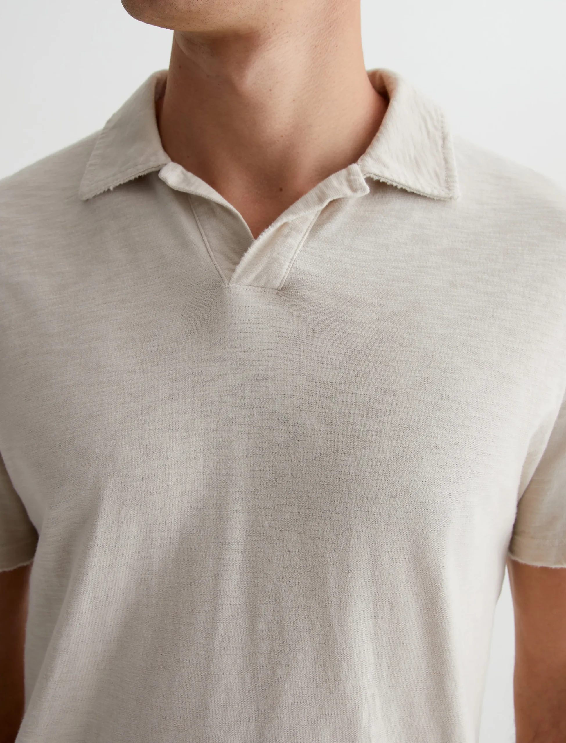The Bryce Johnny Collar shirt is a classic short-sleeve polo tee with a relaxed neckline and pointed collar. Made from our Luxe Slub Jersey in pale beige, this style has a subtle texture and lived-in character thanks to a touch of distressing at the edges. It’s knitted with both S-twist and Z-twist yarns to sustain longevity and stability, preventing twisting and torquing. The result is a softer, more durable fabric.