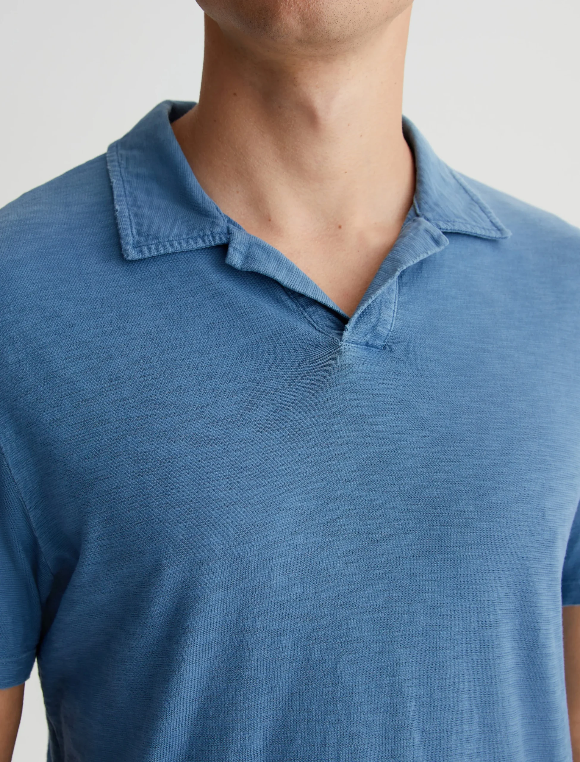 The Bryce Johnny Collar shirt is a classic short-sleeve polo tee with a relaxed neckline and pointed collar. Made from our Luxe Slub Jersey in a faded blue shade, this style has a subtle texture and lived-in character thanks to a touch of distressing at the edges. It’s knitted with both S-twist and Z-twist yarns to sustain longevity and stability, preventing twisting and torquing. The result is a softer, more durable fabric.
