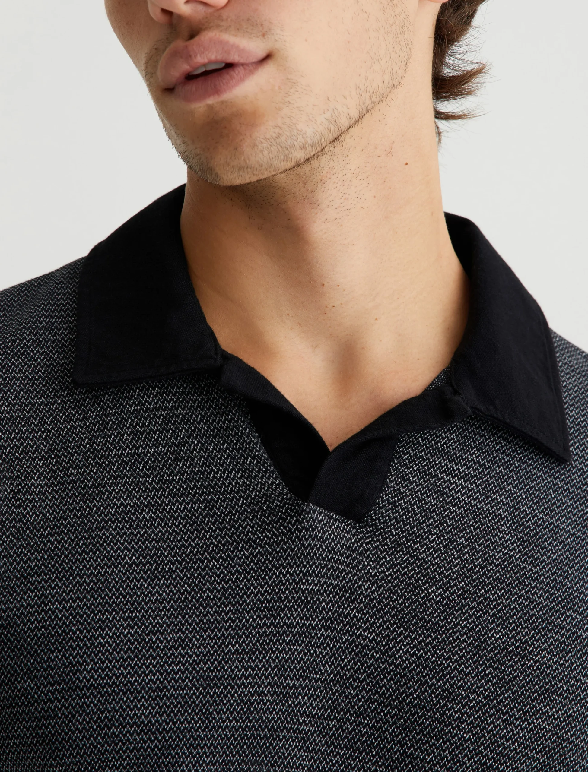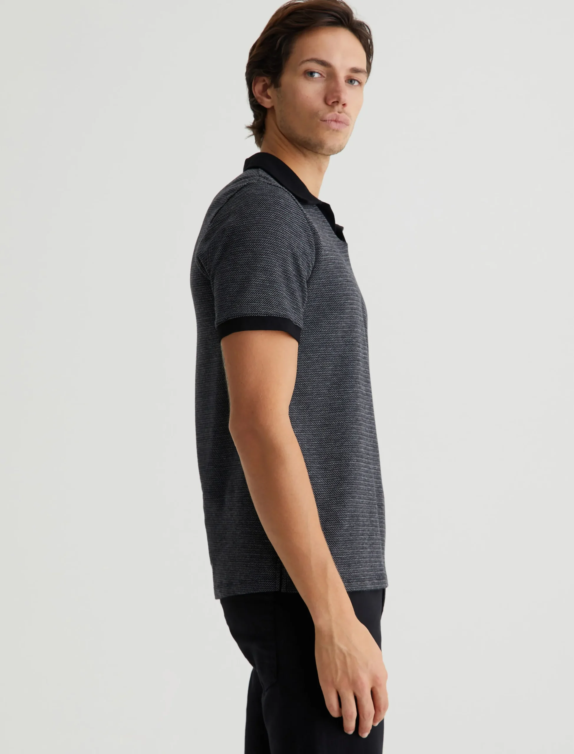 The Bryce Johnny Collar shirt is a classic short-sleeve polo tee with a relaxed neckline and pointed collar. Elevated by our Luxe Heavy Jacquard in black, it’s got a delicate chevron pattern accented by solid trim.
