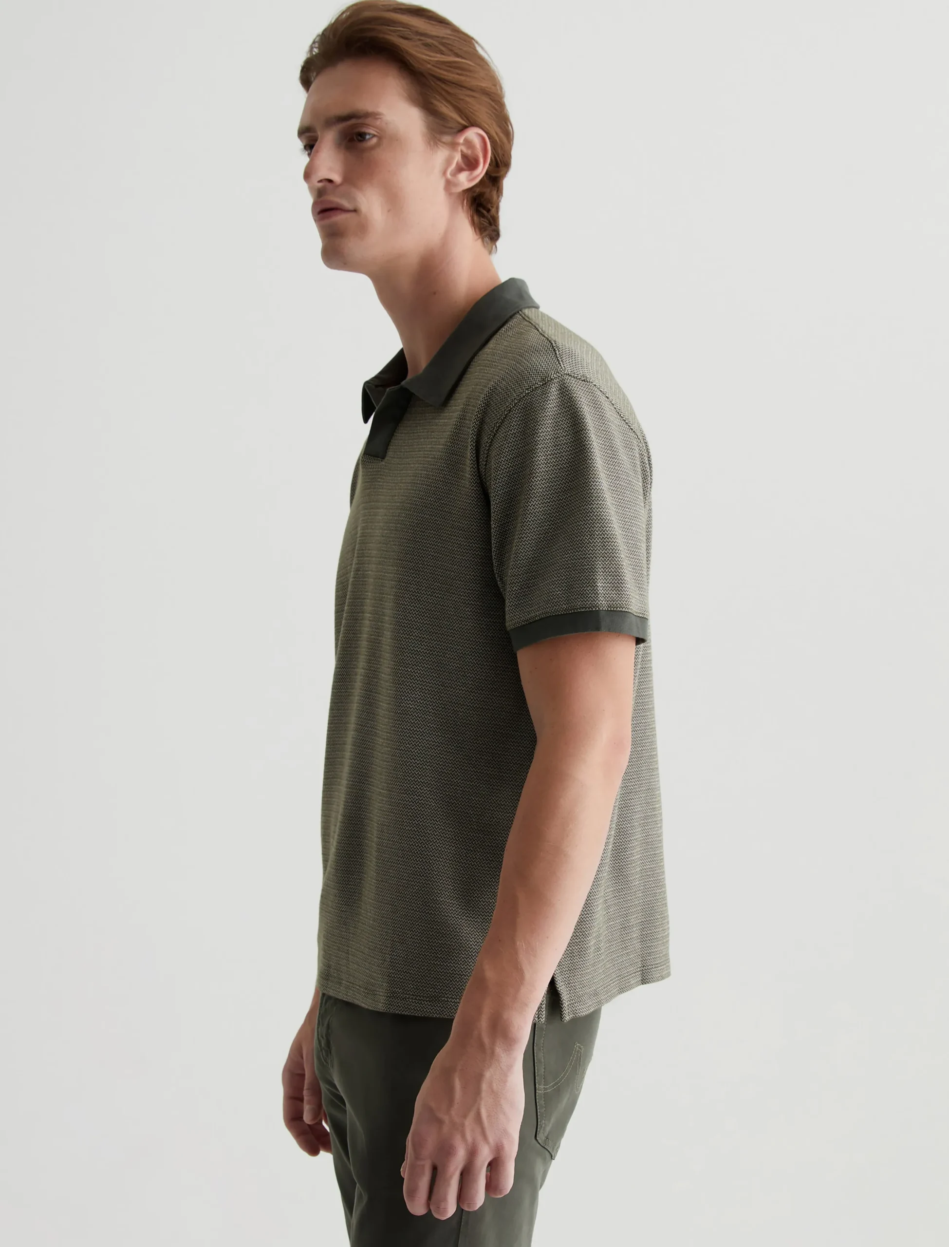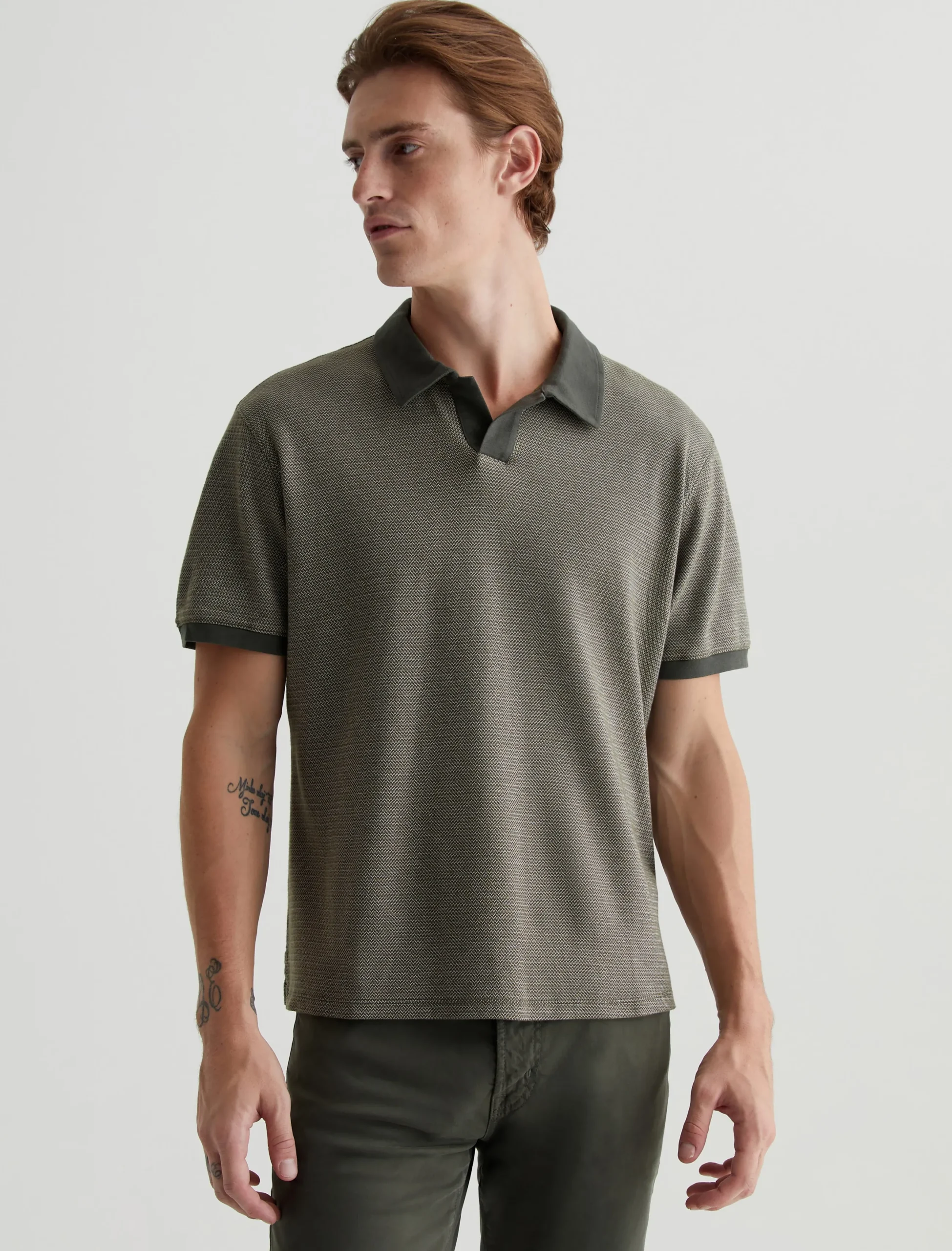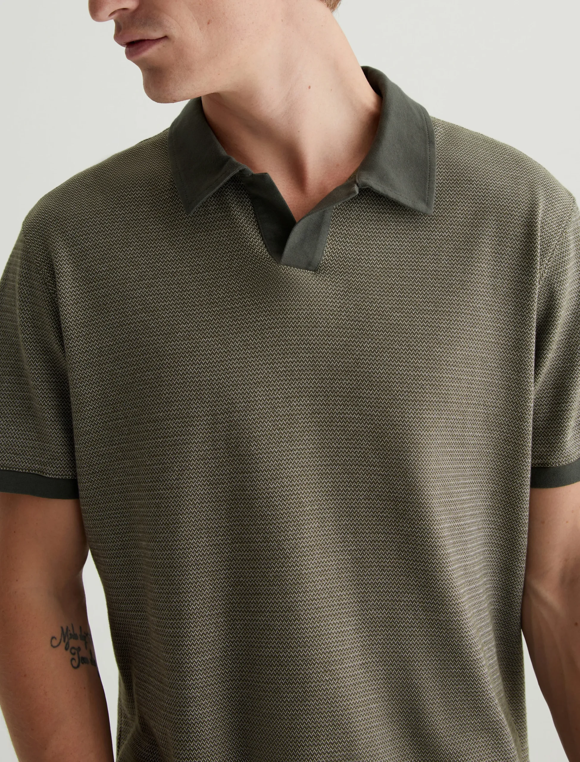The Bryce Johnny Collar shirt is a classic short-sleeve polo tee with a relaxed neckline and pointed collar. Updated in our Luxe Heavy Jacquard, it’s got a delicate chevron pattern accented by solid trim.
