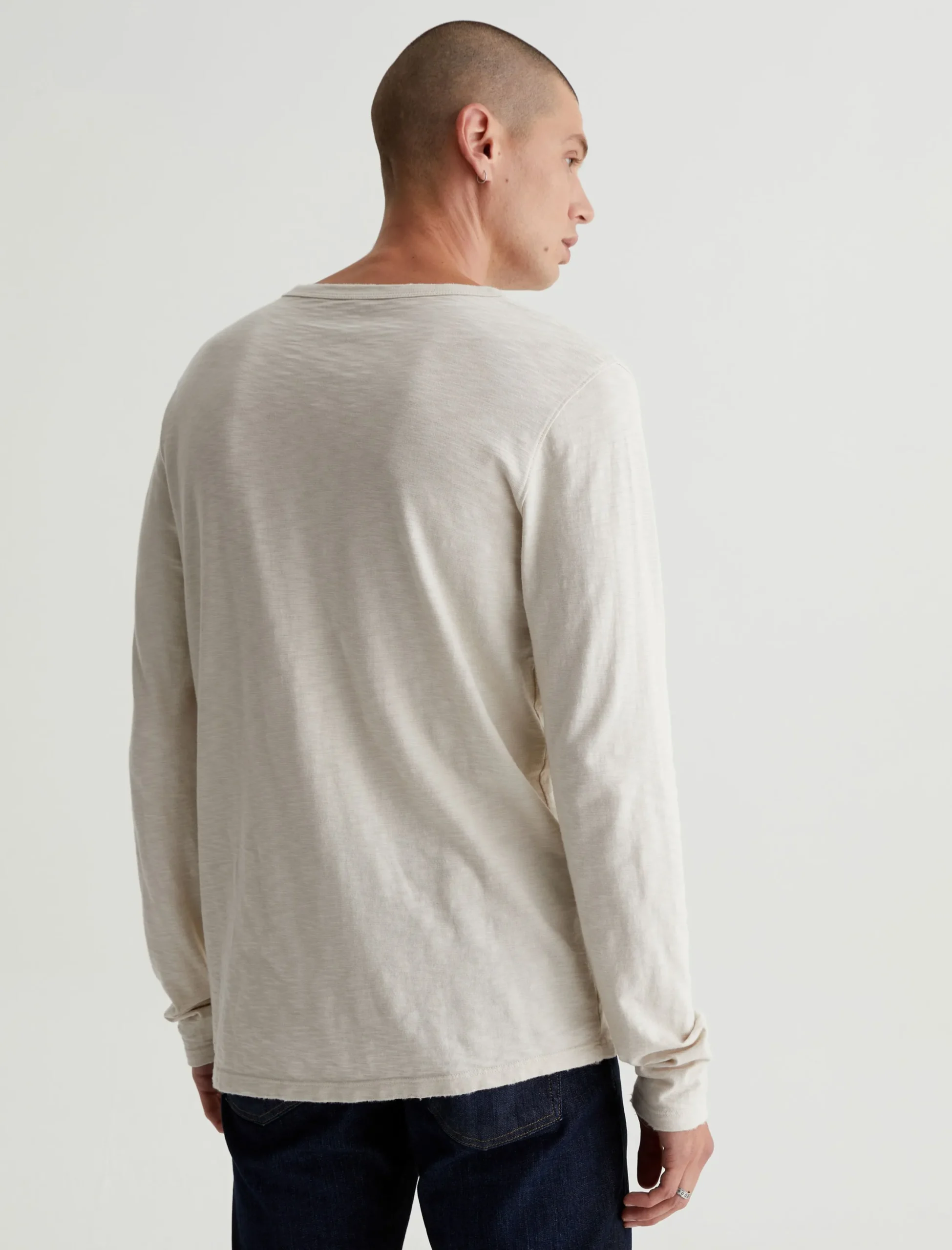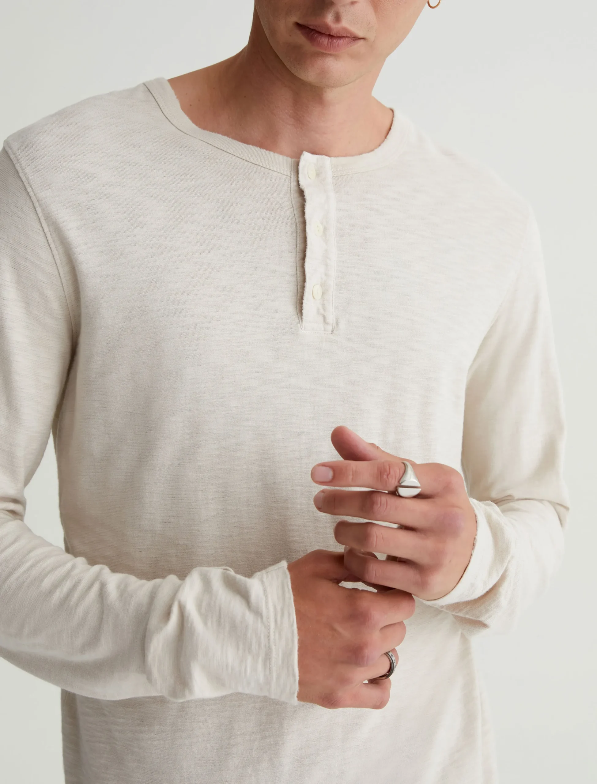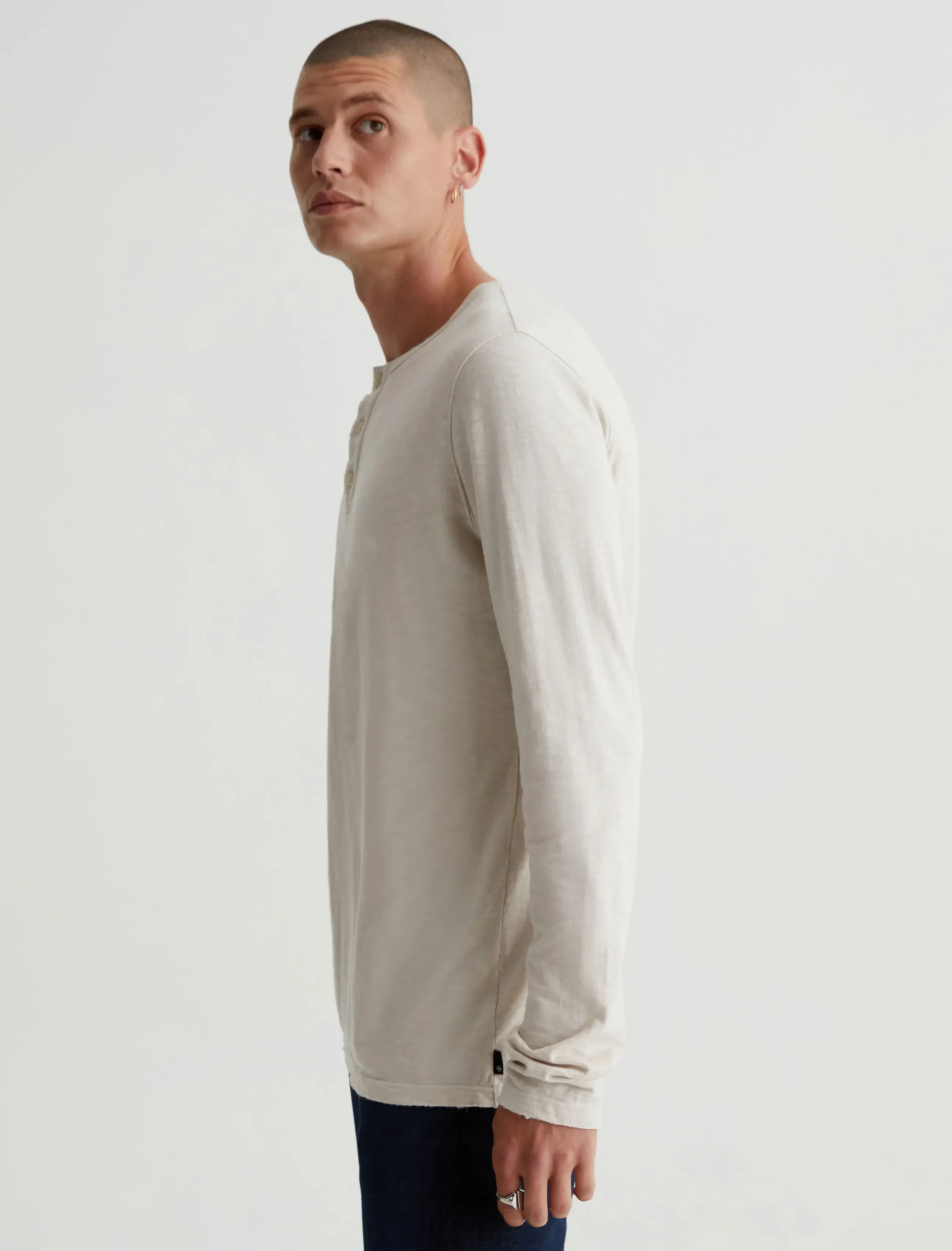 The Bryce Long Sleeve Henley is a true classic you can wear in any season. Done in a pale beige shade, our staple long-sleeve henley has a crew neckline with a 3-button placket, plus lightly distressed edges for a lived-in character. This essential style is crafted from 100% cotton Luxe Slub Jersey featuring S-twist and Z-twist yarns for soft yet durable construction that resists unnecessary twisting and torquing.