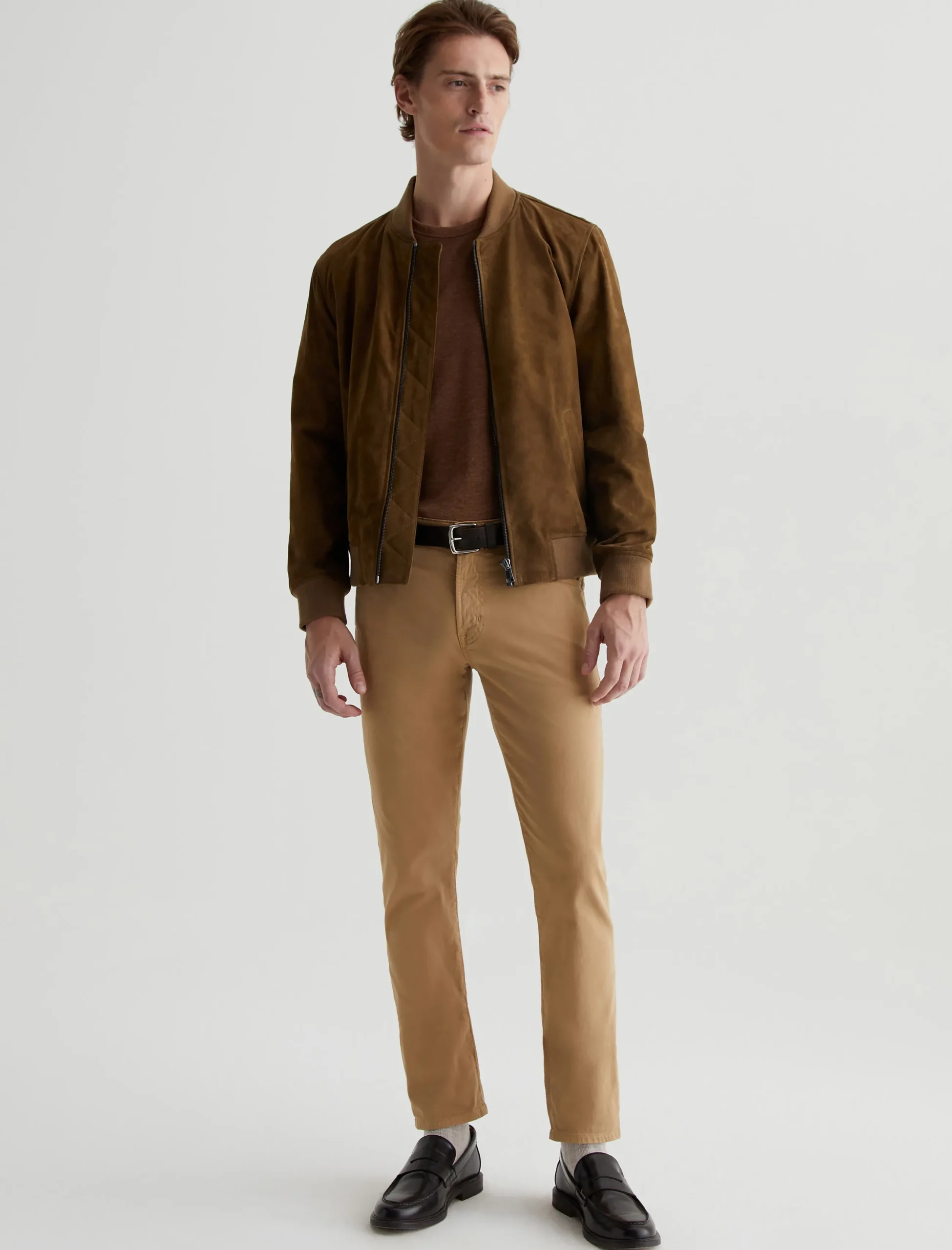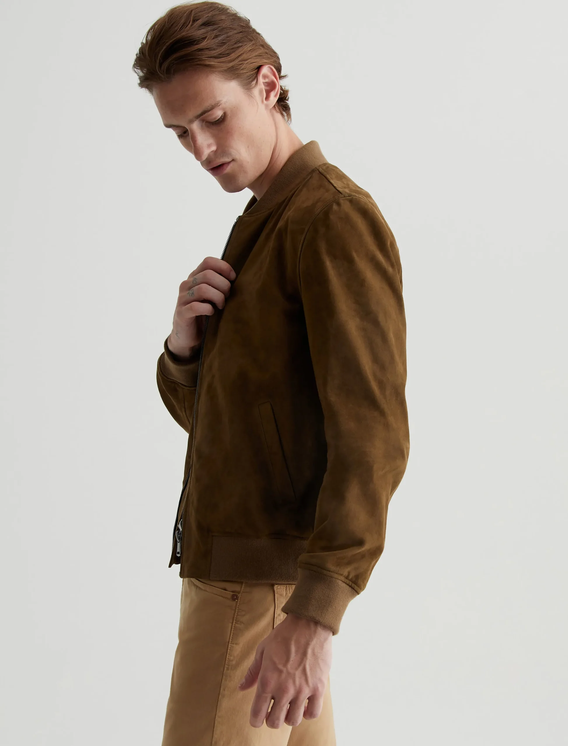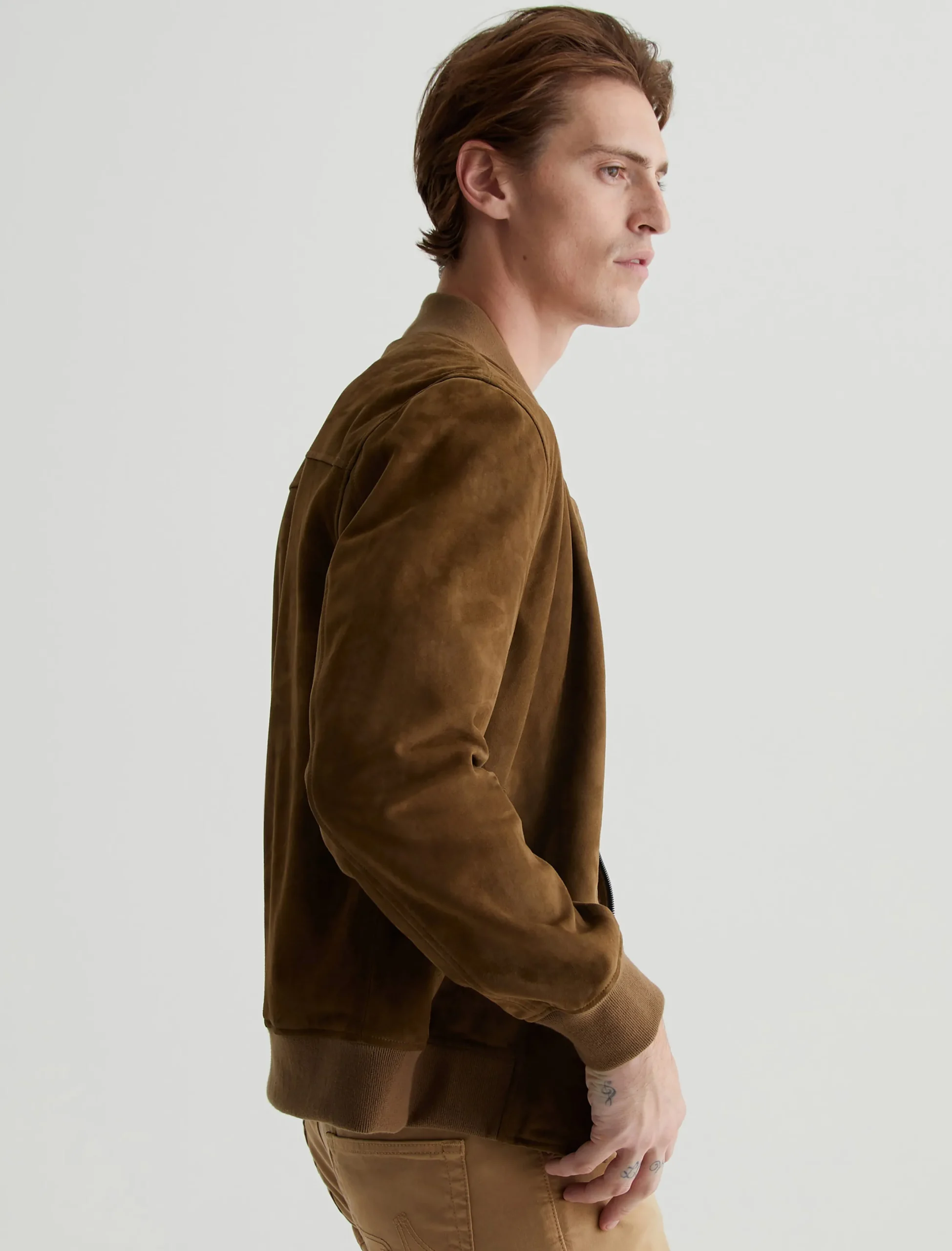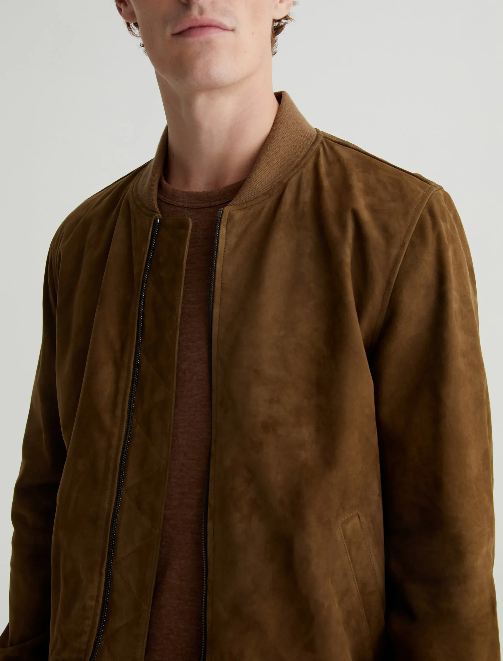 The Dayton Bomber jacket is a classic outer layer with a refined aesthetic. Simple yet luxurious, this men’s jacket comes in a timeless brown shade and features rib trim at the collar, cuffs, and waistband.