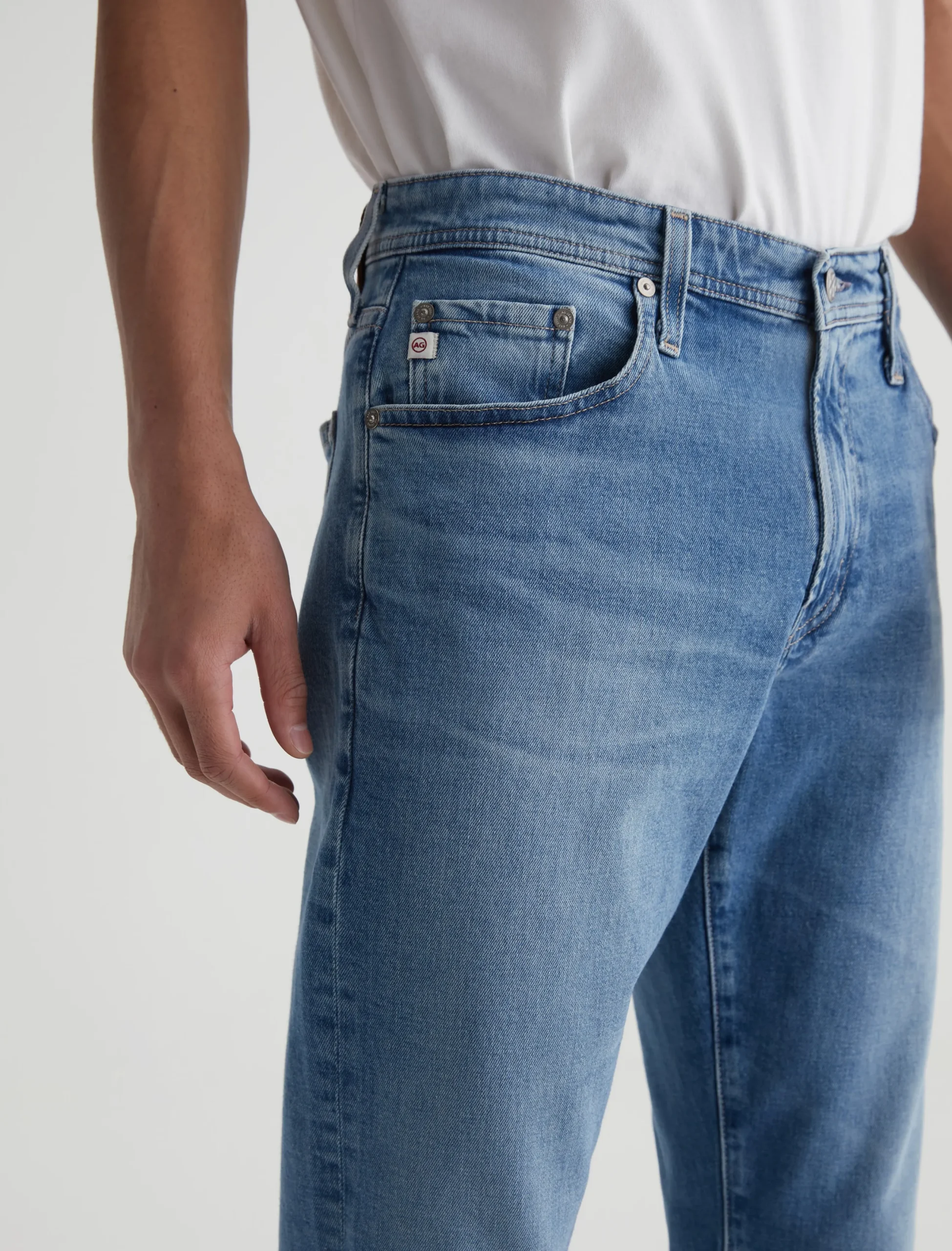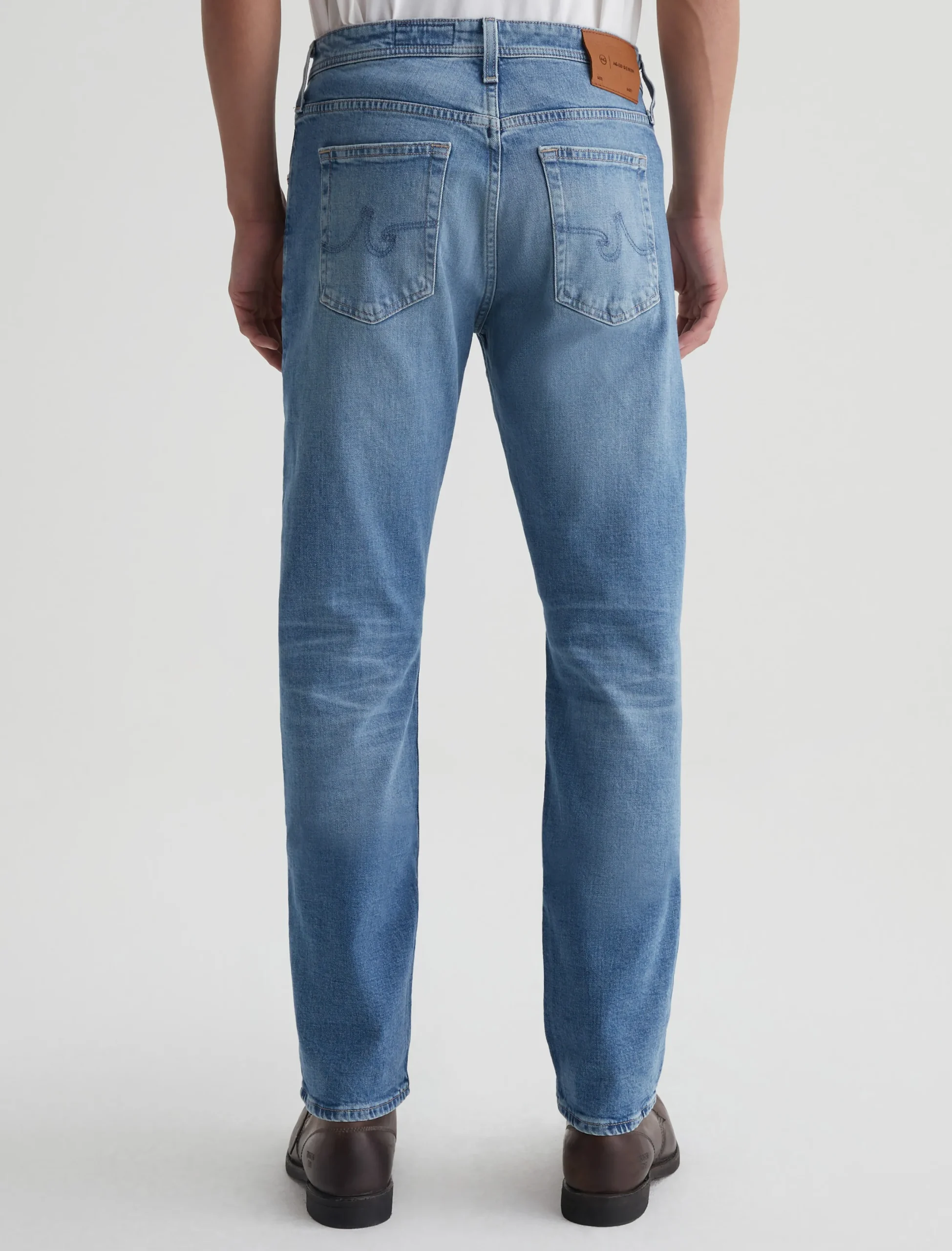 Everett is a slim straight fit crafted from 11 oz. Journey Denim in a light blue wash with an AG-ed™ 19-year fade. The style has a mid-rise waist and a straight fit that’s relaxed from hip to knee before slightly tapering at the leg opening. These five-pocket men’s jeans feature the perfect amount of stretch for comfortable wear.