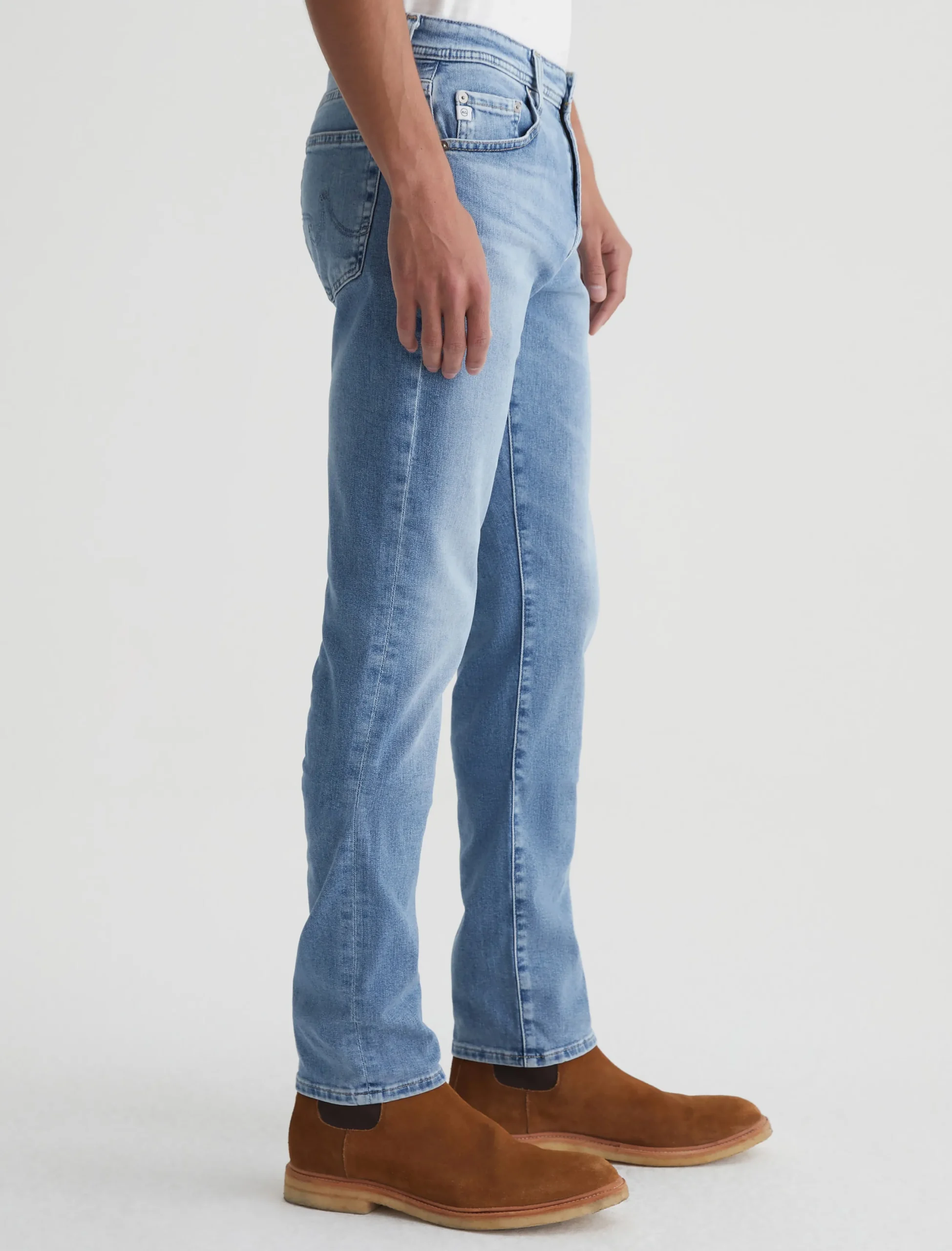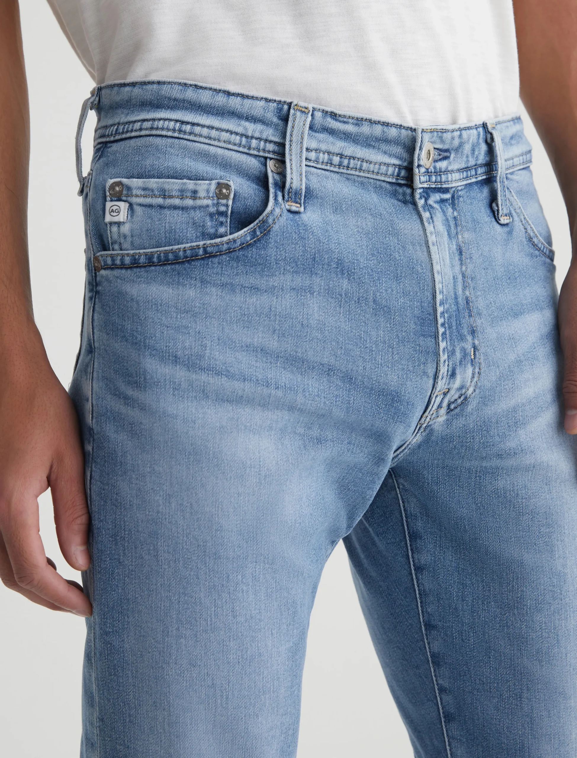 Everett is a slim straight jean for men, done here in a medium indigo wash with heavy fading. The style has a comfortable mid-rise waist and a straight fit that’s relaxed from hip to the knee before slightly tapering at the leg opening. Made from our exclusive AG Cloud Soft Denim™, this men’s slim straight jean is designed in 9.4 oz. Hyper Soft Indigo Denim, our special left-hand twill fabric that allows the yarns to gently relax and untwist for a supple feel that gets even softer with wear. It’s got dual-elastic performance fibers built in for added stretch and recovery.